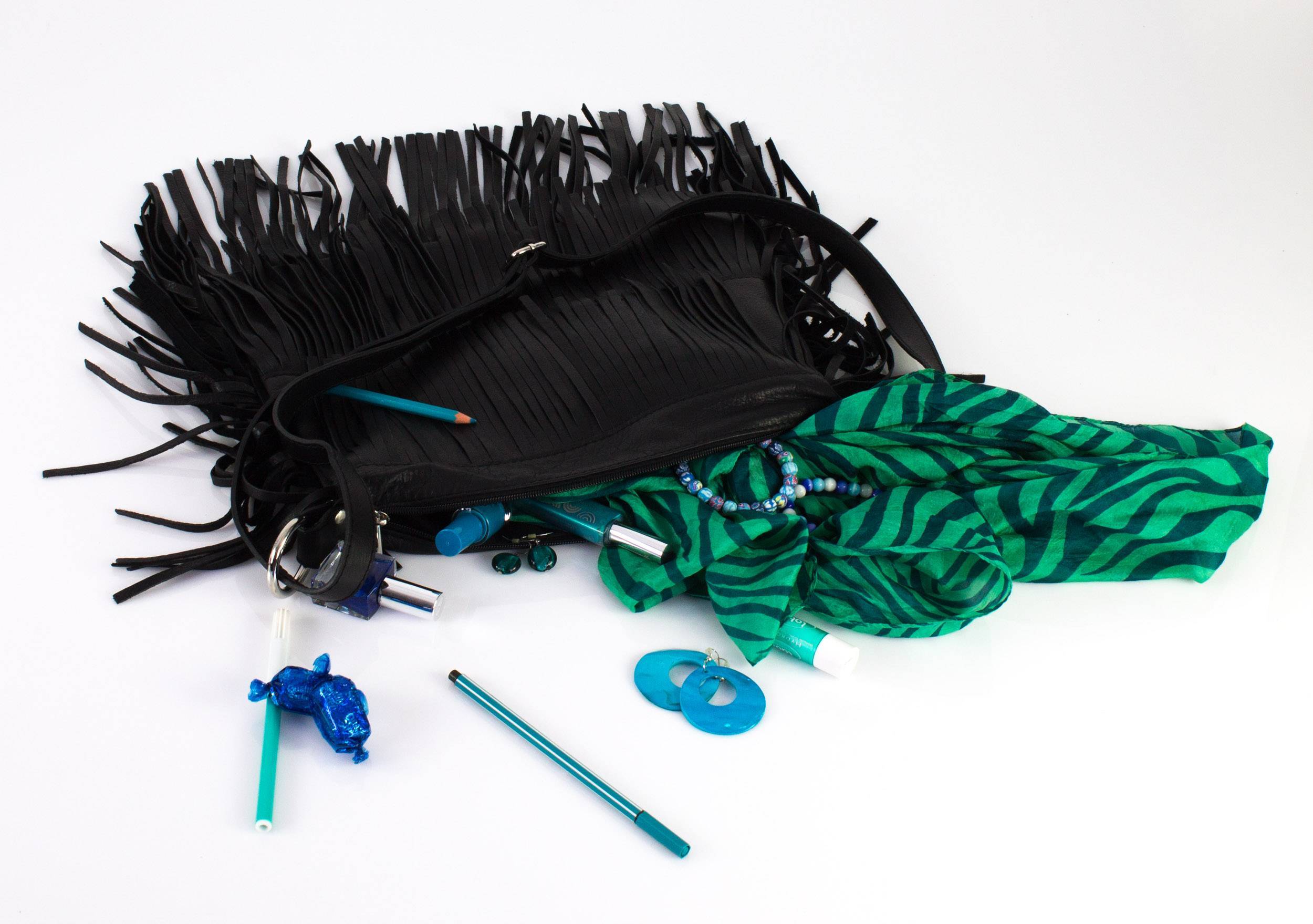 - Materiale esterno in vera pelle di colore blu scuro con molte frange in pelle sul lato e davanti; materiale interno in tessuto di colore nero