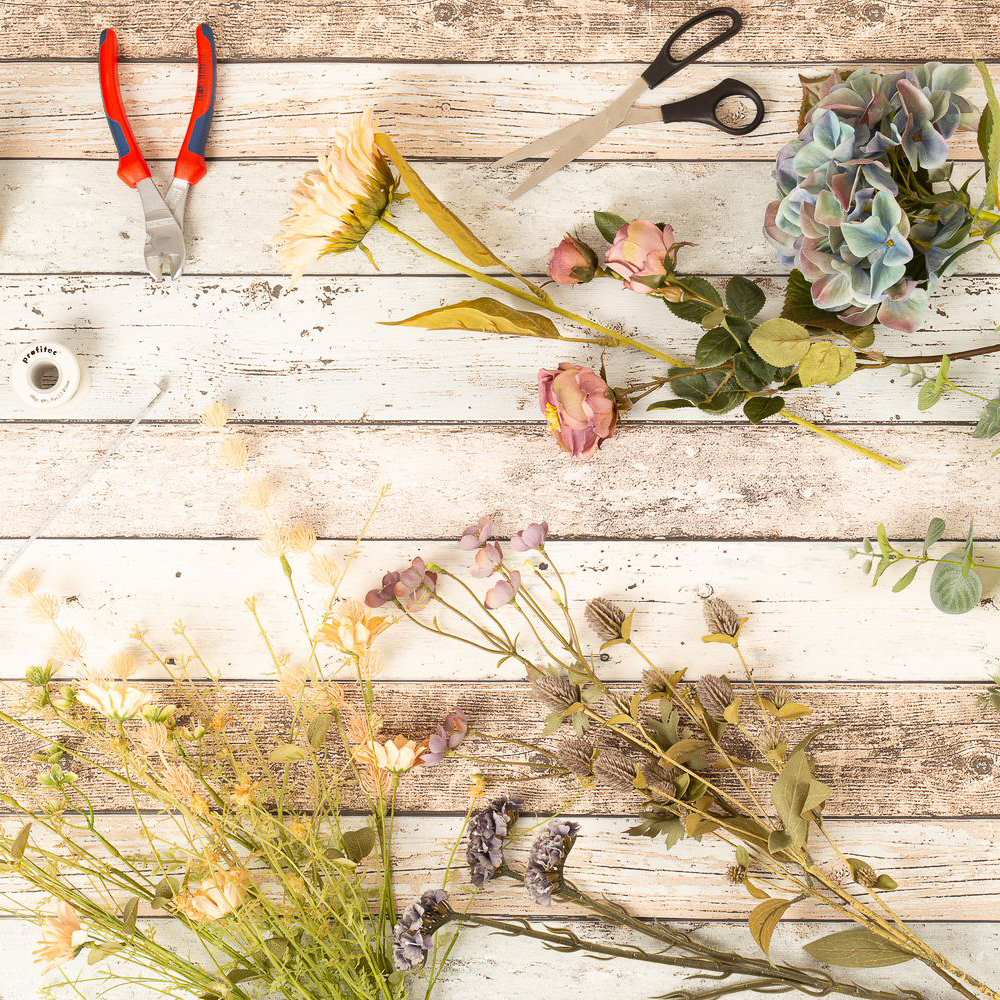 - Legata con un cordoncino di sisal, i fiori e i rami possono essere accorciati individualmente o, dopo aver rimosso il cordoncino, utilizzati singolarmente per progetti creativi