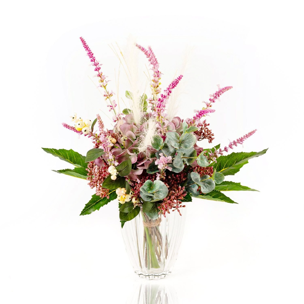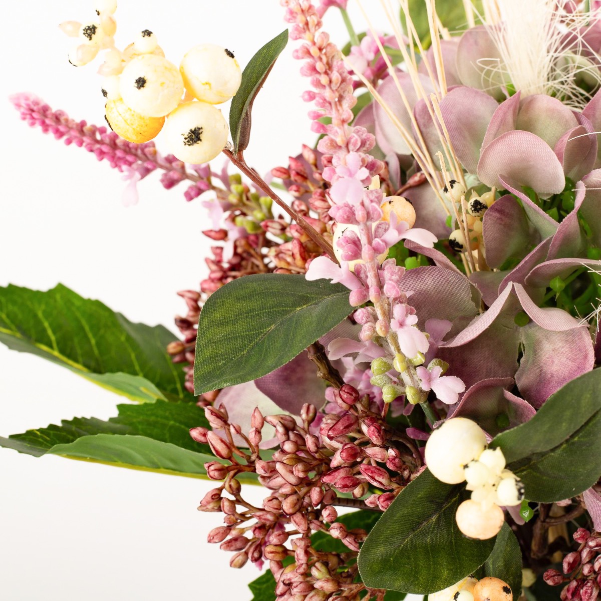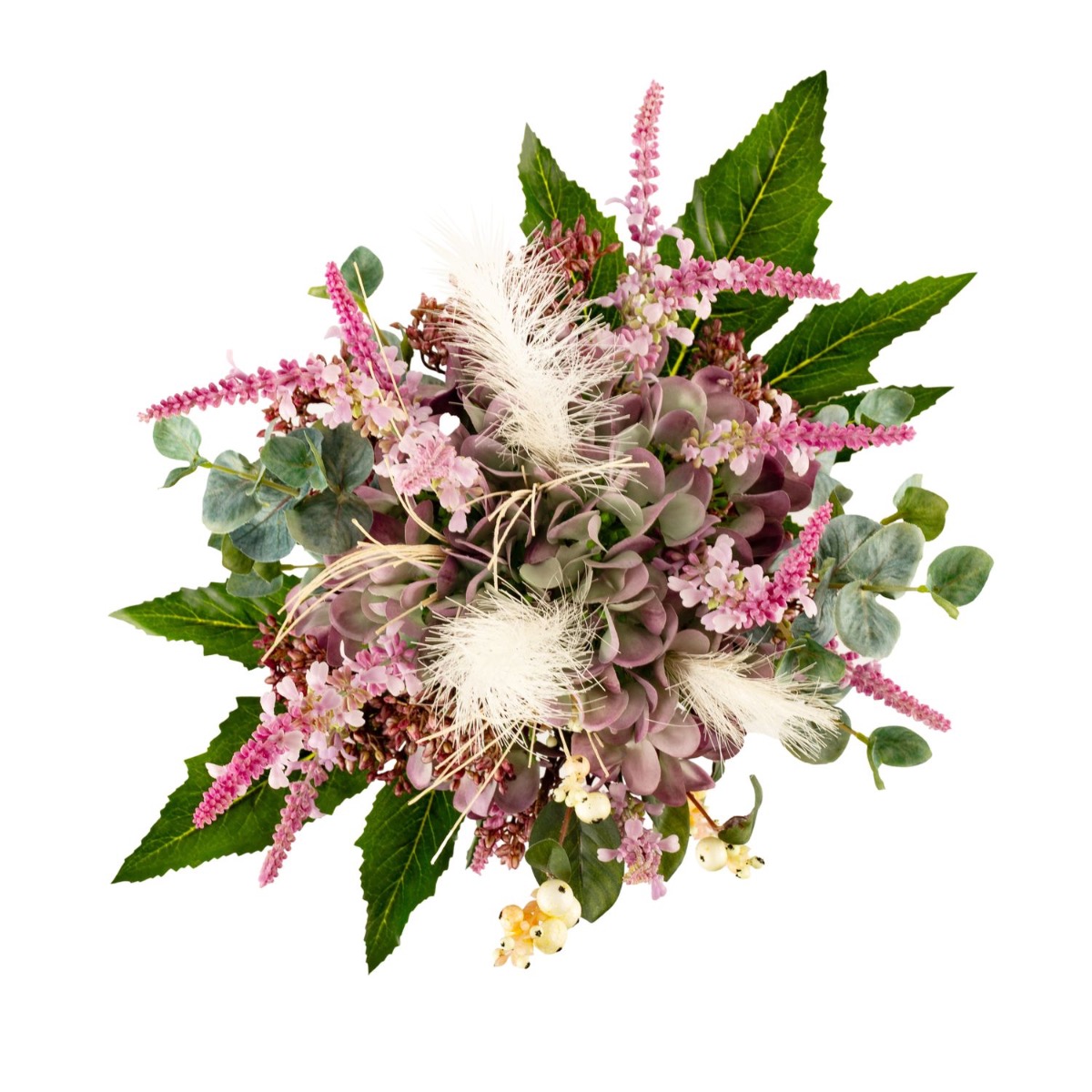 - Composizione floreale artificiale legata a mano composta da ortensia, viburnum, erica, sinforicarpi, eucalipto, erba lampone e aralia in colore viola-rosa-verde