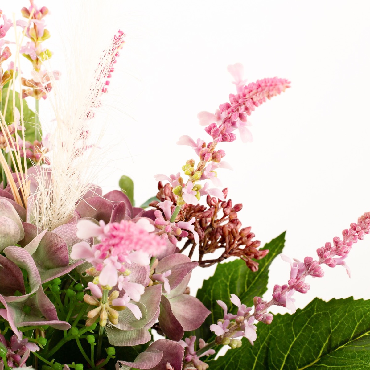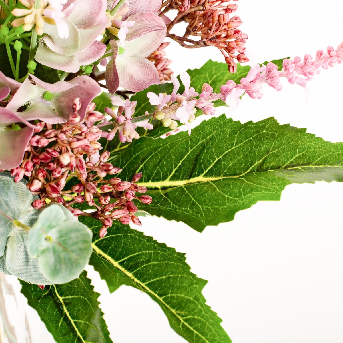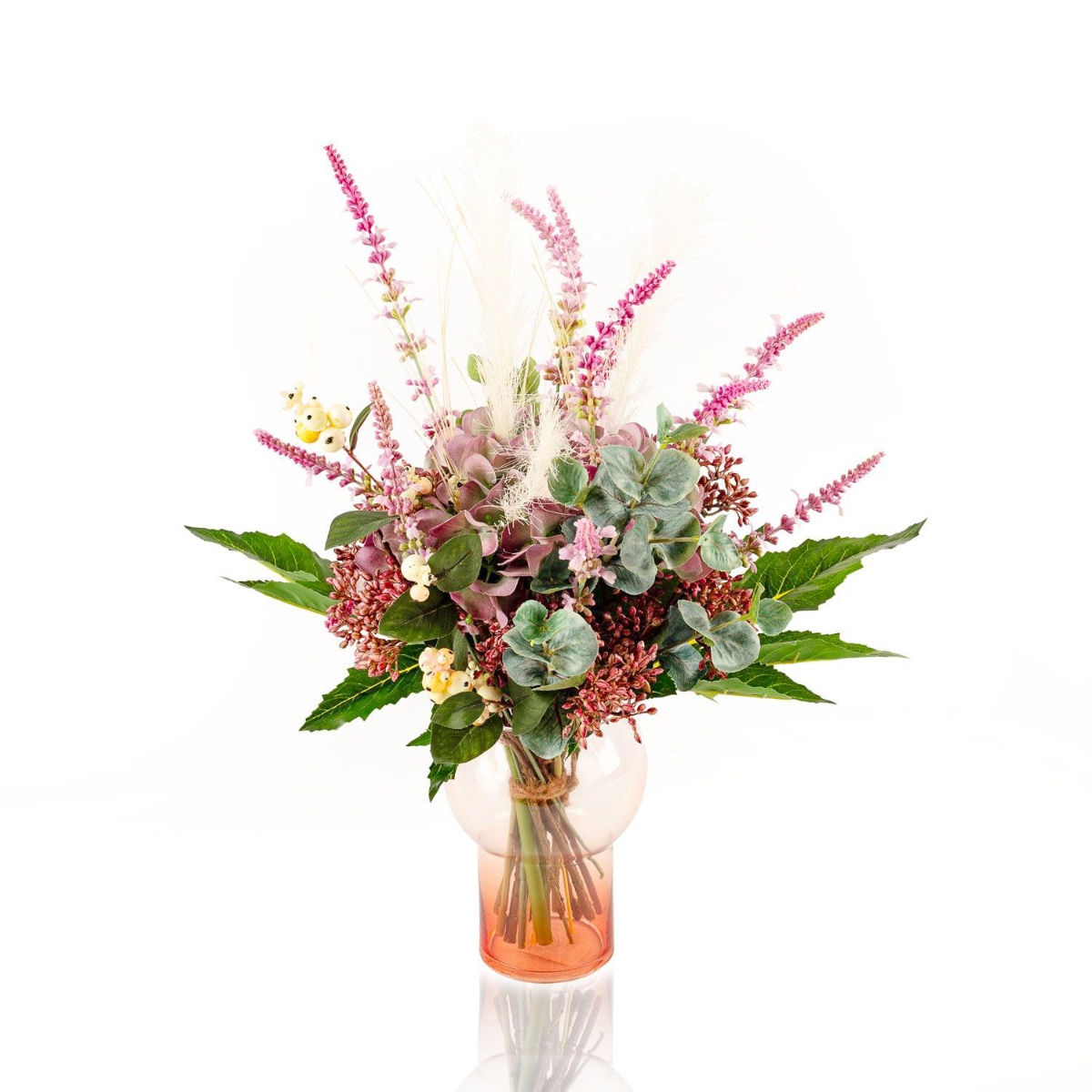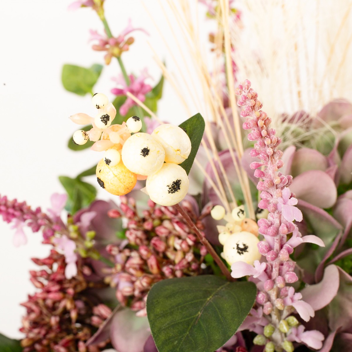 - Composizione floreale artificiale legata a mano composta da ortensia, viburnum, erica, sinforicarpi, eucalipto, erba lampone e aralia in colore viola-rosa-verde