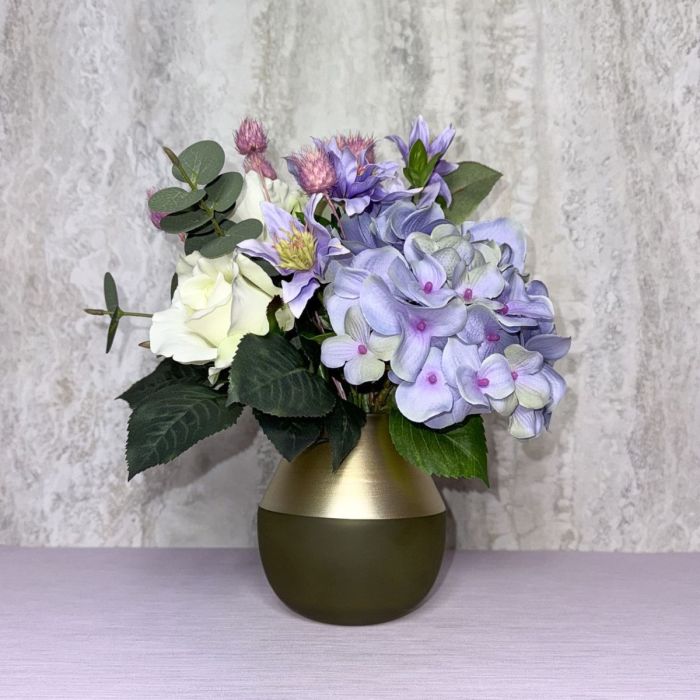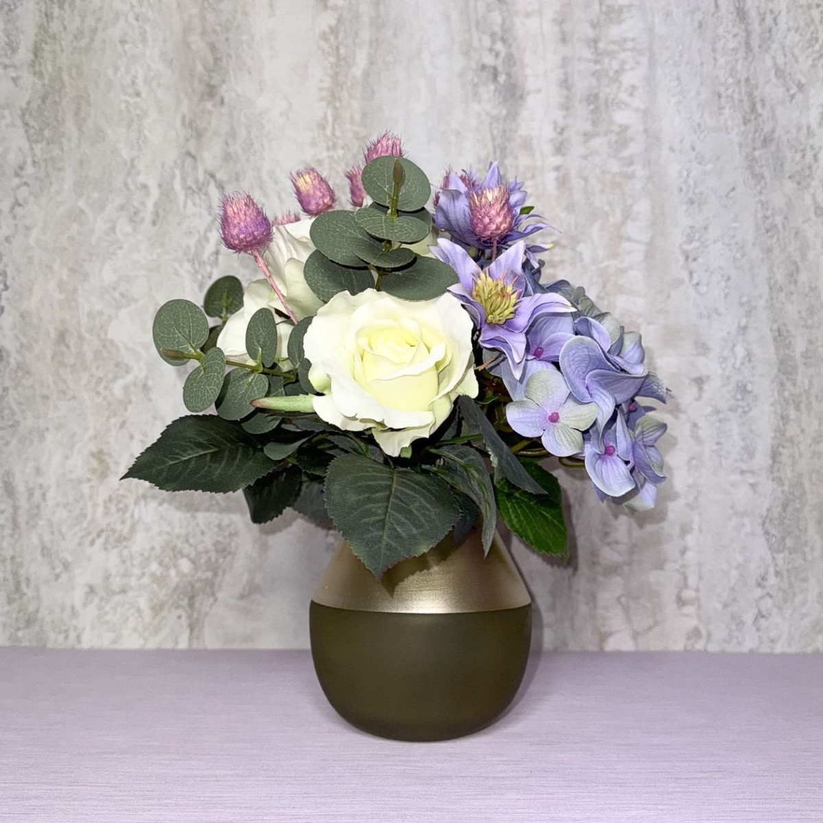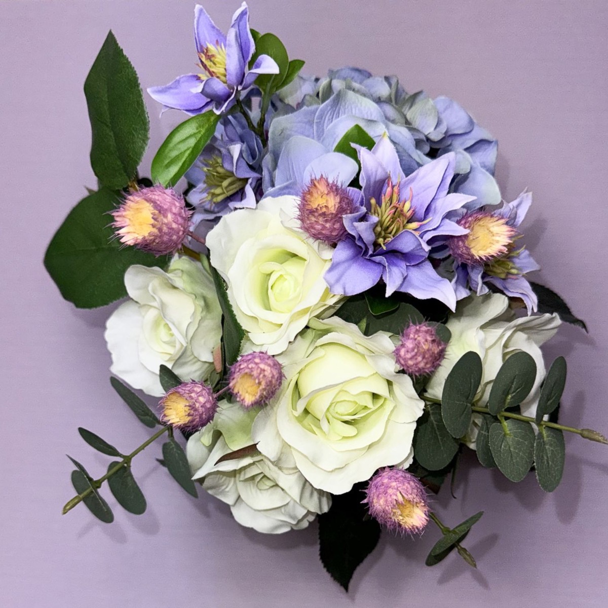 L'amore sboccia per sempre! Mentre navigava nel nostro negozio online, la nostra cliente abituale Monika si è imbattuta nel progetto di bouquet da sposa di un ex cliente. Si è chiesta se fosse possibile ricreare il suo bouquet da sposa e ci ha scritto un messaggio. Il bouquet dovrebbe essere una sorpresa indimenticabile per tua moglie, ricordandole il giorno del tuo matrimonio. Una bellissima dichiarazione d'amore, pensiamo. Una rigogliosa ortensia con delicate rose viola e crema riempie il bouquet. Questi erano completati da belle clematidi e foglie verdi di rami di melo ed eucalipto. Per la prima volta abbiamo utilizzato anche fiori secchi, che hanno dato un tocco di colore tra i petali delle rose. Il nostro cliente è stato molto soddisfatto della nostra replica del bouquet da sposa. Vuoi anche tu un bouquet da sposa artificiale per l'eternità? Acquista il look!