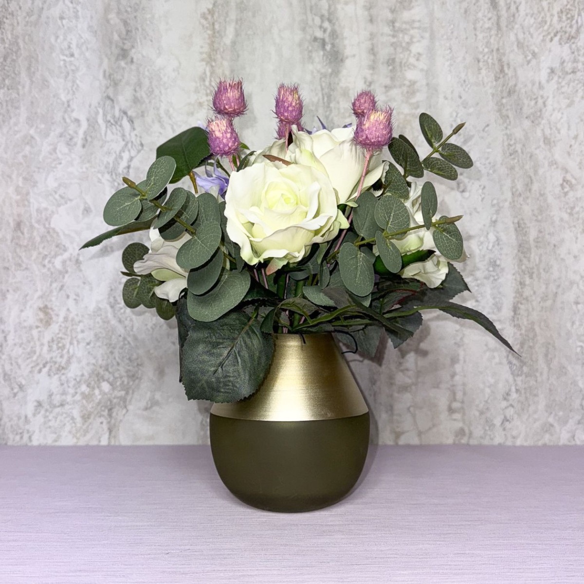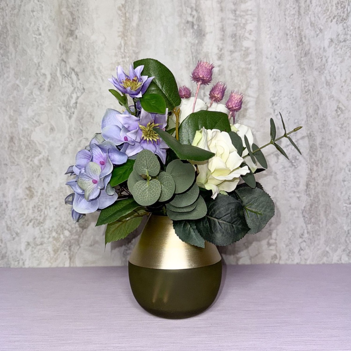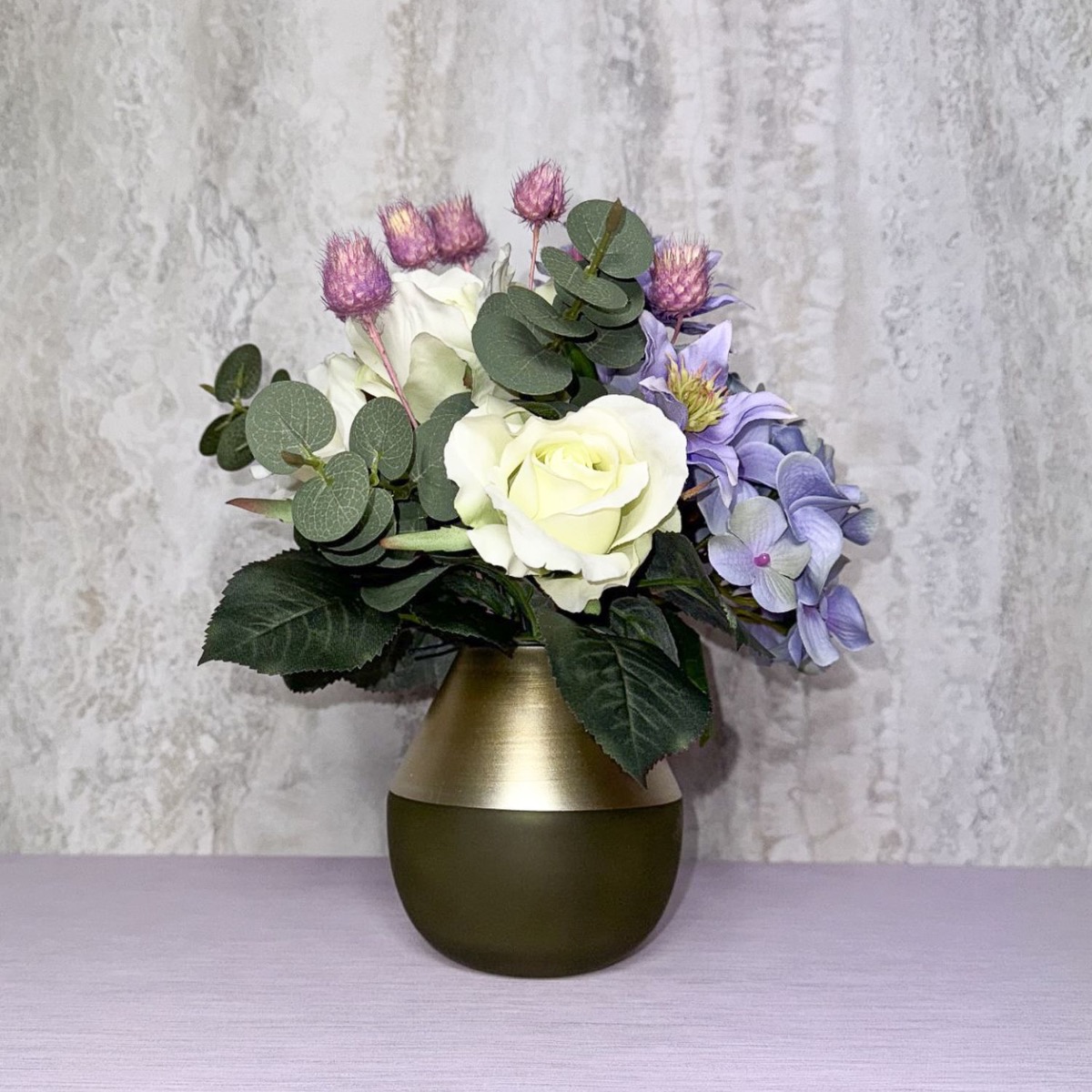 L'amore sboccia per sempre! Mentre navigava nel nostro negozio online, la nostra cliente abituale Monika si è imbattuta nel progetto di bouquet da sposa di un ex cliente. Si è chiesta se fosse possibile ricreare il suo bouquet da sposa e ci ha scritto un messaggio. Il bouquet dovrebbe essere una sorpresa indimenticabile per tua moglie, ricordandole il giorno del tuo matrimonio. Una bellissima dichiarazione d'amore, pensiamo. Una rigogliosa ortensia con delicate rose viola e crema riempie il bouquet. Questi erano completati da belle clematidi e foglie verdi di rami di melo ed eucalipto. Per la prima volta abbiamo utilizzato anche fiori secchi, che hanno dato un tocco di colore tra i petali delle rose. Il nostro cliente è stato molto soddisfatto della nostra replica del bouquet da sposa. Vuoi anche tu un bouquet da sposa artificiale per l'eternità? Acquista il look!