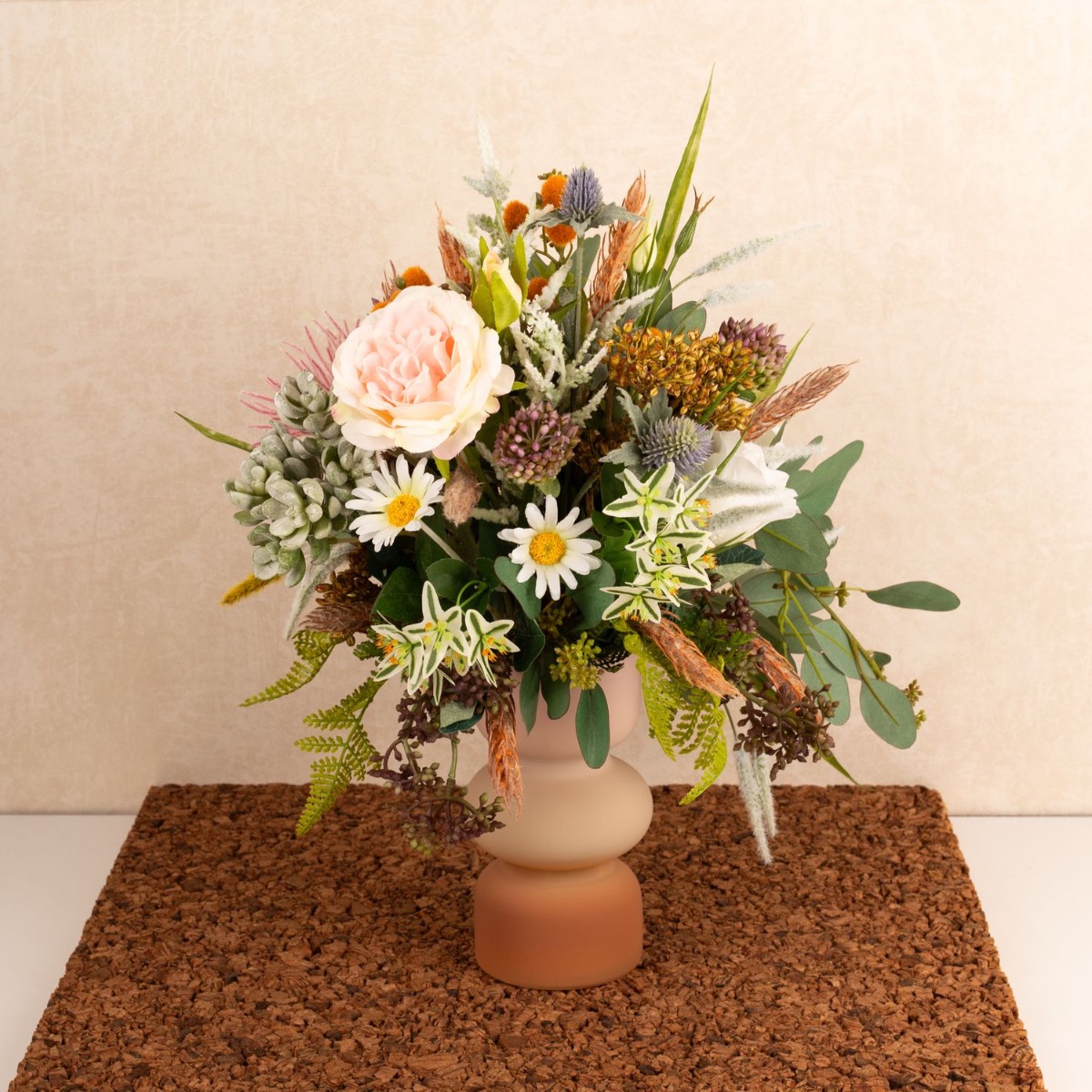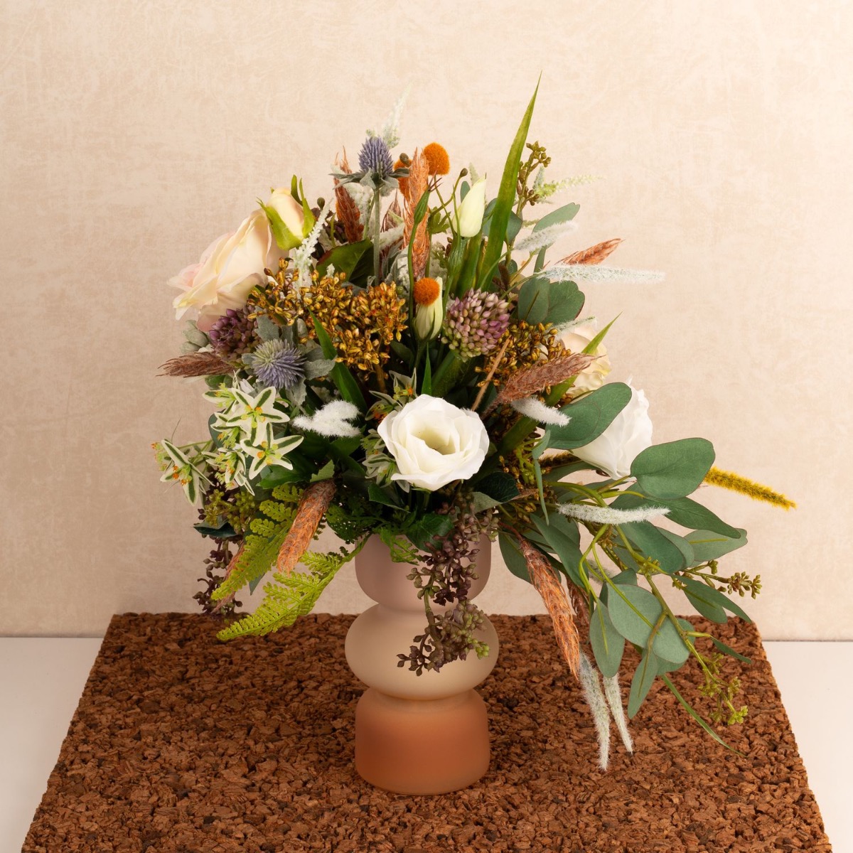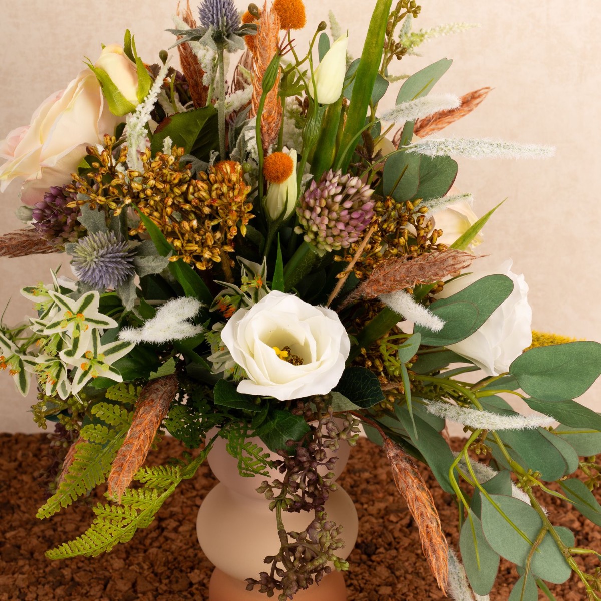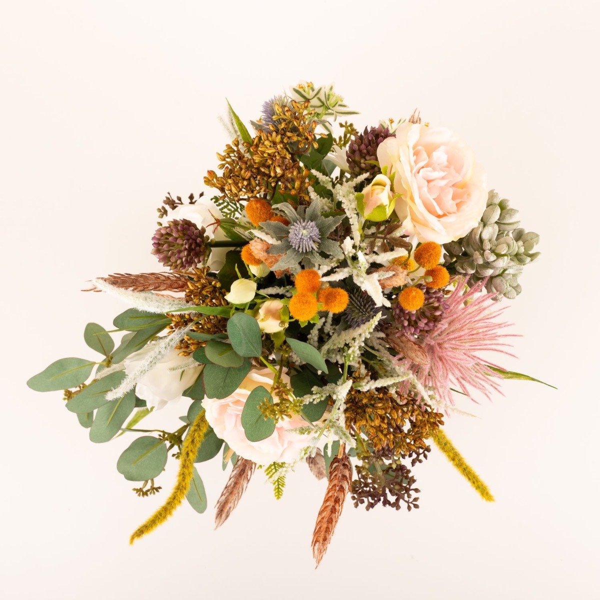 Una composizione floreale romantica e selvaggia! Kate voleva che creassimo una replica artificiale del suo bouquet da sposa come ricordo. Siamo rimasti entusiasti della sua commissione, un delicato bouquet di fiori di campo, legato con cura da un fiorista. Dopo una lunga ricerca, siamo riusciti a raccogliere gli innumerevoli fiori per il bouquet e ci siamo messi al lavoro. Abbiamo tagliato numerosi rami e abbiamo anche dovuto realizzare uno stelo allungato per la succulenta del bouquet. Poi, sono state inserite numerose pannocchie nel bouquet ed è stata creata una sporgenza di eucalipto. Il bouquet da sposa assomigliava quasi al bouquet da sposa originale, cosa che la nostra cliente ha notato con stupore. Piacerebbe anche a voi ricevere un bouquet da sposa così bello? Acquistate il look!