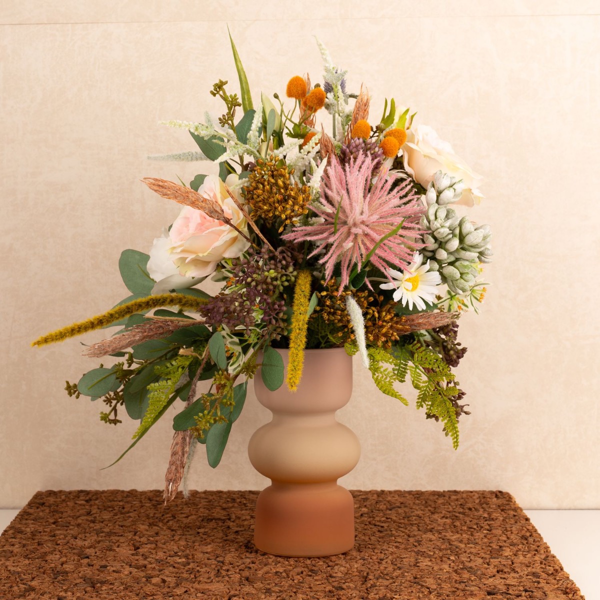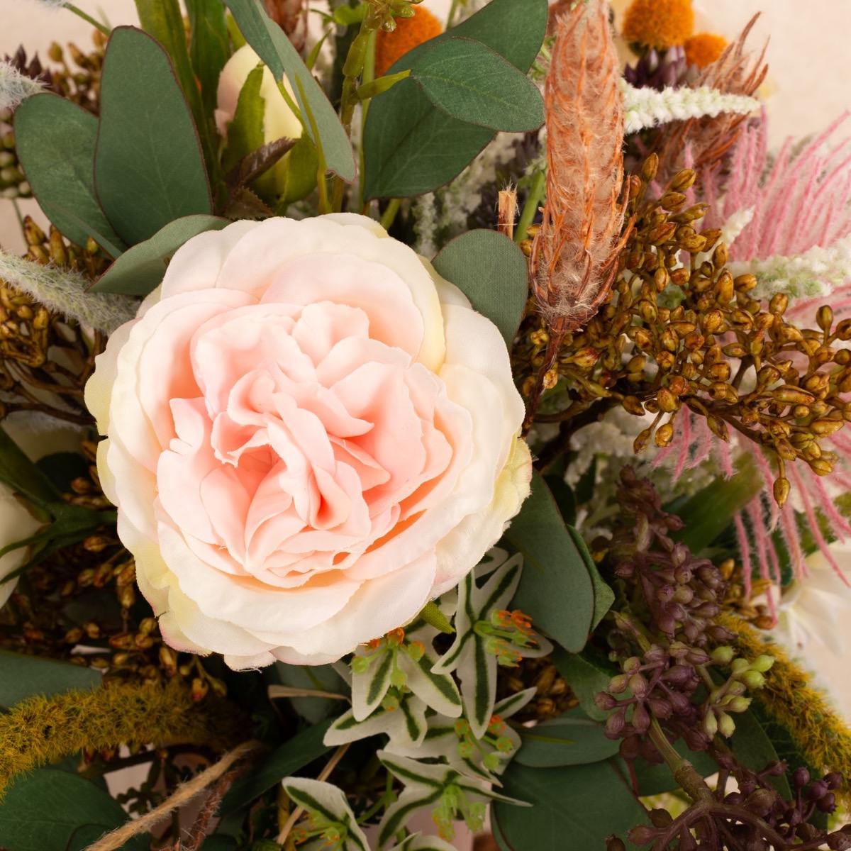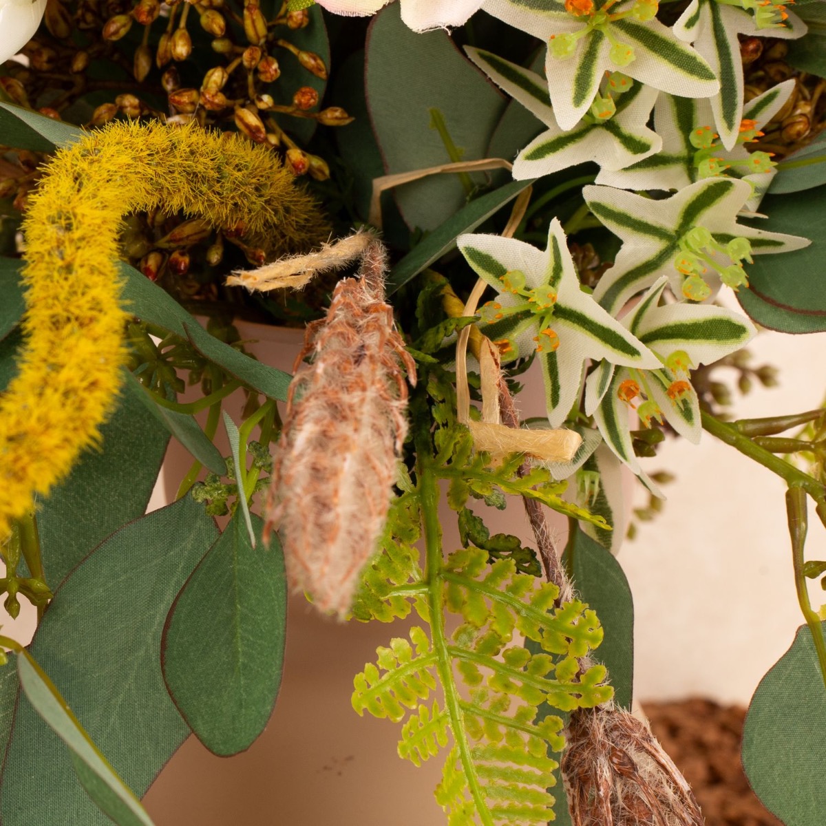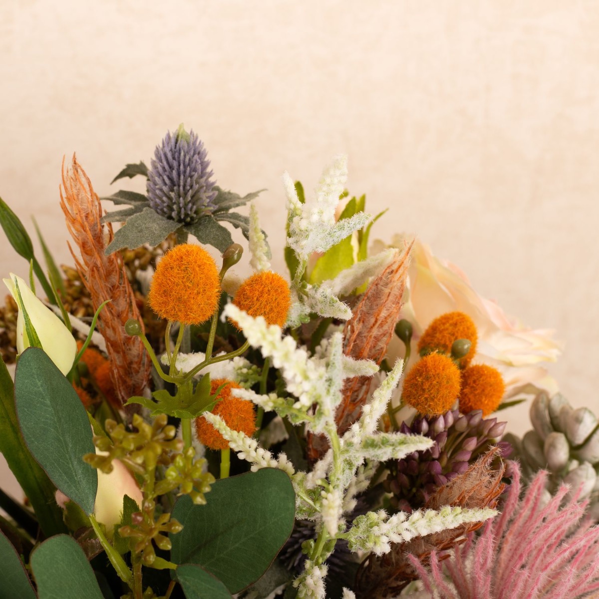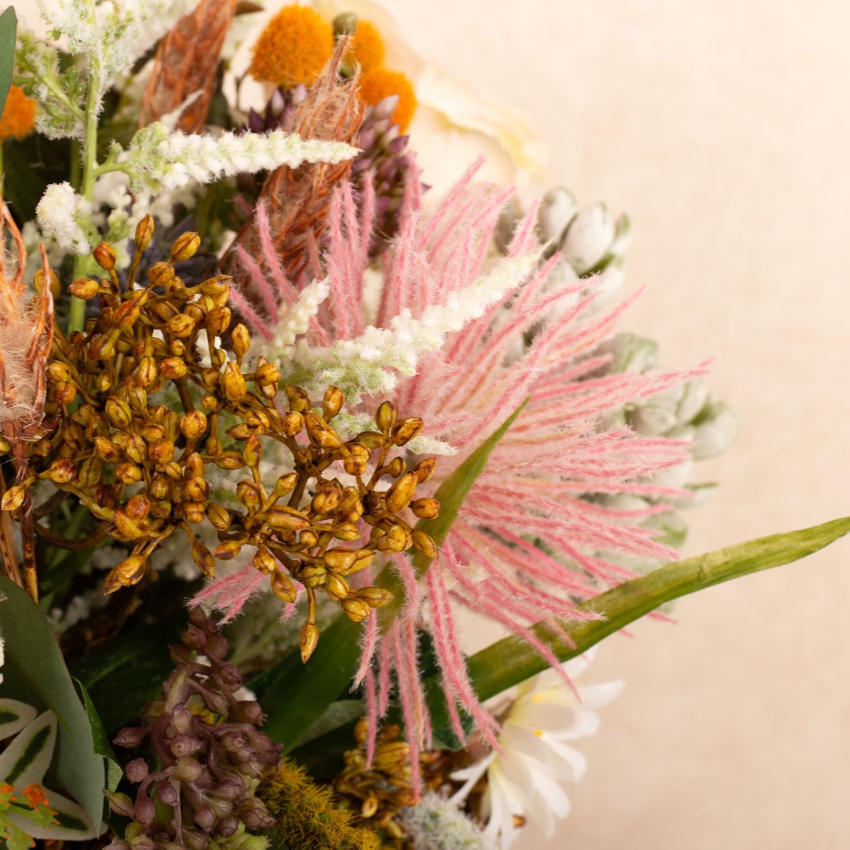 Una composizione floreale romantica e selvaggia! Kate voleva che creassimo una replica artificiale del suo bouquet da sposa come ricordo. Siamo rimasti entusiasti della sua commissione, un delicato bouquet di fiori di campo, legato con cura da un fiorista. Dopo una lunga ricerca, siamo riusciti a raccogliere gli innumerevoli fiori per il bouquet e ci siamo messi al lavoro. Abbiamo tagliato numerosi rami e abbiamo anche dovuto realizzare uno stelo allungato per la succulenta del bouquet. Poi, sono state inserite numerose pannocchie nel bouquet ed è stata creata una sporgenza di eucalipto. Il bouquet da sposa assomigliava quasi al bouquet da sposa originale, cosa che la nostra cliente ha notato con stupore. Piacerebbe anche a voi ricevere un bouquet da sposa così bello? Acquistate il look!