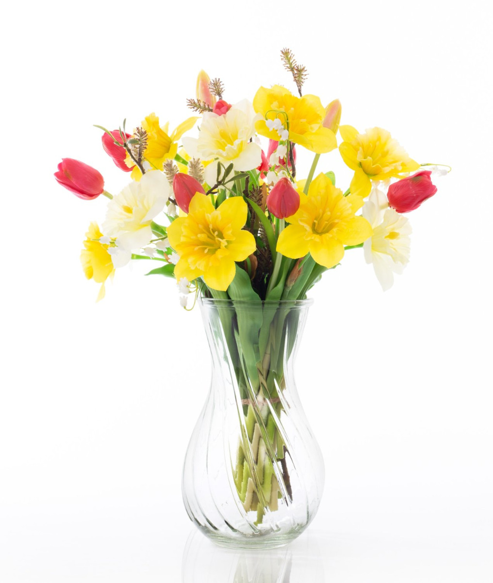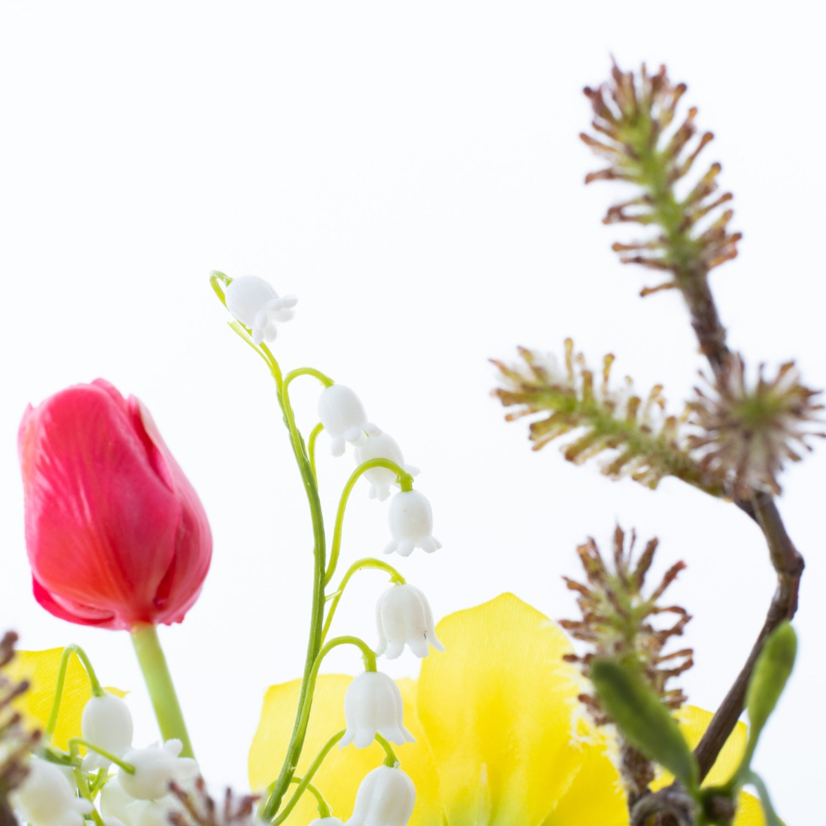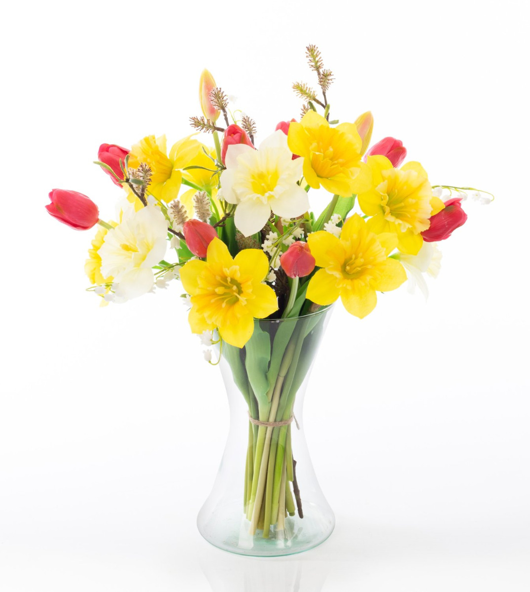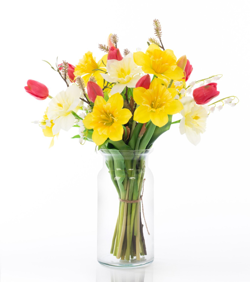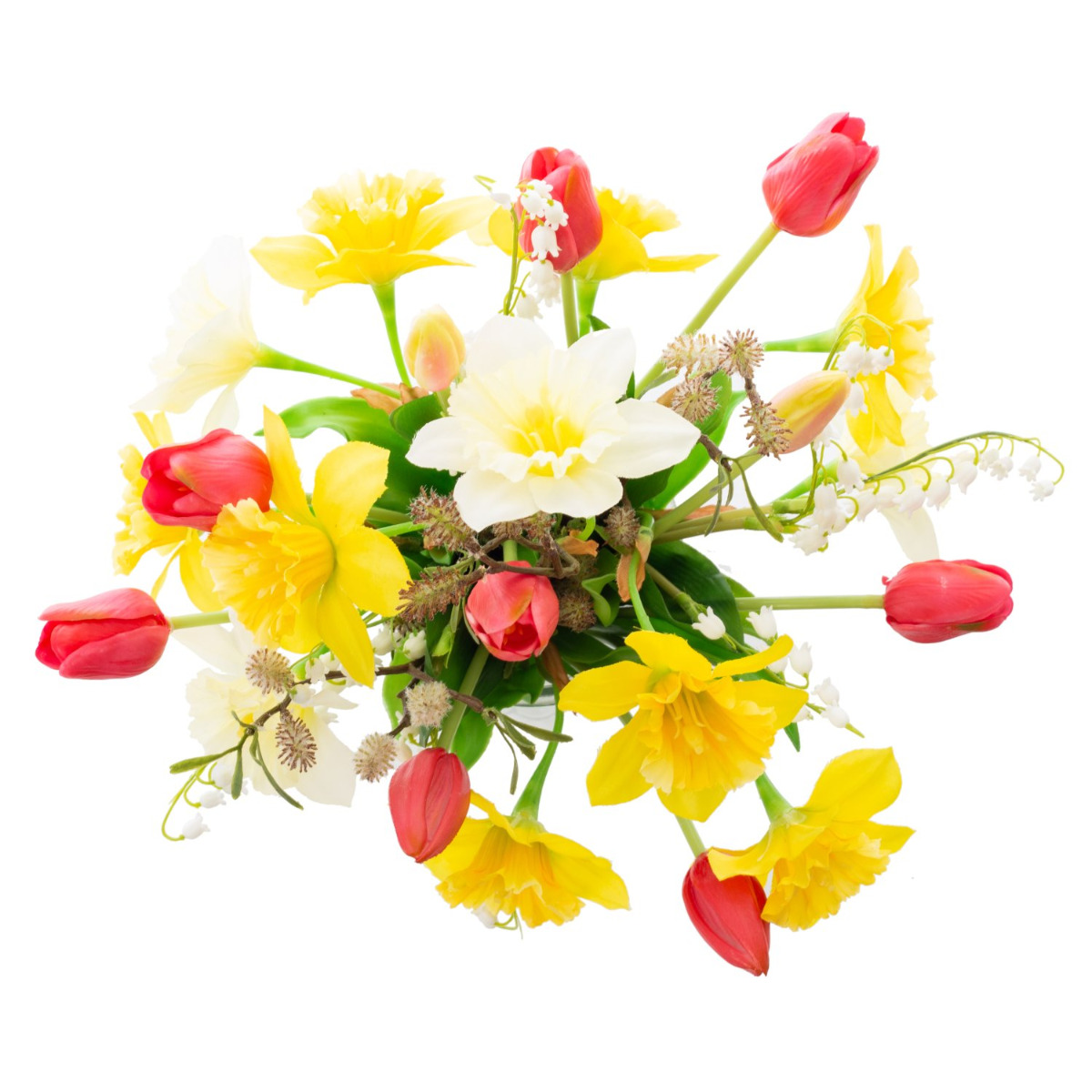 Il bouquet di fiori finti MANULA è l'altezza ideale per essere collocato sul tavolo da pranzo, per esempio. I fiori colorati di narciso, tulipano e mughetto sono tipiche fioriture primaverili, che sono completate in modo giocoso da un ramo di salice.