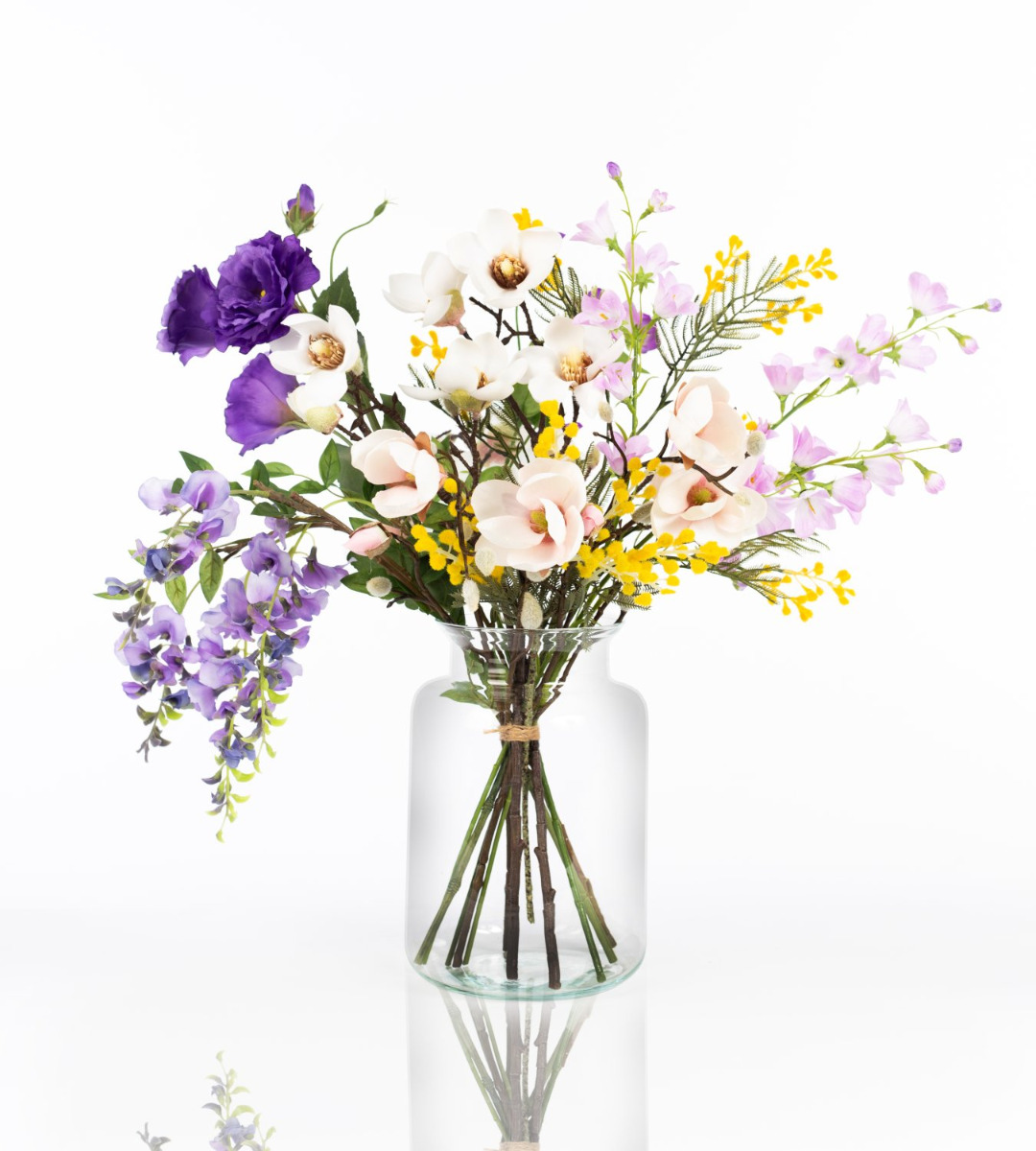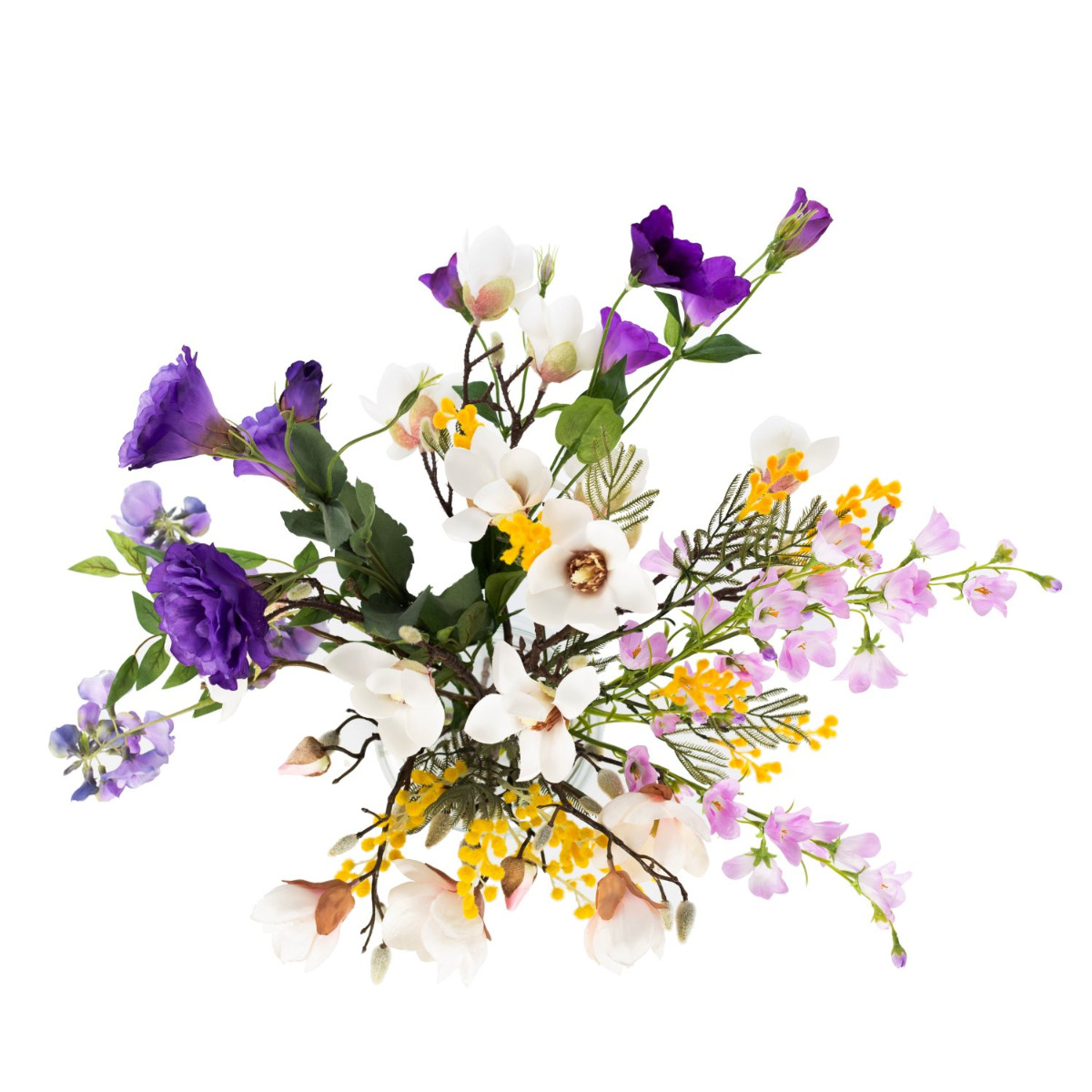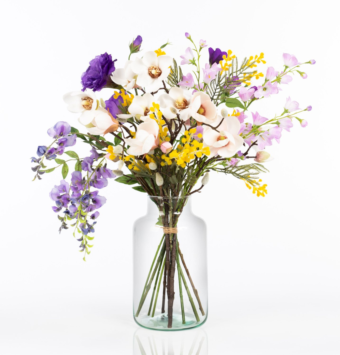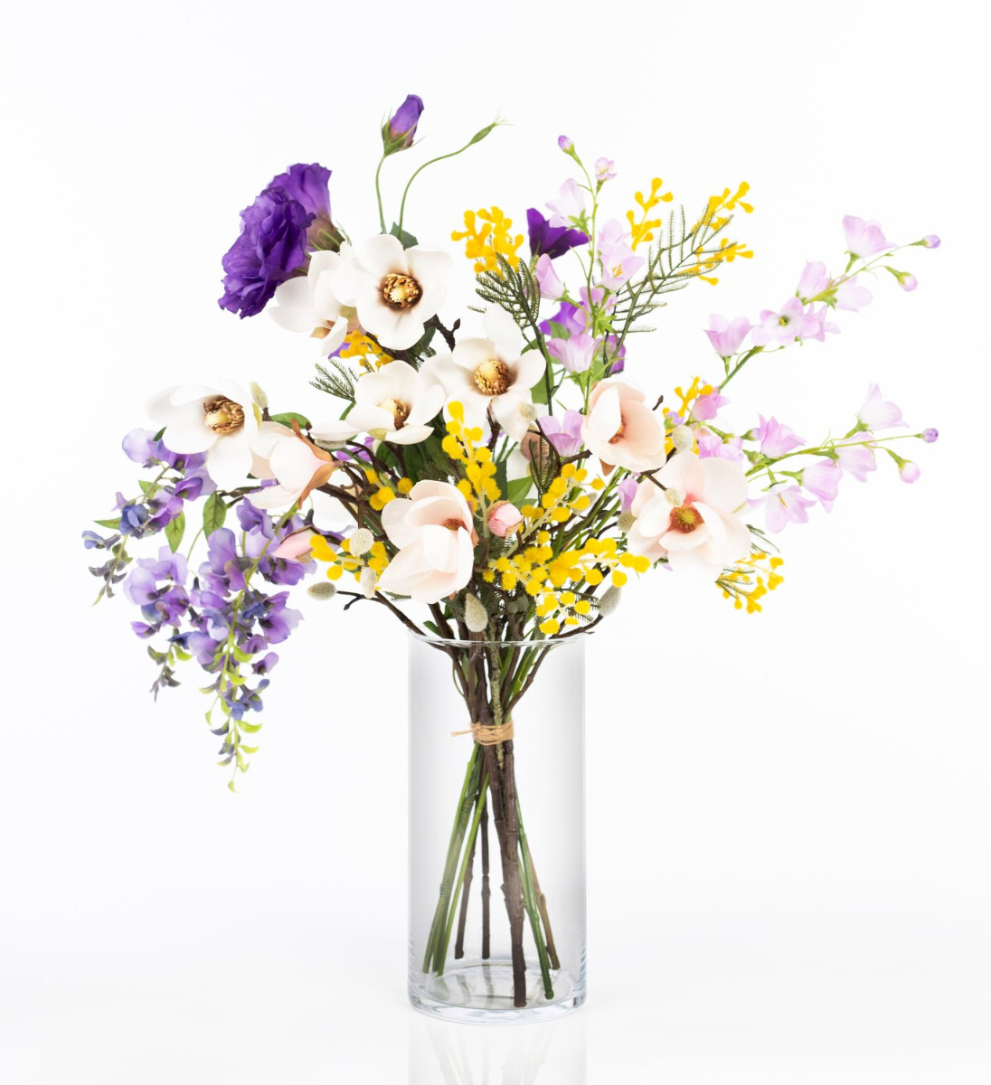 Con il bouquet colorato CALISSA riceverai un omaggio floreale di straordinaria bellezza. Glicine pendente, lisianthus rigoglioso e delicate campanule sono completati da delicati rami di magnolia. I piccoli fiori della mimosa gialla danno al bouquet il tocco finale, spuntando timidamente tra i fiori più grandi.
