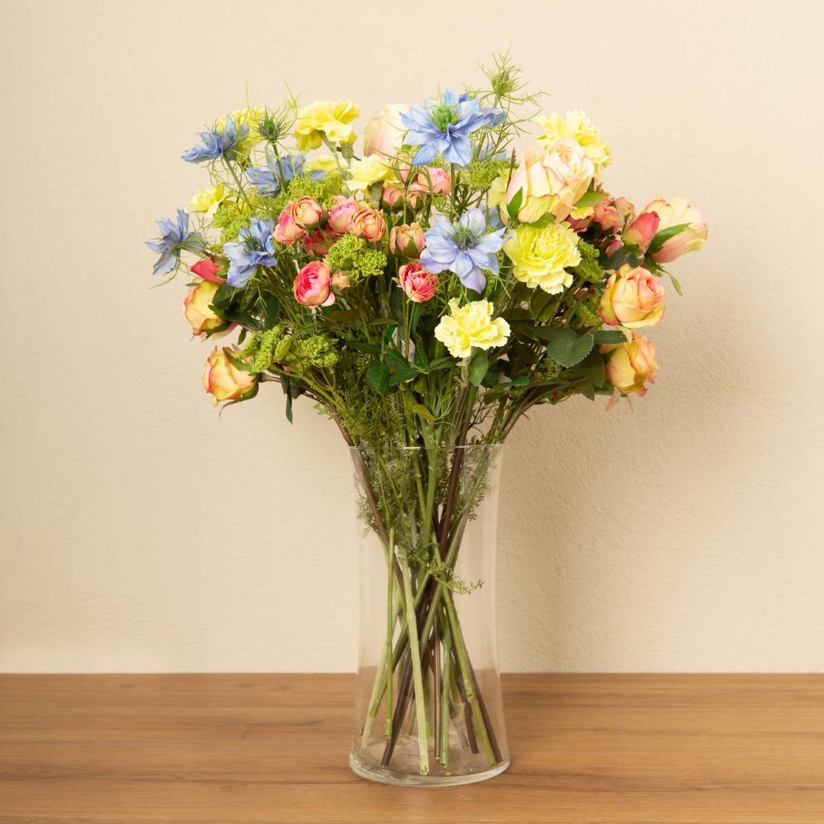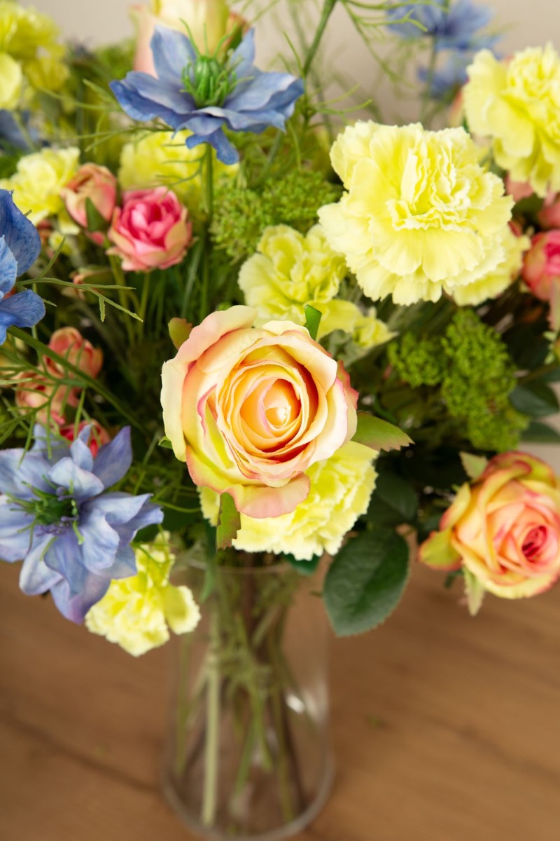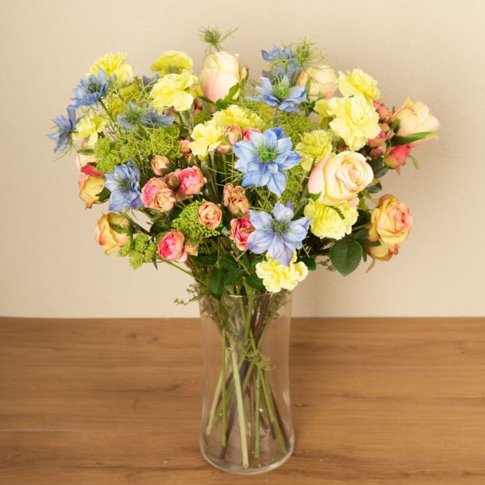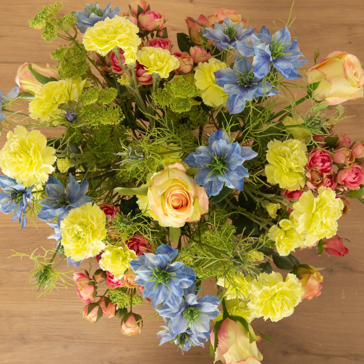 Bouquet artificiale classico e colorato! A volte i nostri clienti sono così entusiasti di un bouquet che hanno ricevuto in regalo che non vogliono che svanisca. Come in questo caso, la nostra cliente ci ha scritto e ci ha chiesto se potevamo ricreare il suo vero bouquet di fiori artificiali. Con alcuni fiori finti, il disegno del fiore è molto più grande rispetto alla versione naturale. Ad esempio, abbiamo utilizzato il cumino nero al posto dell'agapanto. Siamo riusciti a trovare gli altri fiori con un disegno simile nel magazzino abbastanza rapidamente. La nostra prima proposta è stata inviata via e-mail alla cliente, che ci ha chiesto di renderla un po' più rigogliosa. Abbiamo quindi aggiunto delle rose e del cumino nero e abbiamo riempito il bouquet con l'achillea. Con questo bouquet siamo riusciti a ricreare una copia di successo di un bouquet che da tempo era sbiadito, portando per la seconda volta la gioia sul volto della cliente. Acquista il look!