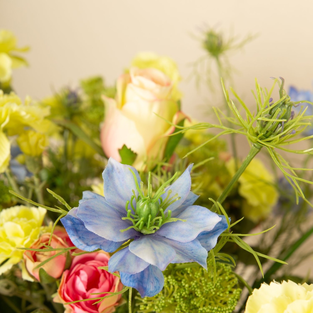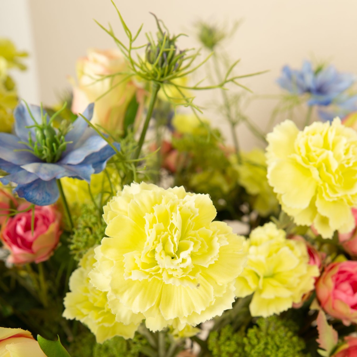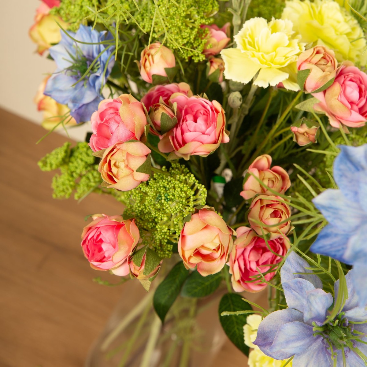 Bouquet artificiale classico e colorato! A volte i nostri clienti sono così entusiasti di un bouquet che hanno ricevuto in regalo che non vogliono che svanisca. Come in questo caso, la nostra cliente ci ha scritto e ci ha chiesto se potevamo ricreare il suo vero bouquet di fiori artificiali. Con alcuni fiori finti, il disegno del fiore è molto più grande rispetto alla versione naturale. Ad esempio, abbiamo utilizzato il cumino nero al posto dell'agapanto. Siamo riusciti a trovare gli altri fiori con un disegno simile nel magazzino abbastanza rapidamente. La nostra prima proposta è stata inviata via e-mail alla cliente, che ci ha chiesto di renderla un po' più rigogliosa. Abbiamo quindi aggiunto delle rose e del cumino nero e abbiamo riempito il bouquet con l'achillea. Con questo bouquet siamo riusciti a ricreare una copia di successo di un bouquet che da tempo era sbiadito, portando per la seconda volta la gioia sul volto della cliente. Acquista il look!