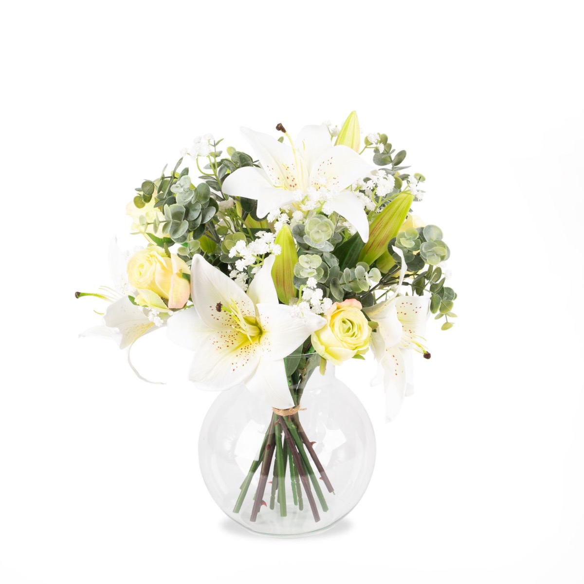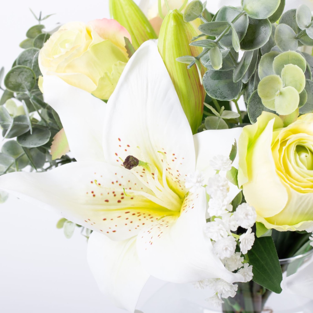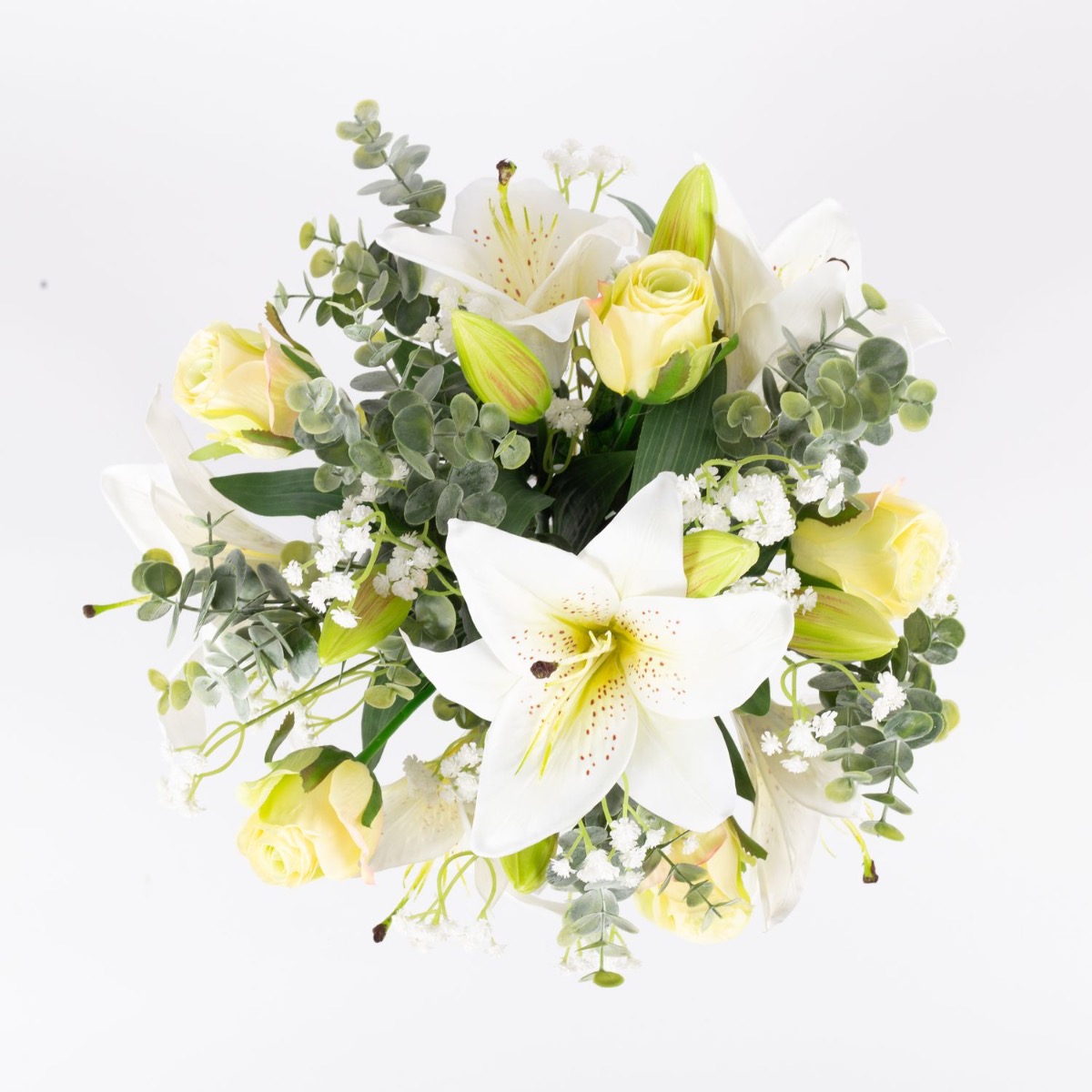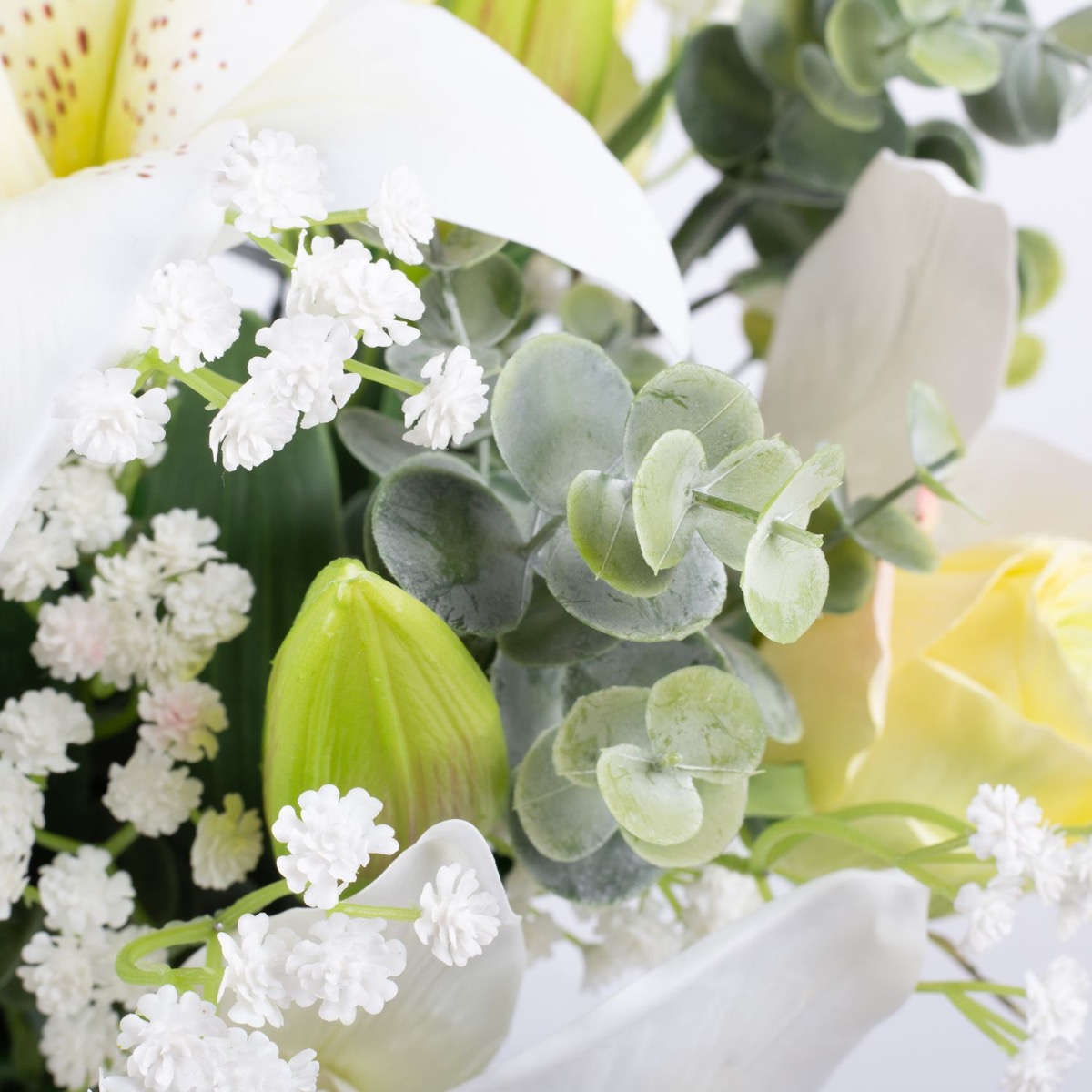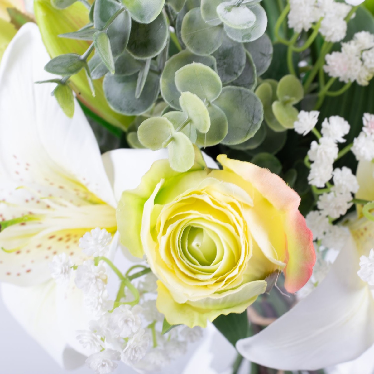 L'elegante bouquet artificiale MARIPOSA composto da gigli bianchi e rose verdastre simboleggia la rinascita e la purezza. L'insieme floreale è utilizzato sia per matrimoni che per funerali ed è completato da eucalipto moderno e rami di gipsofila classica.