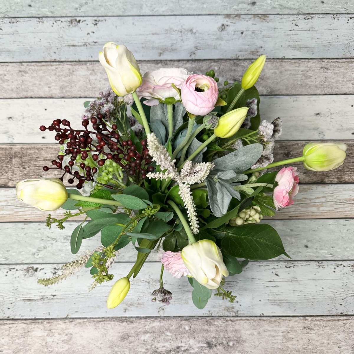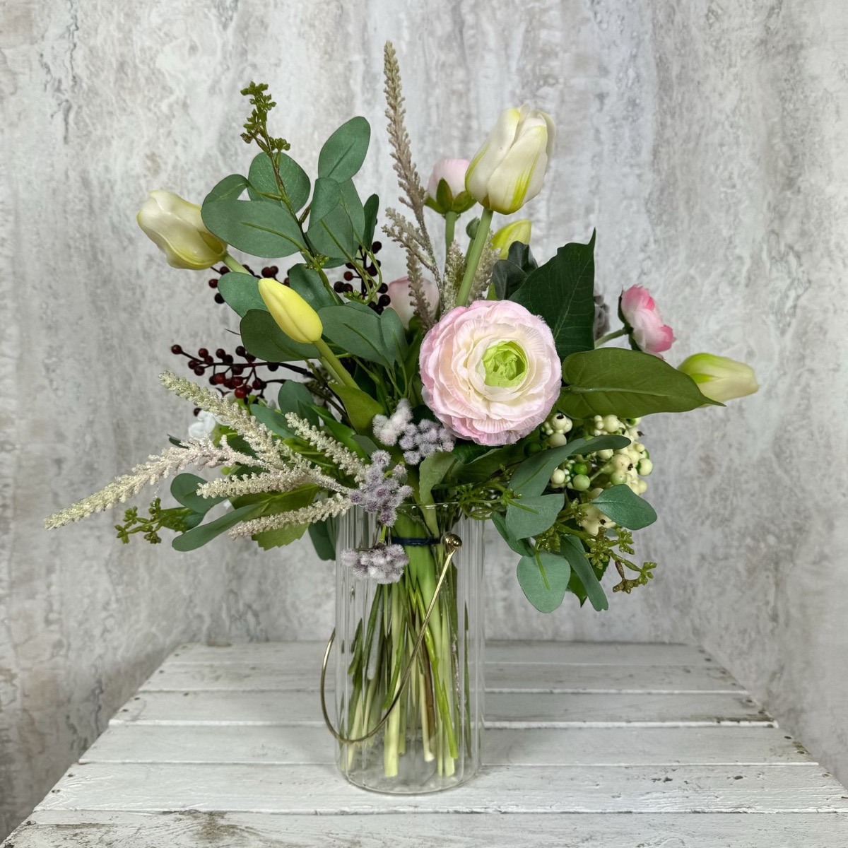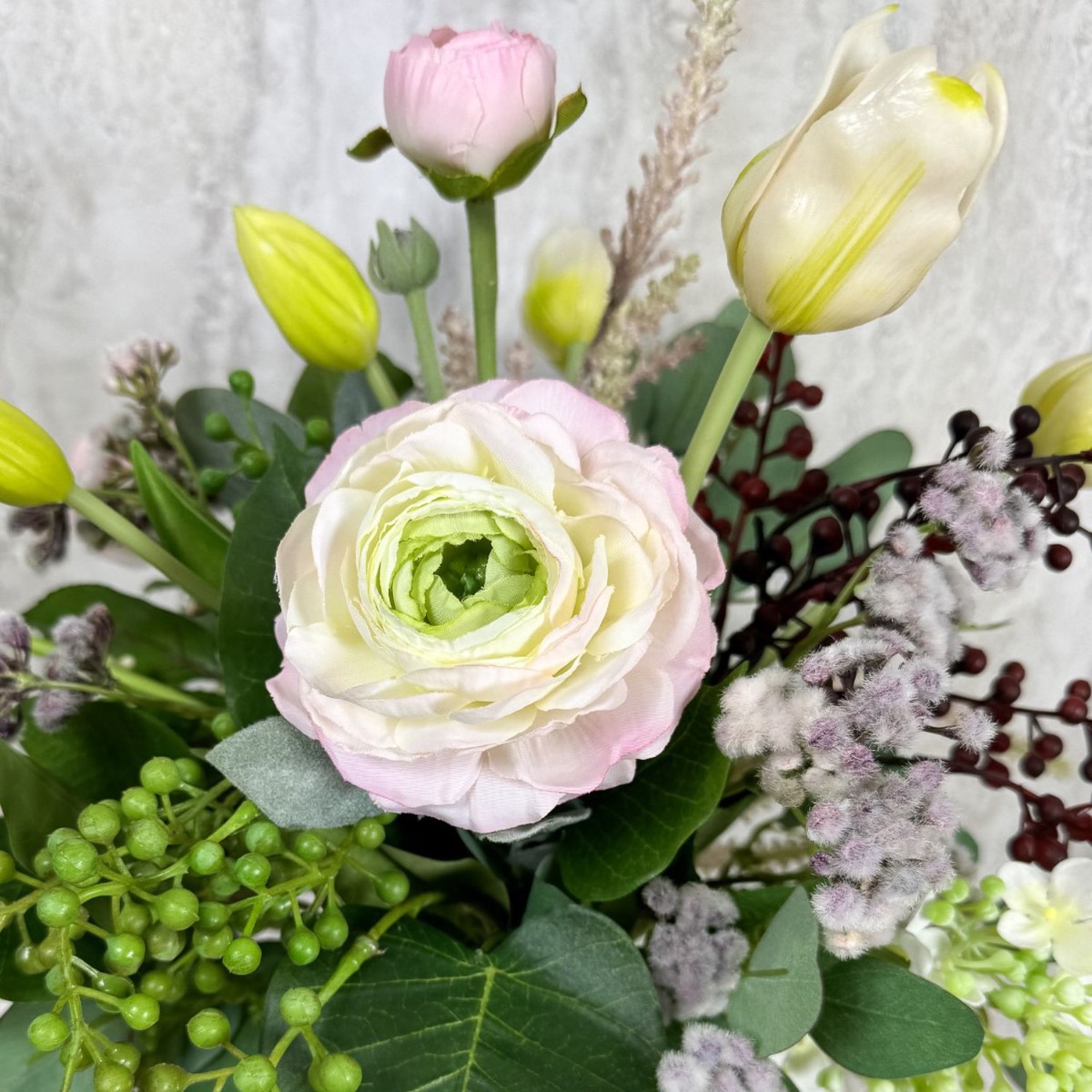 Primavera romantica! Christiane era ancora alla ricerca della giusta decorazione floreale per il suo studio, dove si tengono regolarmente seminari sul design del gioiello. Ciò che per lei era particolarmente importante era un aspetto selvaggio e naturale, nonché un'armoniosa combinazione di colori nei toni del bianco, verde e rosa. Tulipani a stelo lungo, pregiati ranuncoli e vari accessori adornavano il bouquet. Le altezze irregolari e la disposizione libera di fiori e foglie conferiscono alla composizione la vivacità e il carisma informale desiderati. Che sono perfetti per un laboratorio di gioielleria e ispirano i partecipanti e permettono alla loro creatività di fiorire. Vuoi dare anche tu alla tua stanza un'eleganza discreta e un tocco primaverile? Acquista il look!