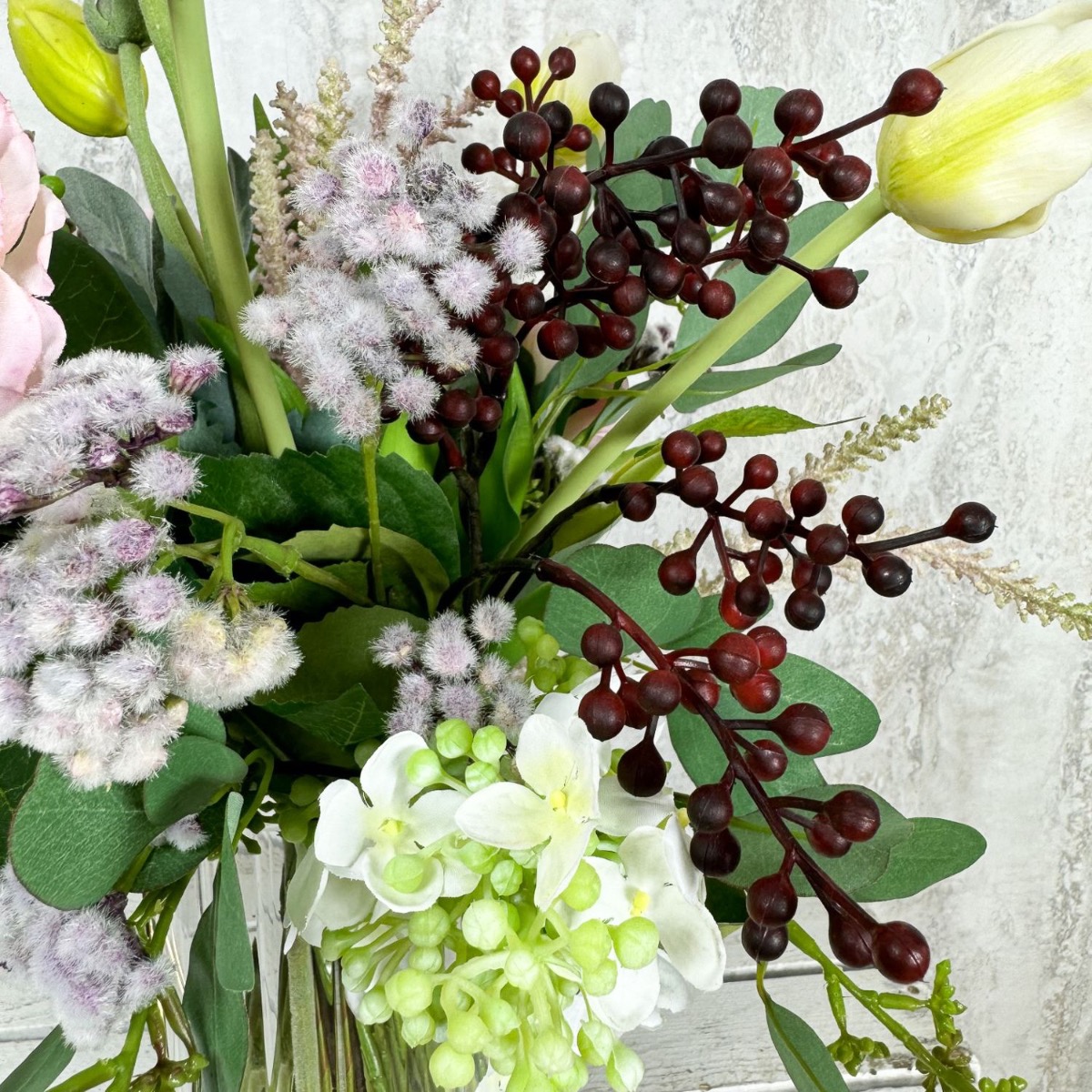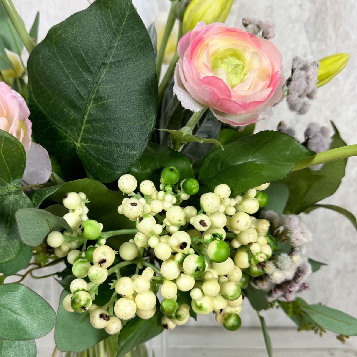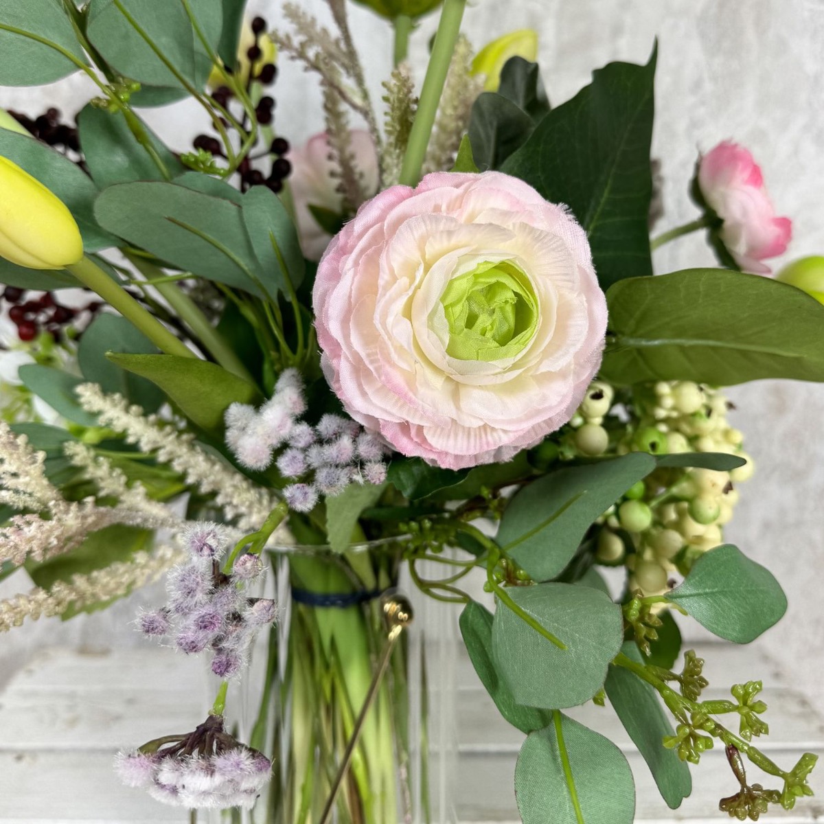 Primavera romantica! Christiane era ancora alla ricerca della giusta decorazione floreale per il suo studio, dove si tengono regolarmente seminari sul design del gioiello. Ciò che per lei era particolarmente importante era un aspetto selvaggio e naturale, nonché un'armoniosa combinazione di colori nei toni del bianco, verde e rosa. Tulipani a stelo lungo, pregiati ranuncoli e vari accessori adornavano il bouquet. Le altezze irregolari e la disposizione libera di fiori e foglie conferiscono alla composizione la vivacità e il carisma informale desiderati. Che sono perfetti per un laboratorio di gioielleria e ispirano i partecipanti e permettono alla loro creatività di fiorire. Vuoi dare anche tu alla tua stanza un'eleganza discreta e un tocco primaverile? Acquista il look!