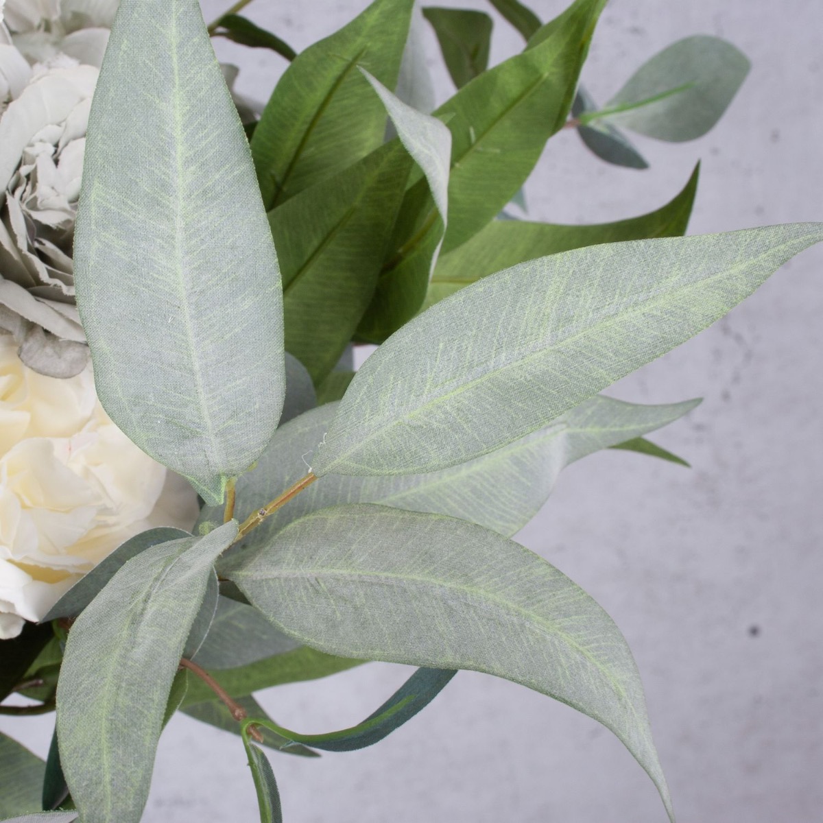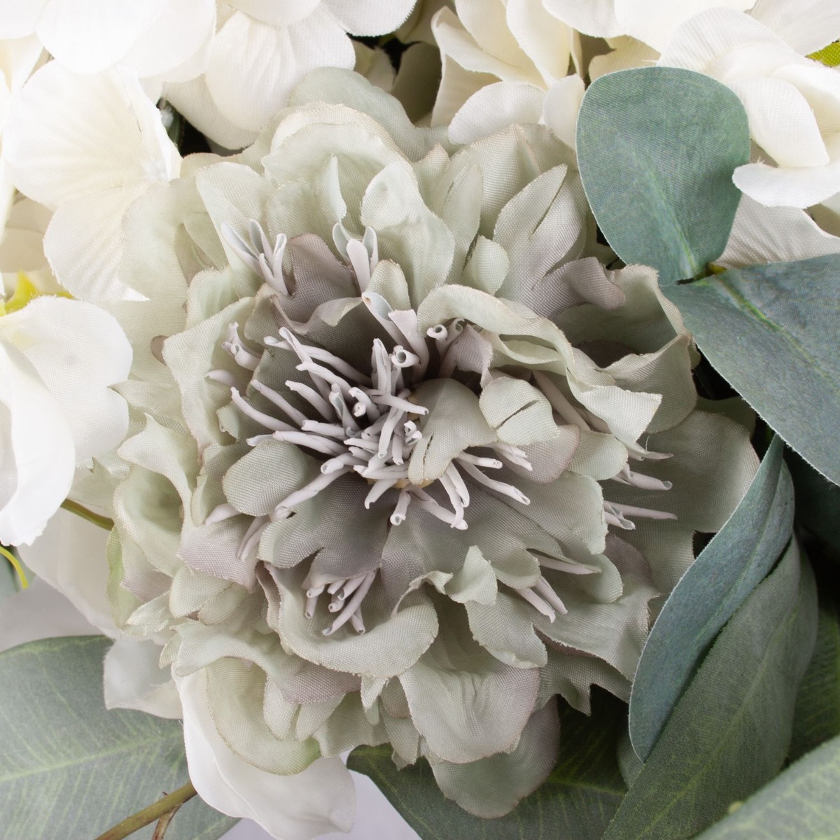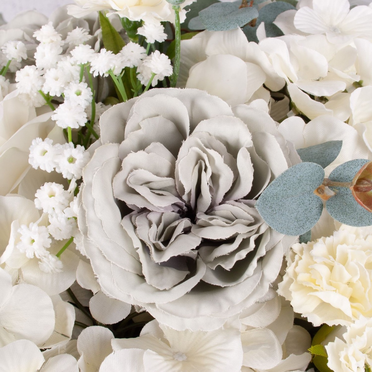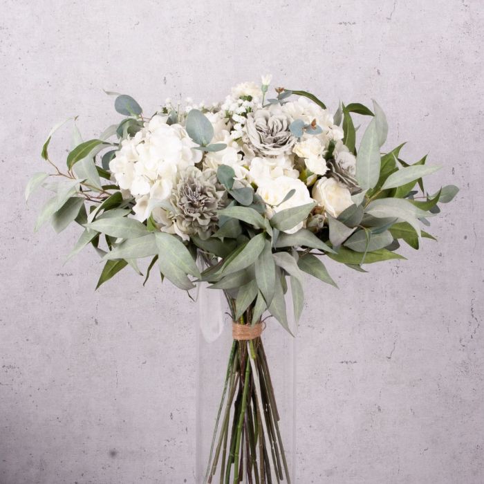 Elegante e delicato! Questo bouquet è discreto e moderato nei colori. È esattamente come lo aveva immaginato la nostra cliente francese, che ci aveva chiesto un bouquet personalizzato. Il verde pallido delle foglie di eucalipto, abbinato alle rose cabbage grigie e alle ortensie bianche, conferisce al bouquet un aspetto autunnale e malinconico. I colori sobri rendono questo bouquet adatto a quasi tutti gli ambienti. Volete anche un bouquet artificiale stravagante? Acquistate il look!