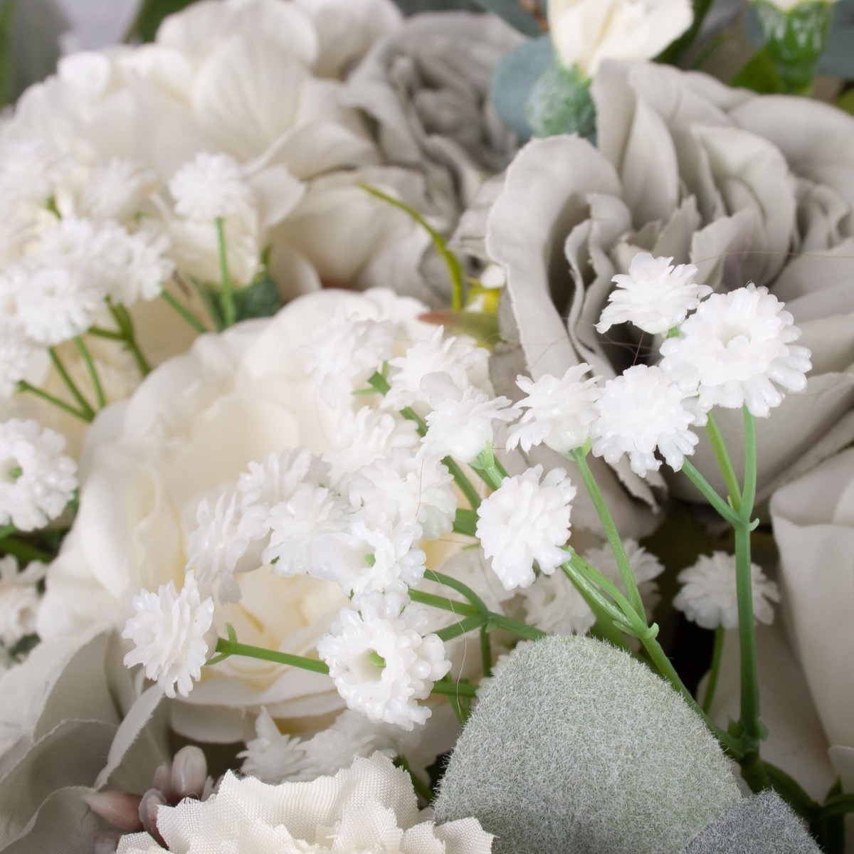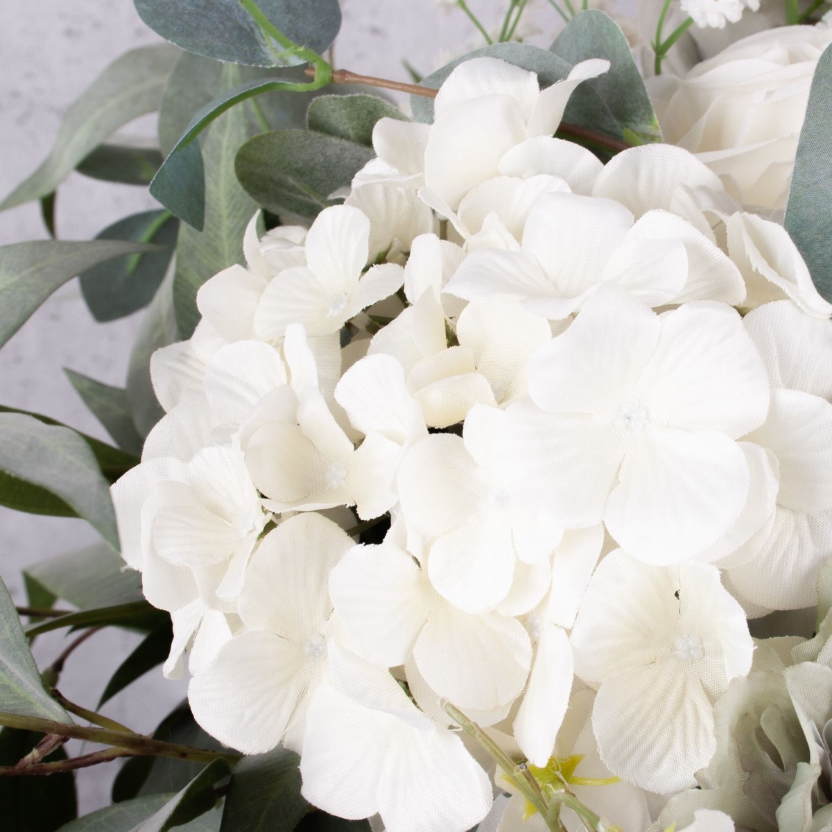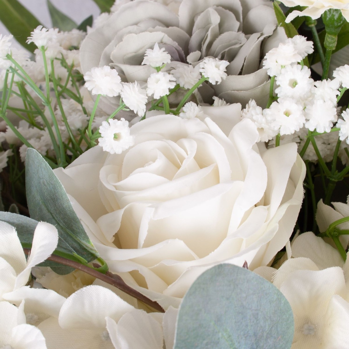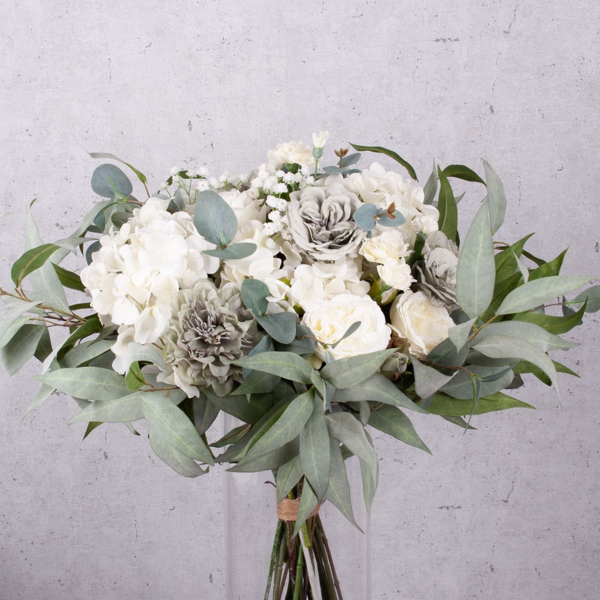 Elegante e delicato! Questo bouquet è discreto e moderato nei colori. È esattamente come lo aveva immaginato la nostra cliente francese, che ci aveva chiesto un bouquet personalizzato. Il verde pallido delle foglie di eucalipto, abbinato alle rose cabbage grigie e alle ortensie bianche, conferisce al bouquet un aspetto autunnale e malinconico. I colori sobri rendono questo bouquet adatto a quasi tutti gli ambienti. Volete anche un bouquet artificiale stravagante? Acquistate il look!