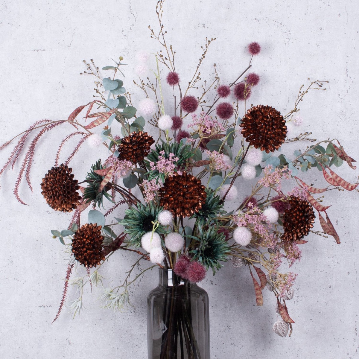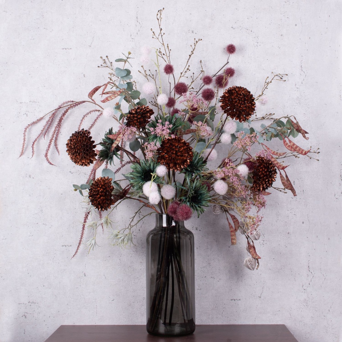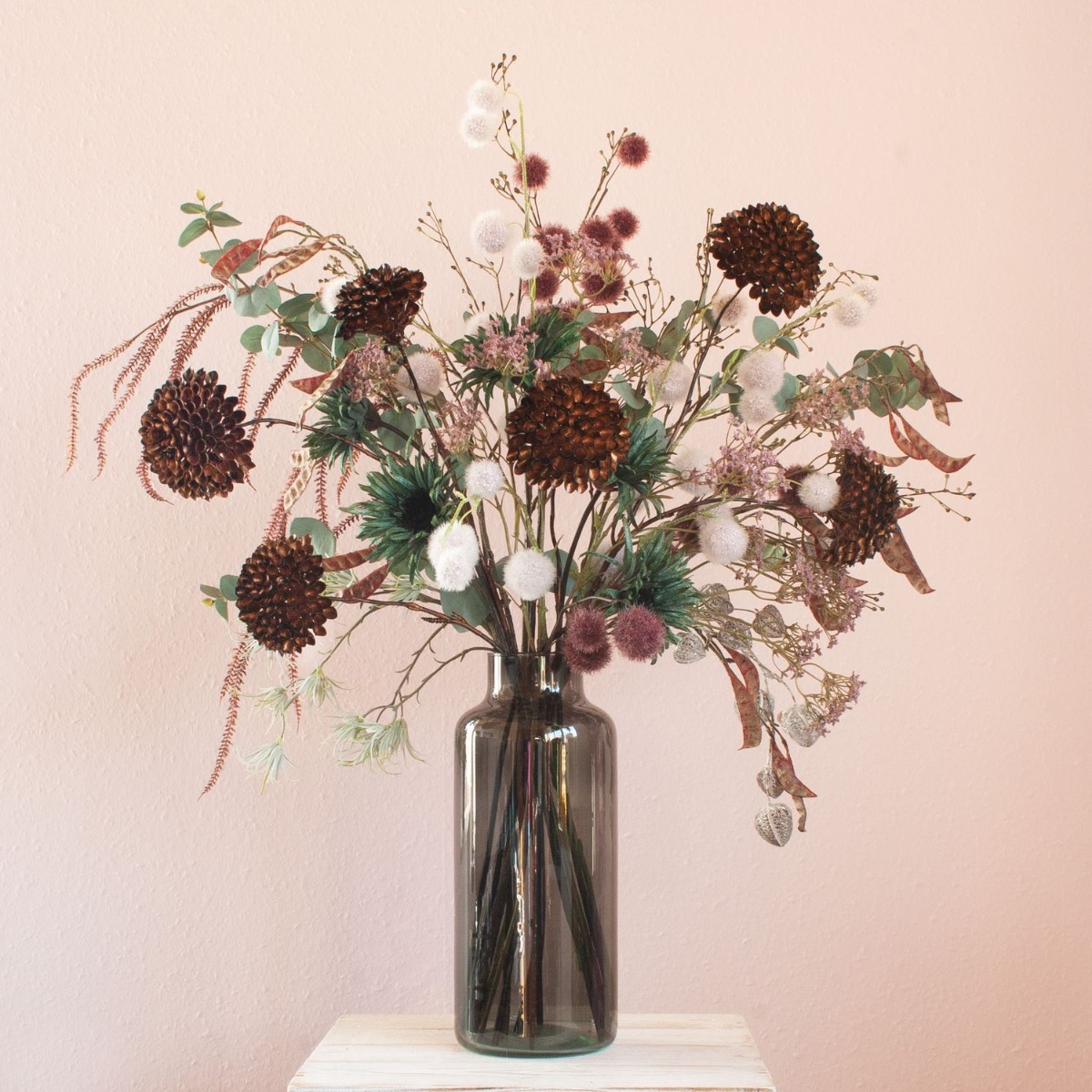 Magnifico e incantevole! La nostra cliente cercava un magnifico bouquet per il suo appartamento in un vecchio edificio con un soffitto alto che occupasse tutto lo spazio di una cassettiera. Le è piaciuto subito il nostro LOOK-057 Eleganza ala Arte Nuveau. Lo abbiamo preso come modello e lo abbiamo reso più esuberante. Abbiamo utilizzato rami viola chiaro per aggiungere il calore desiderato al bouquet. Un semplice vaso nero e trasparente completa perfettamente questo bouquet. Volete anche un bouquet artificiale stravagante? Acquistate il look!