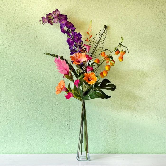 Sunset Paradise! Il nostro cliente Josef desiderava un bouquet tropicale slanciato per l'ingresso di casa sua. Questo ensemble tropicale porta immediatamente un'atmosfera vacanziera tra le mura domestiche e ricorda le tiepide serate sotto le palme, i cocktail esotici e il dolce rumore del mare. Disposte in un elegante vaso di vetro trasparente, i fiori arancioni brillanti, le delicate tonalità rosa e gli accenti viola intenso si fondono in un insieme armonioso che irradia pura gioia di vivere. Le foglie di felce filigranate e il verde intenso delle foglie tropicali completano la composizione e la rendono perfetta per attirare l'attenzione, sia in soggiorno, sul balcone o nell'ufficio di casa. Porta anche tu un tocco di esotismo a casa tua, senza bisogno di fare le valigie! Acquista il look!