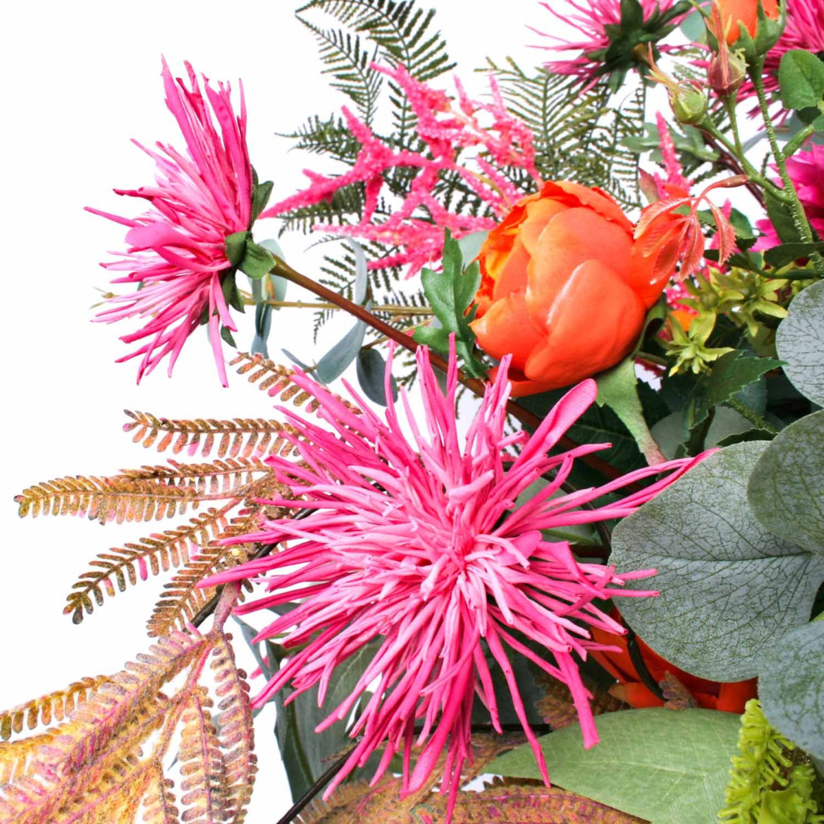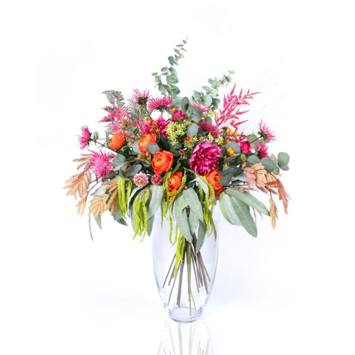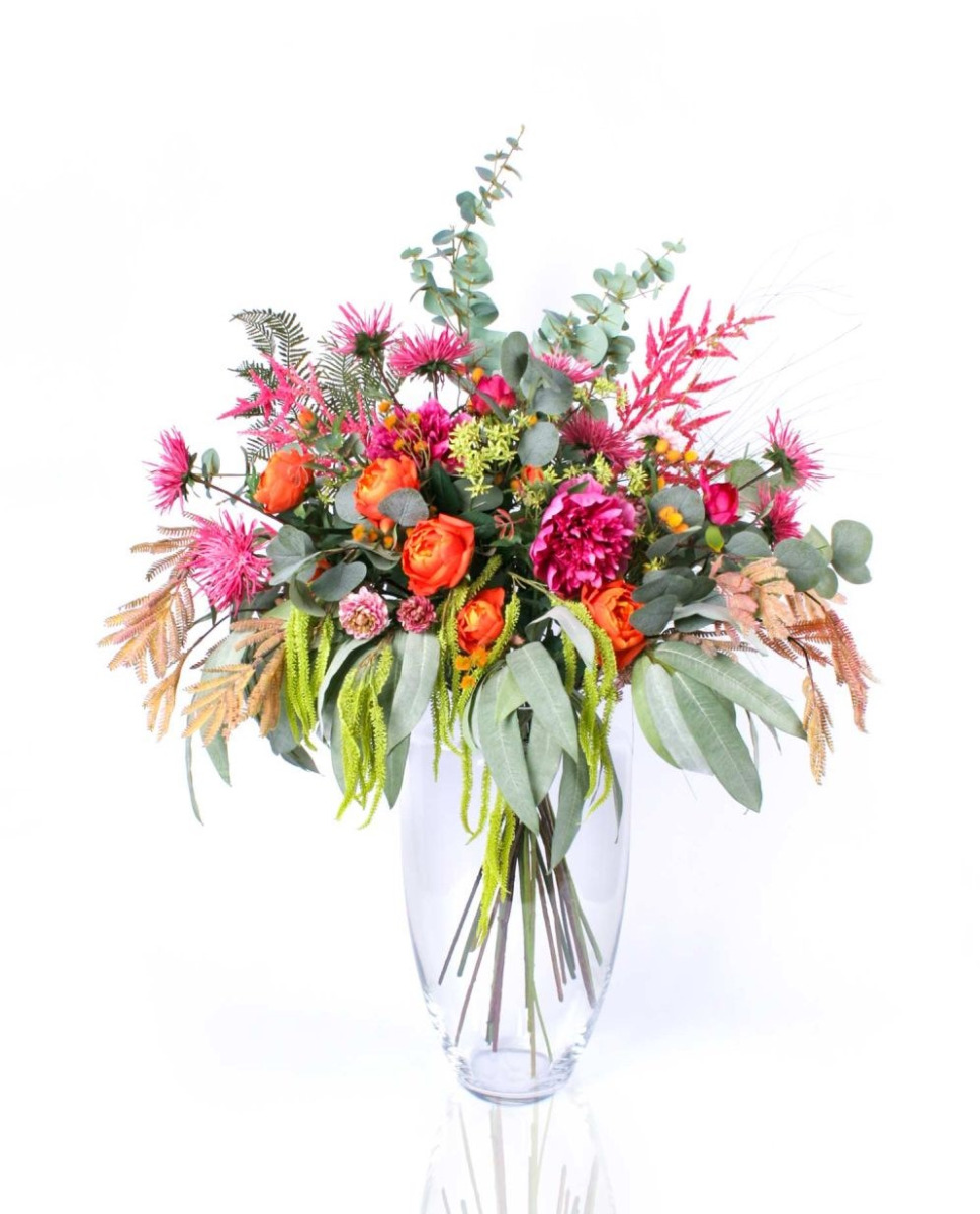 Coloratissimo bouquet artificiale! Natali ci ha mandato una mail chiedendoci se avremmo ricreato anche dei bouquet di fiori se ci avesse mandato una foto. Naturalmente abbiamo risposto in modo affermativo. Nel messaggio successivo di Natali, abbiamo ricevuto la foto del bouquet che desiderava, che aveva visto per caso in un ristorante. Un bouquet romantico e giocoso nei toni del rosa e del giallo. Le piaceva molto l'abbondanza e lo stile del bouquet, ma voleva che il suo mazzo, che avrebbe dovuto trovare posto nel suo nuovo appartamento, fosse in fucsia con un po' di arancione per armonizzarsi con il nuovo arredamento. Dopo 2 ore di ricerca nel nostro negozio e nel magazzino, abbiamo trovato i fiori giusti. Il primo esemplare ha avuto successo al primo colpo, ma mancava ancora un po' di verde fresco per dare al bouquet un tocco estivo e brillante. I ramoscelli corrispondenti ci sono capitati tra le mani per caso nel magazzino. Abbiamo aggiunto i rametti al bouquet e distribuito il verde tra i fiori colorati e il bouquet è stato un vero successo. Il bouquet è piaciuto subito alla nostra cliente, il che ci ha reso molto felici. Naturalmente, non volevamo privare gli altri clienti di questo bellissimo bouquet, quindi abbiamo scelto un vaso coordinato. Volete anche dare un nuovo splendore al vostro spazio abitativo? Acquistate il look!
