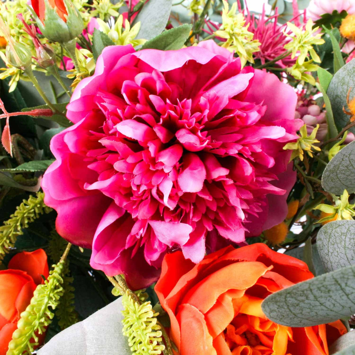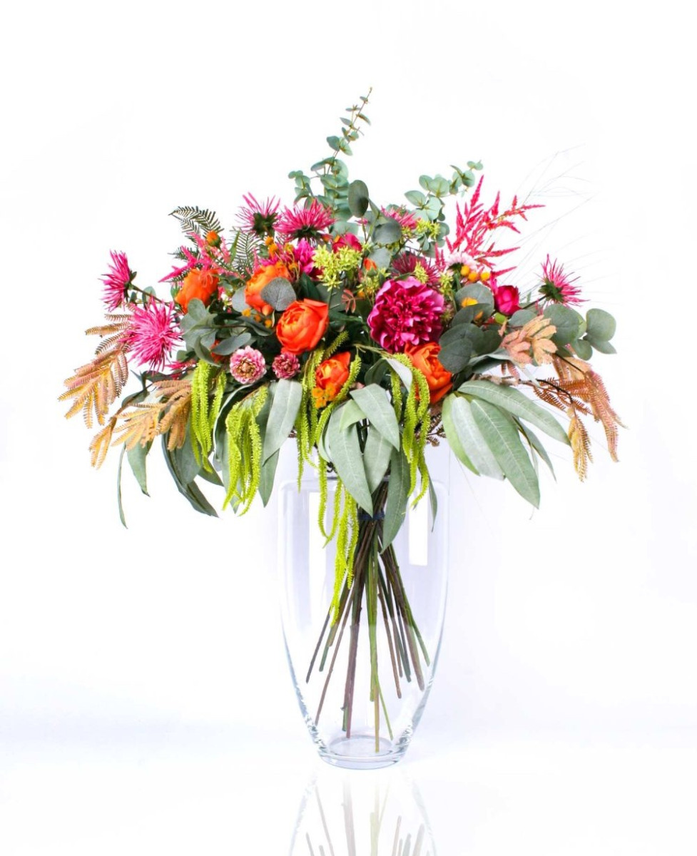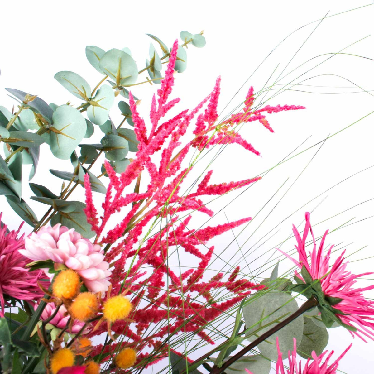 Coloratissimo bouquet artificiale! Natali ci ha mandato una mail chiedendoci se avremmo ricreato anche dei bouquet di fiori se ci avesse mandato una foto. Naturalmente abbiamo risposto in modo affermativo. Nel messaggio successivo di Natali, abbiamo ricevuto la foto del bouquet che desiderava, che aveva visto per caso in un ristorante. Un bouquet romantico e giocoso nei toni del rosa e del giallo. Le piaceva molto l'abbondanza e lo stile del bouquet, ma voleva che il suo mazzo, che avrebbe dovuto trovare posto nel suo nuovo appartamento, fosse in fucsia con un po' di arancione per armonizzarsi con il nuovo arredamento. Dopo 2 ore di ricerca nel nostro negozio e nel magazzino, abbiamo trovato i fiori giusti. Il primo esemplare ha avuto successo al primo colpo, ma mancava ancora un po' di verde fresco per dare al bouquet un tocco estivo e brillante. I ramoscelli corrispondenti ci sono capitati tra le mani per caso nel magazzino. Abbiamo aggiunto i rametti al bouquet e distribuito il verde tra i fiori colorati e il bouquet è stato un vero successo. Il bouquet è piaciuto subito alla nostra cliente, il che ci ha reso molto felici. Naturalmente, non volevamo privare gli altri clienti di questo bellissimo bouquet, quindi abbiamo scelto un vaso coordinato. Volete anche dare un nuovo splendore al vostro spazio abitativo? Acquistate il look!
