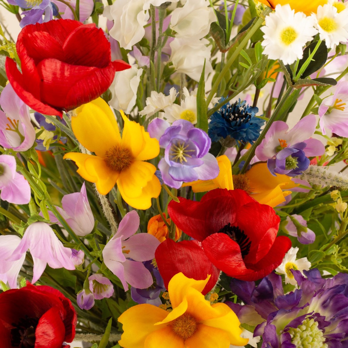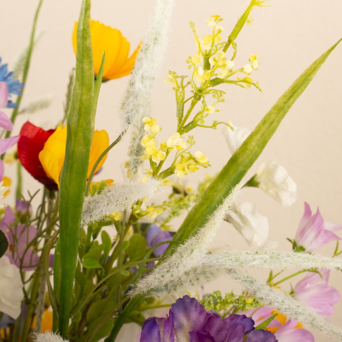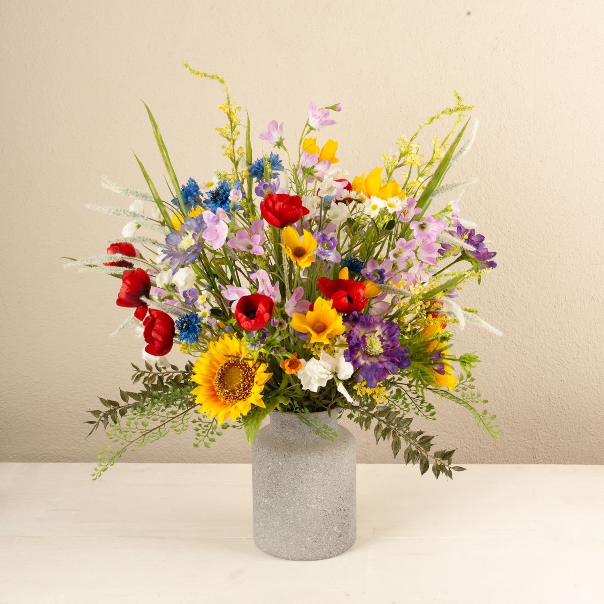 La cosa principale è il colore! I bouquet di fiori di prato sono molto di moda oggigiorno! Hartmut ha dovuto separarsi da un mazzo di fiori artificiali vecchio di 30 anni e aveva urgente bisogno di sostituirlo. Potrebbe essere un po' diverso, ma la cosa importante era che fosse un bouquet di un prato estivo che sembra così reale che quando lo guardi puoi sentire il ronzio delle api e degli insetti. Girasoli, papaveri e fiordalisi dovrebbero assolutamente essere lì e trasmettere la luminosità estiva.Acquista il look!
