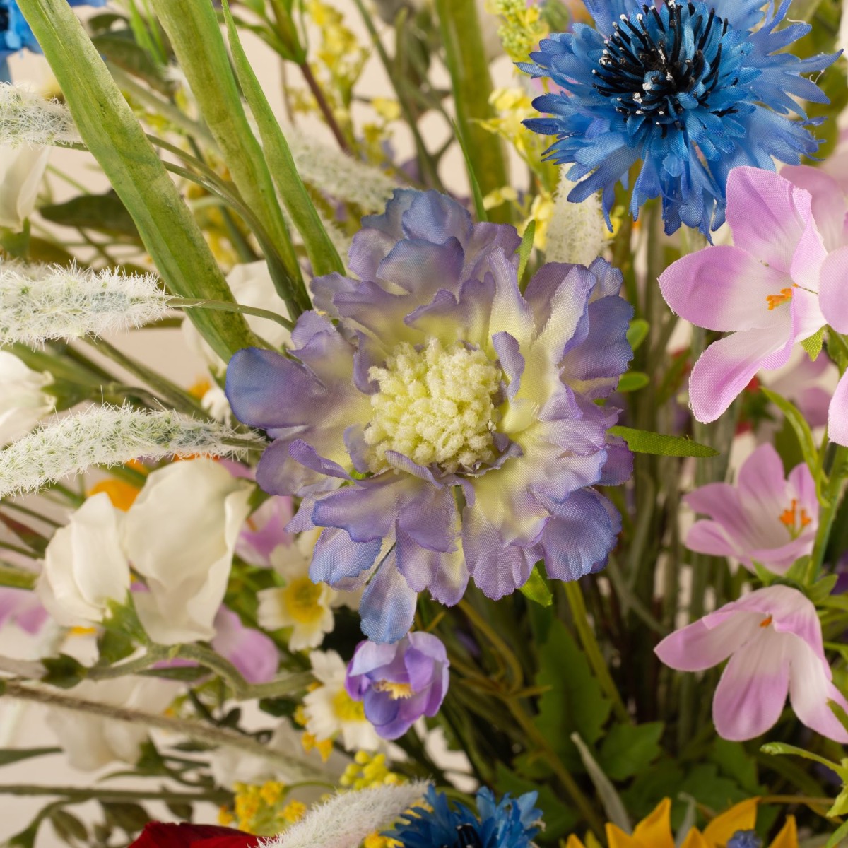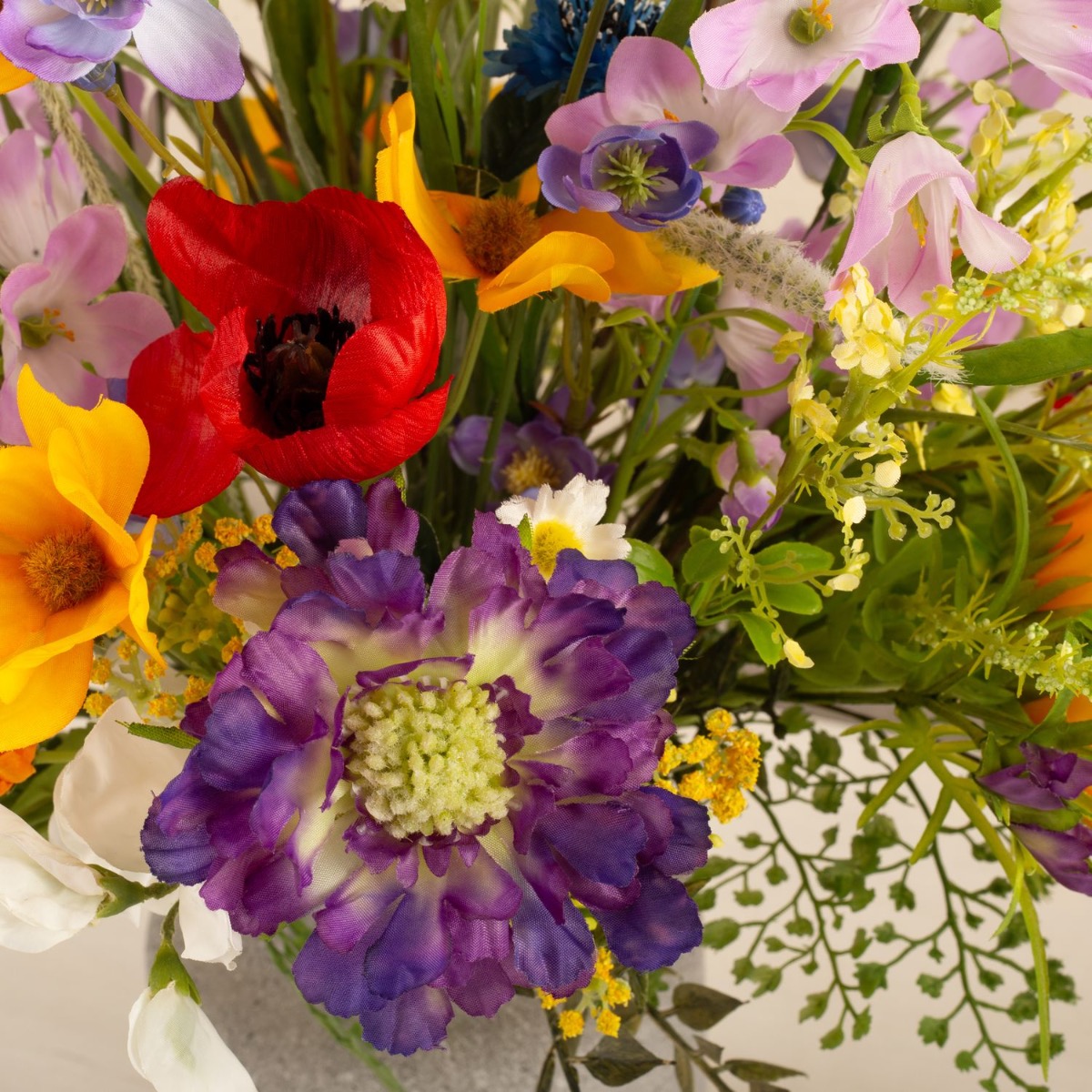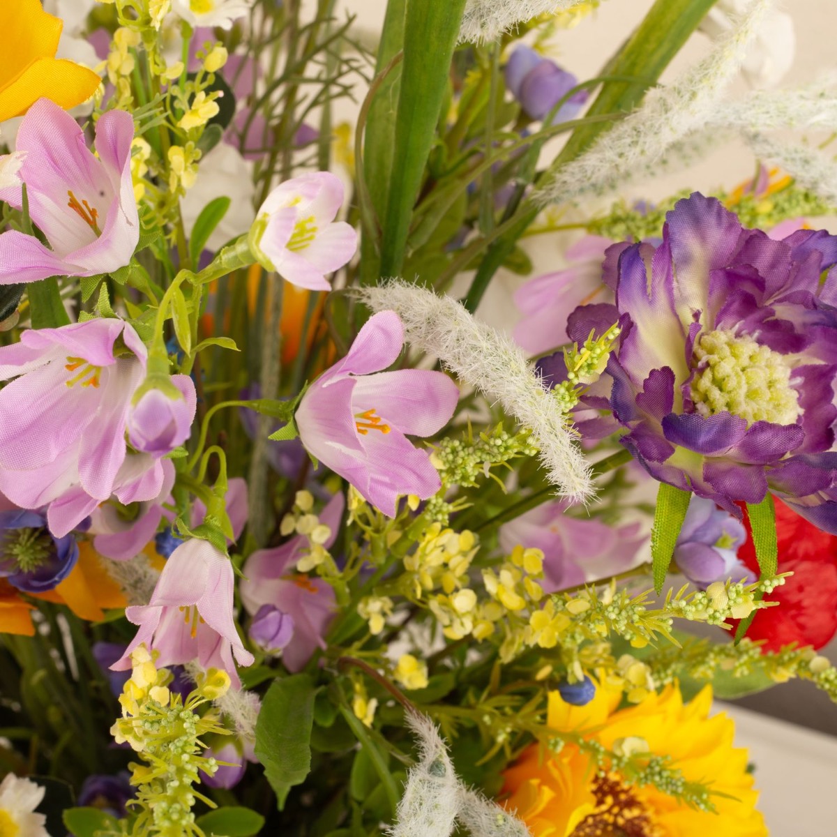 La cosa principale è il colore! I bouquet di fiori di prato sono molto di moda oggigiorno! Hartmut ha dovuto separarsi da un mazzo di fiori artificiali vecchio di 30 anni e aveva urgente bisogno di sostituirlo. Potrebbe essere un po' diverso, ma la cosa importante era che fosse un bouquet di un prato estivo che sembra così reale che quando lo guardi puoi sentire il ronzio delle api e degli insetti. Girasoli, papaveri e fiordalisi dovrebbero assolutamente essere lì e trasmettere la luminosità estiva.Acquista il look!