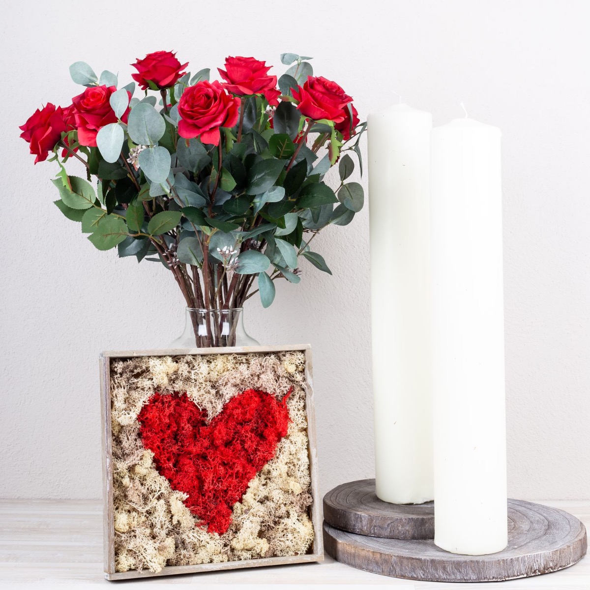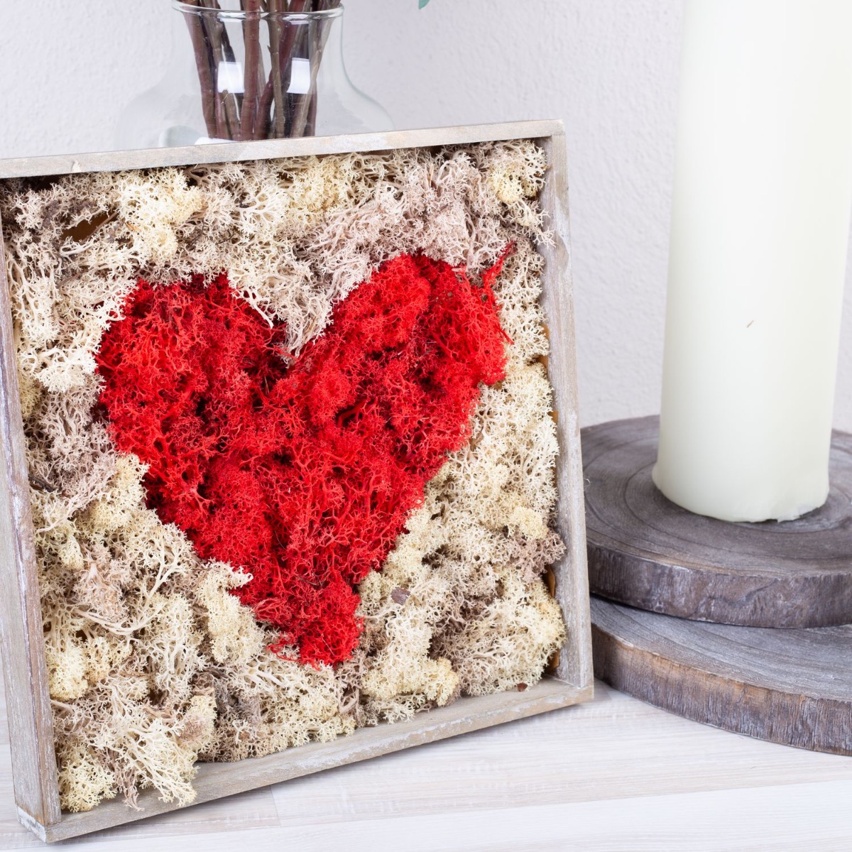 Suggerimento per il design: piega leggermente le rose e legali in un bouquet. Se necessario, accorciatelo alla dimensione di un vaso. Per il cuore di muschio naturale è necessaria una pistola per colla a caldo. Si inizia dal cuore e si attacca il muschio rosso naturale a forma di cuore sul vassoio di legno trasformato in cornice. Il contorno del cuore può essere un po' vago, il che crea un effetto naturale. Una volta che sei soddisfatto della forma del cuore, riempi il resto della cornice di legno con il secondo colore di muschio.