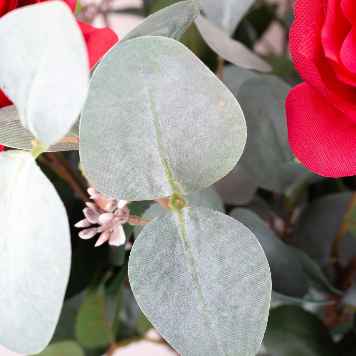 Un cuore e rose rosse! Non esiste dichiarazione d'amore migliore. Il bouquet di rose è composto da 12 rose tessili a stelo lungo racchiuse in un vaso di vetro in stile farmacia. I rami di eucalipto apportano un tocco fresco e colorato al bouquet. Il nostro cuore di muschio naturale fatto a mano non è solo bello da vedere a San Valentino o alla festa della mamma, ma ti ricorda anche a lungo l'amore e l'affetto del regalo. Acquista il look!