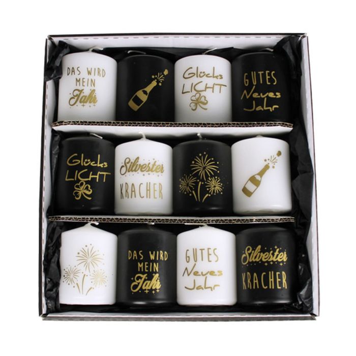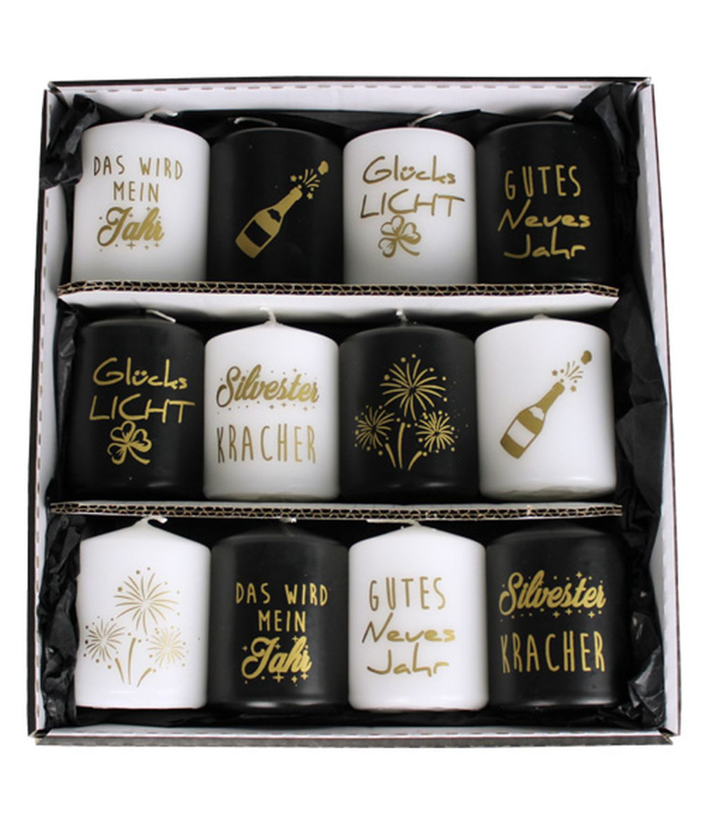 Candele di Capodanno OVILA, 12 pezzi, nero-bianco-oro, 8cm, Ø6cm - Made in Germany
