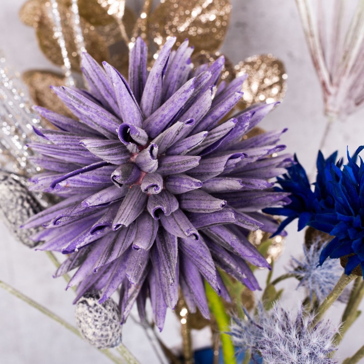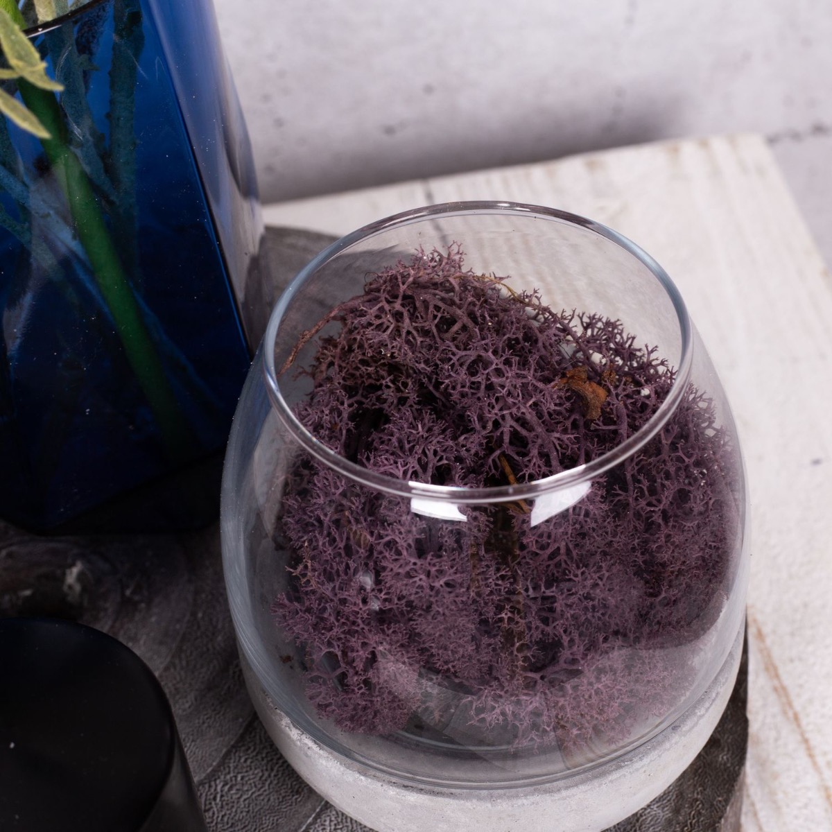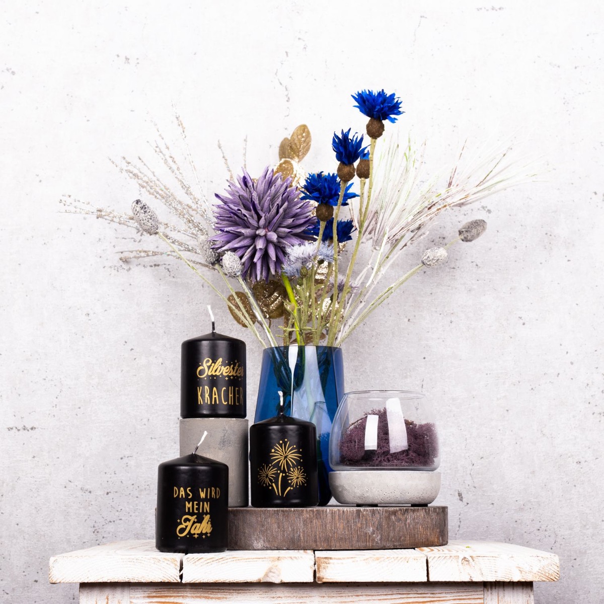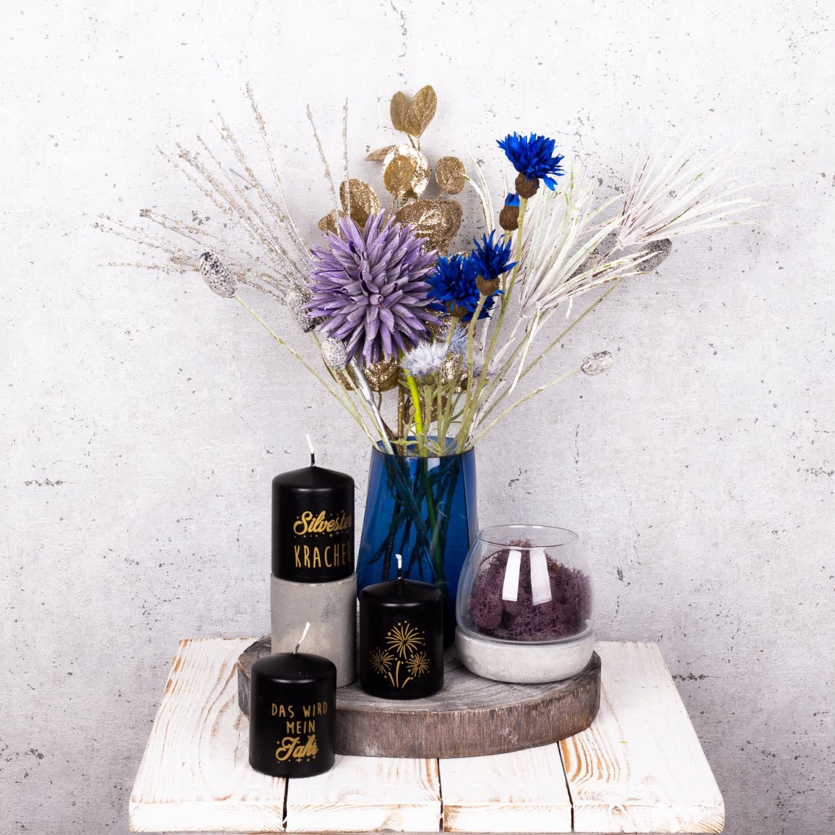 Viola e blu! Una combinazione di colori atipica che crea un'atmosfera invernale fresca e colorata. Con le candele di Capodanno, questo look è perfetto per una festa di San Silvestro per concludere l'anno insieme. Il piccolo bouquet di fiordalisi blu e un allium lilla sembra già un piccolo fuoco d'artificio, sottolineato dai rami di pino ghiacciati e dal ramo di pino scintillante. Abbiamo riempito il vaso di candele con una base di cemento con muschio naturale in tinta. Che la festa abbia inizio. Acquista il look!