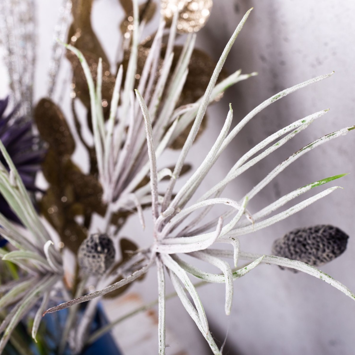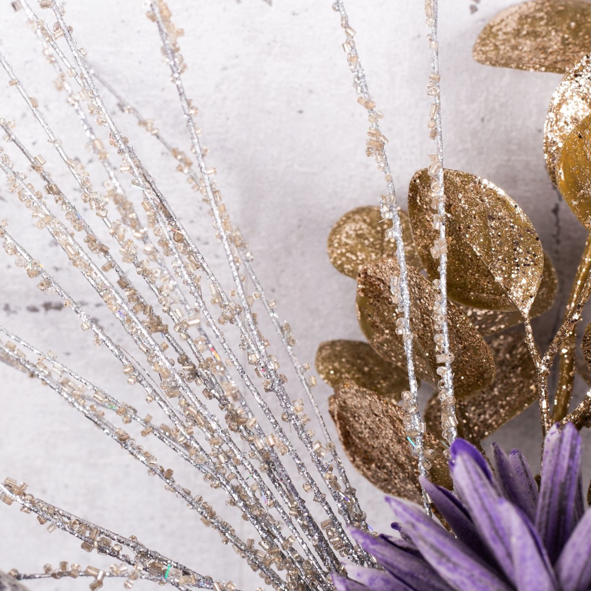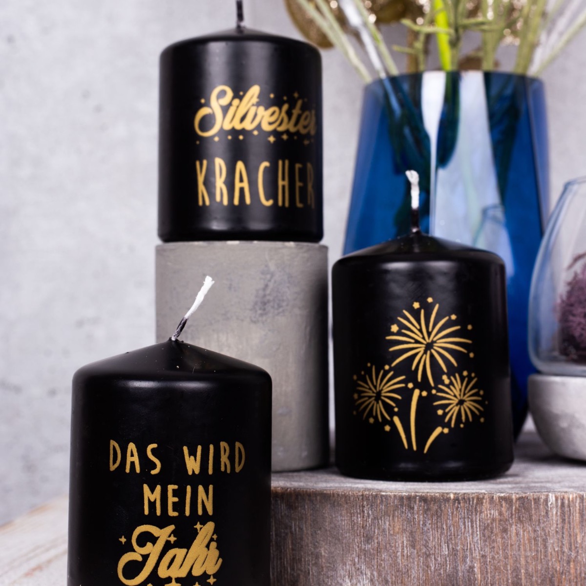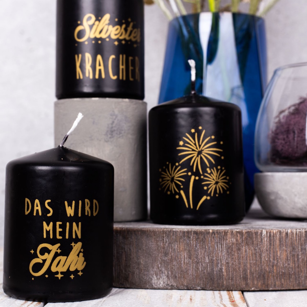 Viola e blu! Una combinazione di colori atipica che crea un'atmosfera invernale fresca e colorata. Con le candele di Capodanno, questo look è perfetto per una festa di San Silvestro per concludere l'anno insieme. Il piccolo bouquet di fiordalisi blu e un allium lilla sembra già un piccolo fuoco d'artificio, sottolineato dai rami di pino ghiacciati e dal ramo di pino scintillante. Abbiamo riempito il vaso di candele con una base di cemento con muschio naturale in tinta. Che la festa abbia inizio. Acquista il look!