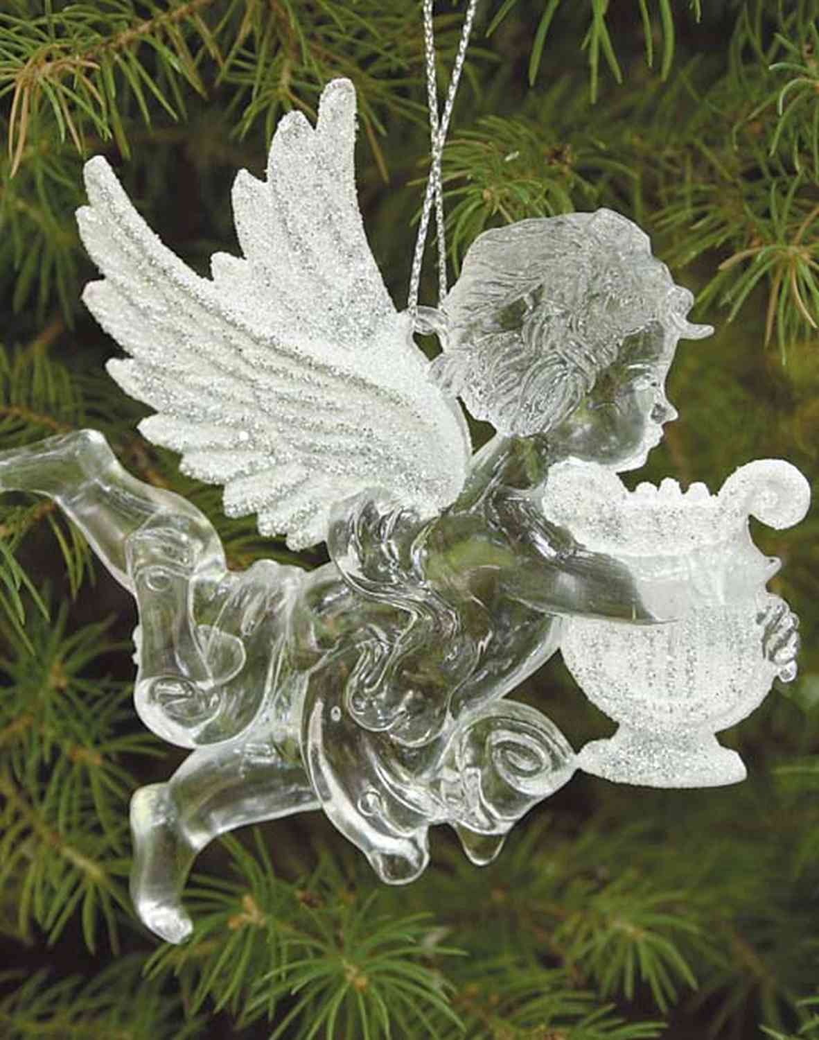 Ciondolo acrilico di angelo LINDY, 2 pezzi, arpa, lira, glitter, bianco-argento, 9x10cm