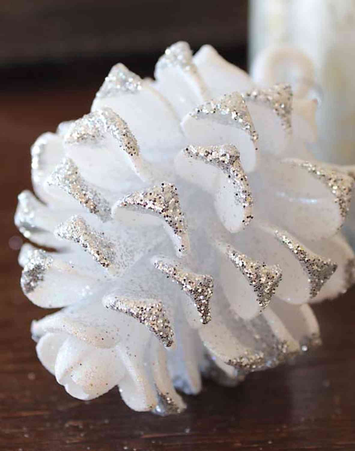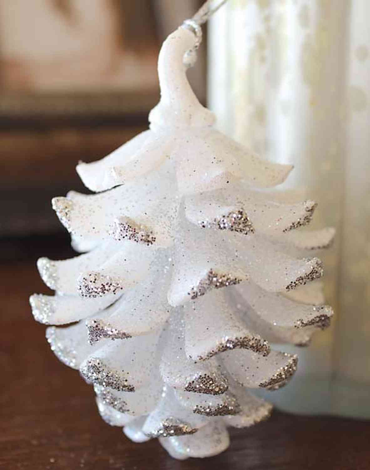 Ciondolo acrilico di pigna di abete CATHARINA, glitter, bianco-argento, 9cm, Ø7cm