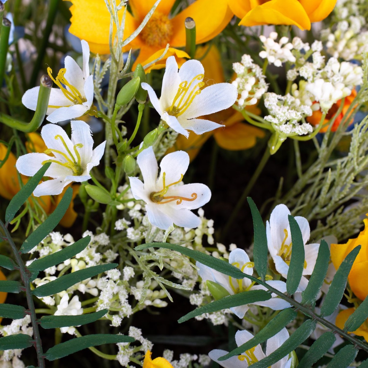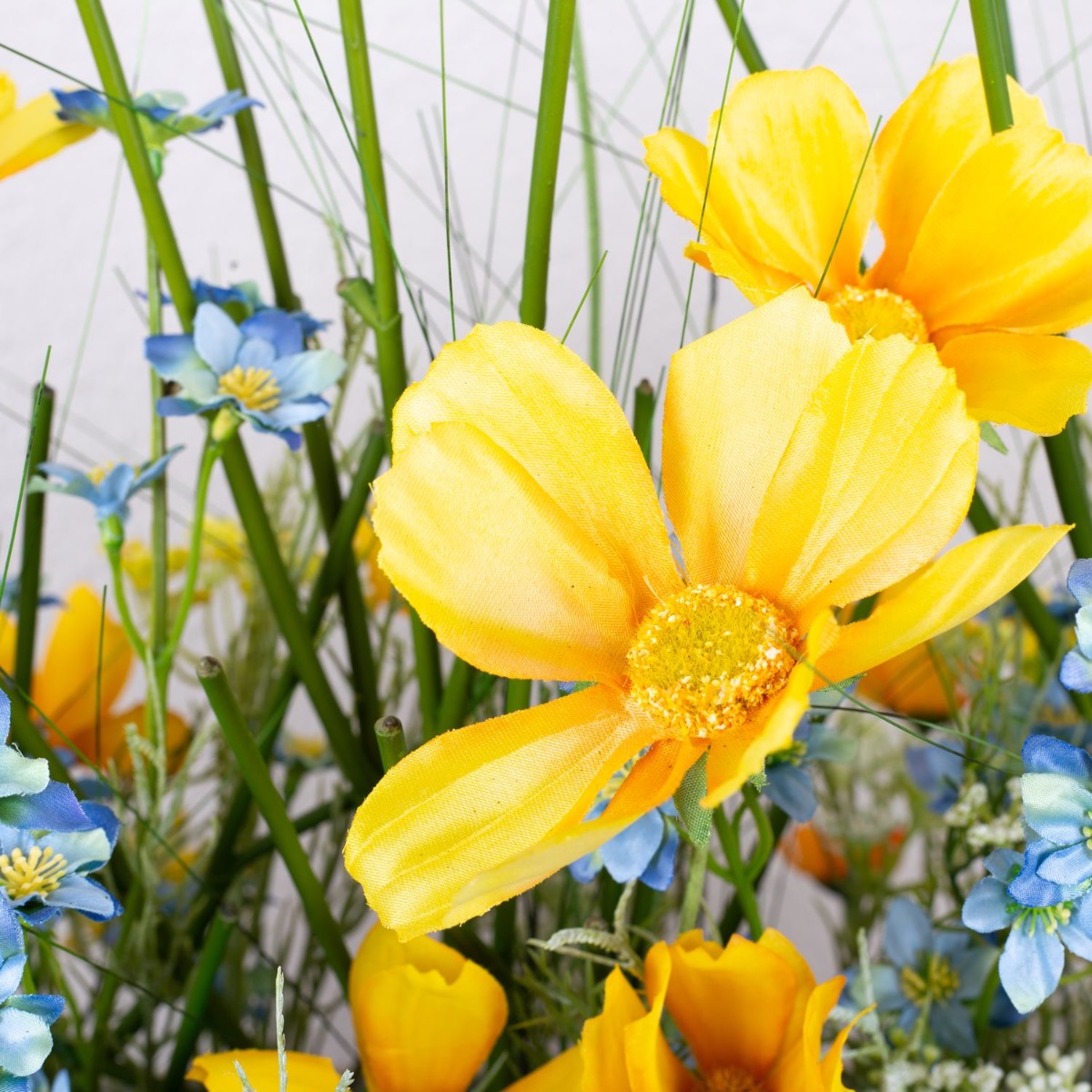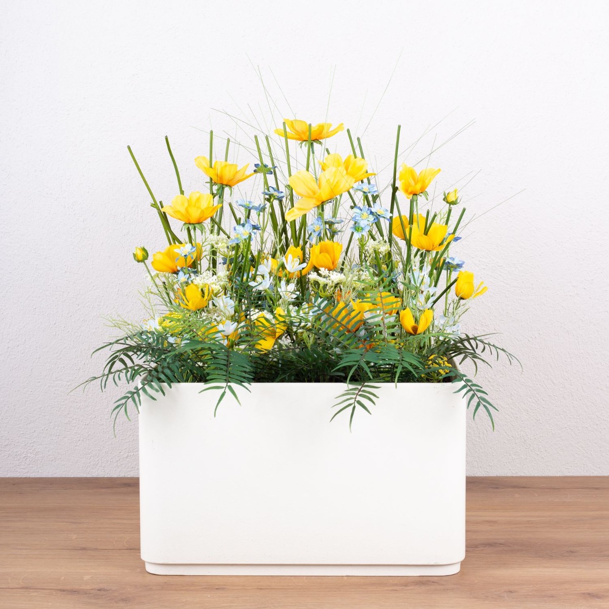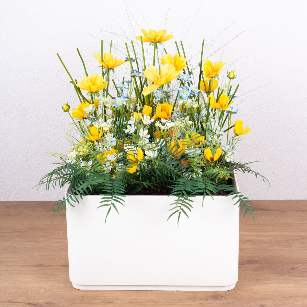 Il tuo progetto è la nostra sfida! Soprattutto quando il compito non pone limiti alla creatività. Jörg è venuto da molto lontano per portarci i vasi che avremmo riempito con le nostre piante artificiali. Ha portato anche alcune foto della sua casa perché voleva che i colori corrispondessero. In questa disposizione della camera da letto, in primo piano c'è il giallo brillante Cosmea, detto anche cosmo. Non solo sono belli, ma hanno anche un significato meraviglioso. Difendono la pace! Chi non lo vuole a casa propria? La delicata aquilegia azzurra si inserisce perfettamente nella zona notte e simboleggia, tra l'altro, la seduzione e l'amore. Non vediamo l'ora di affrontare la prossima sfida che Jörg ci riserva. Acquista il look!