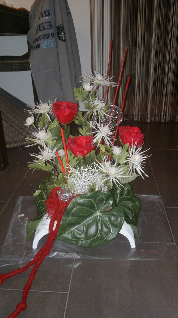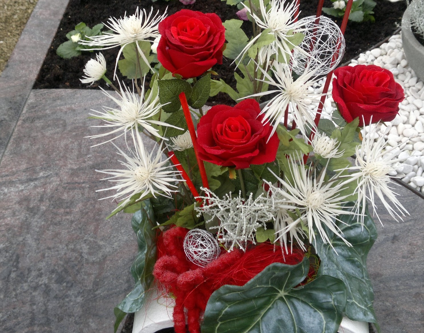 Fiori in onore dei defunti! Rosso e bianco: colori molto amati per il bouquet nuziale, ma anche per la tomba. Lo ha pensato anche la nostra cliente Kornelia, che ha scelto rose e crisantemi in questi colori come fiori per la composizione floreale realizzata con amore per la tomba. Foglie di anthurium, erba e altri materiali decorativi completano la composizione floreale per il cimitero. Acquista il look!