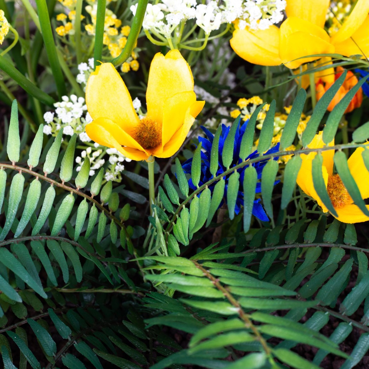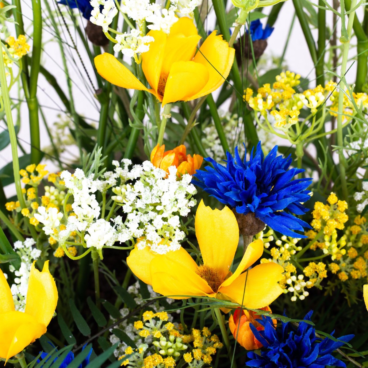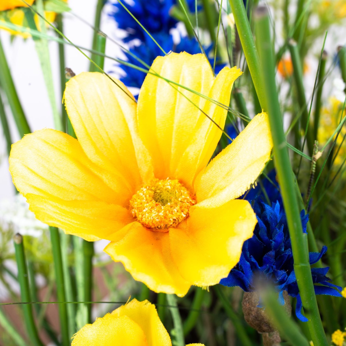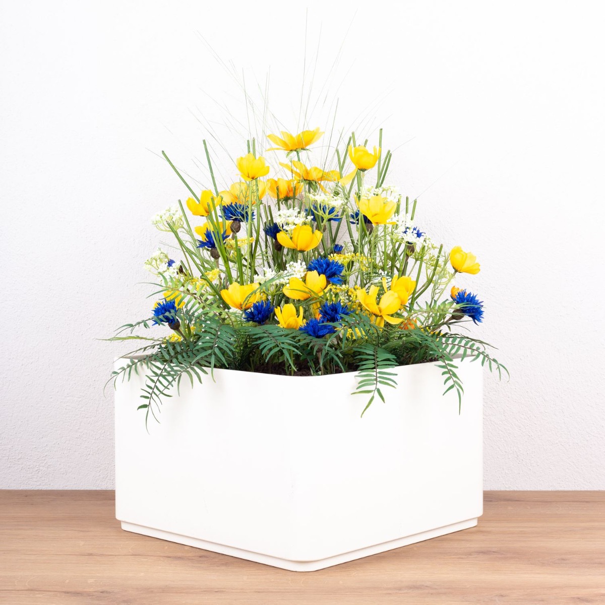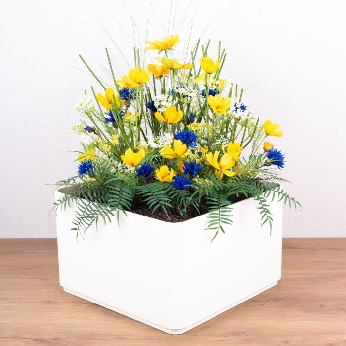 Il tuo progetto è la nostra sfida! Soprattutto quando il compito non pone limiti alla creatività. Jörg è venuto da molto lontano per portarci i vasi che avremmo riempito con le nostre piante artificiali. Ha portato anche alcune foto della sua casa perché voleva che i colori corrispondessero. Il giallo segnale e il blu scuro dovrebbero essere i colori predominanti. In questa disposizione i colori preferiti di Jörg sono stati perfettamente implementati e combinati per creare una disposizione armoniosa. Il giallo brillante Cosmea, noto anche come cosmo, non solo ha un bell'aspetto, ma ha anche un significato meraviglioso. Difendono la pace! Chi non lo vuole a casa propria? Anche i fiordalisi blu hanno un simbolismo speciale. Rappresentano la bellezza e la purezza. Questo si adatta molto bene a Jörg, dato che lavora così duramente per avere una bella casa. Acquista il look!