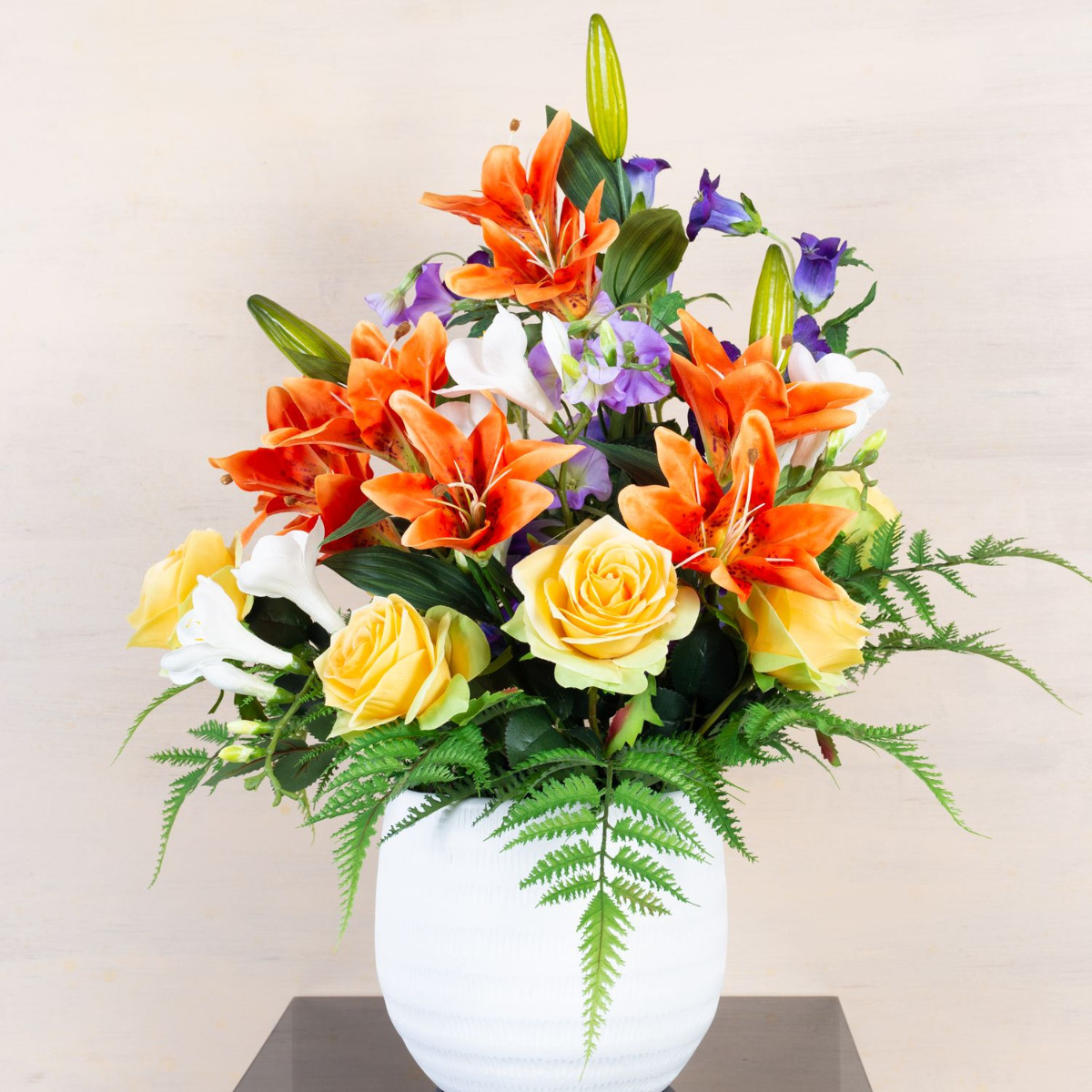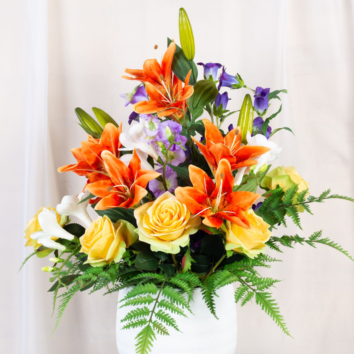 Composizione funebre per una persona cara! Pamela aveva trovato su Internet una foto di una composizione funebre che le era piaciuta molto. Ci ha chiesto se potevamo preparare un tale bouquet finto. La combinazione di colori arancione-giallo-viola era particolarmente importante per lei. Il tipo di fiori non era così importante per lei, ma gigli, rose e gladioli andavano bene. Armati di questi indizi, siamo andati sul campo e abbiamo scoperto che i gladioli erano semplicemente troppo frondosi per la disposizione desiderata. Invece, abbiamo scelto delle audaci campanule viola come sostituto delle pannocchie. Protagonista della scenografia floreale è stato senza dubbio il giglio. Per questa parte abbiamo usato gigli tigre arancione brillante. Rose gialle completavano il bouquet artificiale. L'ipomoea viola e le fresie bianche hanno fornito la necessaria pienezza al bouquet decorativo. Una cornice di rami di felce spada completava l'insieme. Le abbiamo inviato alcune foto come suggerimento. Pamela ci ha poi chiesto di sostituire le rose gialle brillanti con una versione più chiara. Il cliente è stato felicissimo, quindi siamo riusciti a completare l'ordine. Vuoi anche una composizione floreale artificiale? (Tieni presente che le piante artificiali possono perdere la loro longevità a causa della luce solare e del tempo) Acquista il look!
