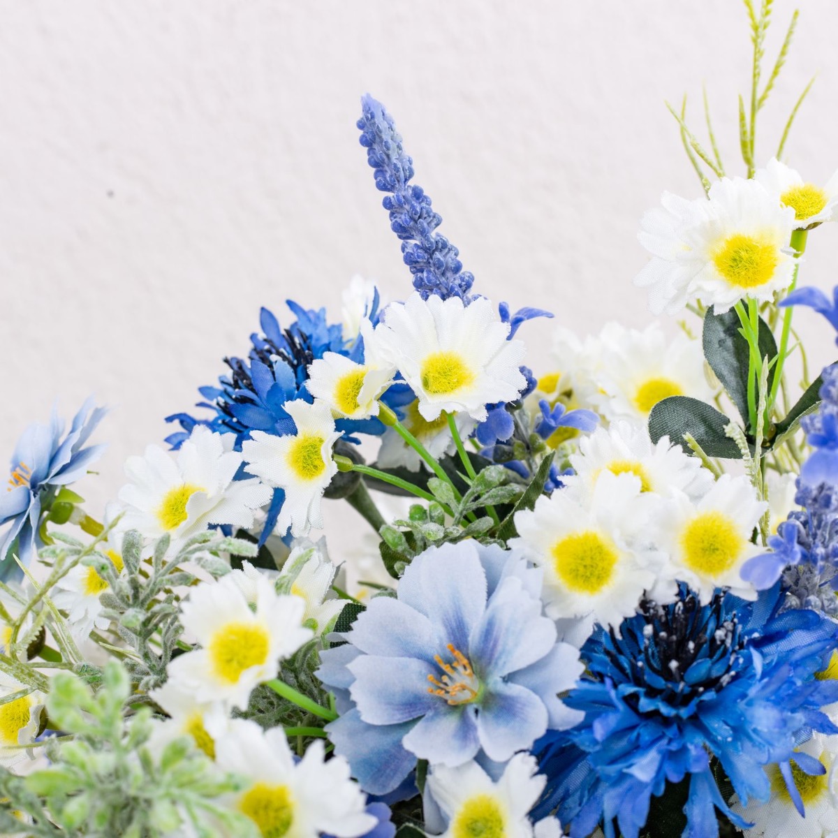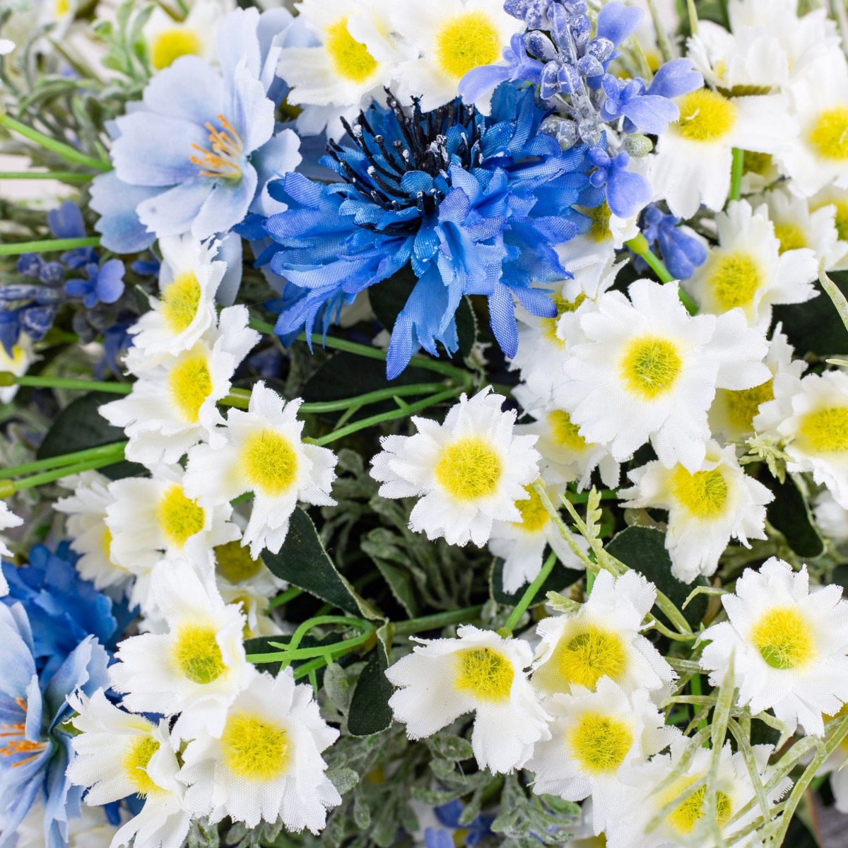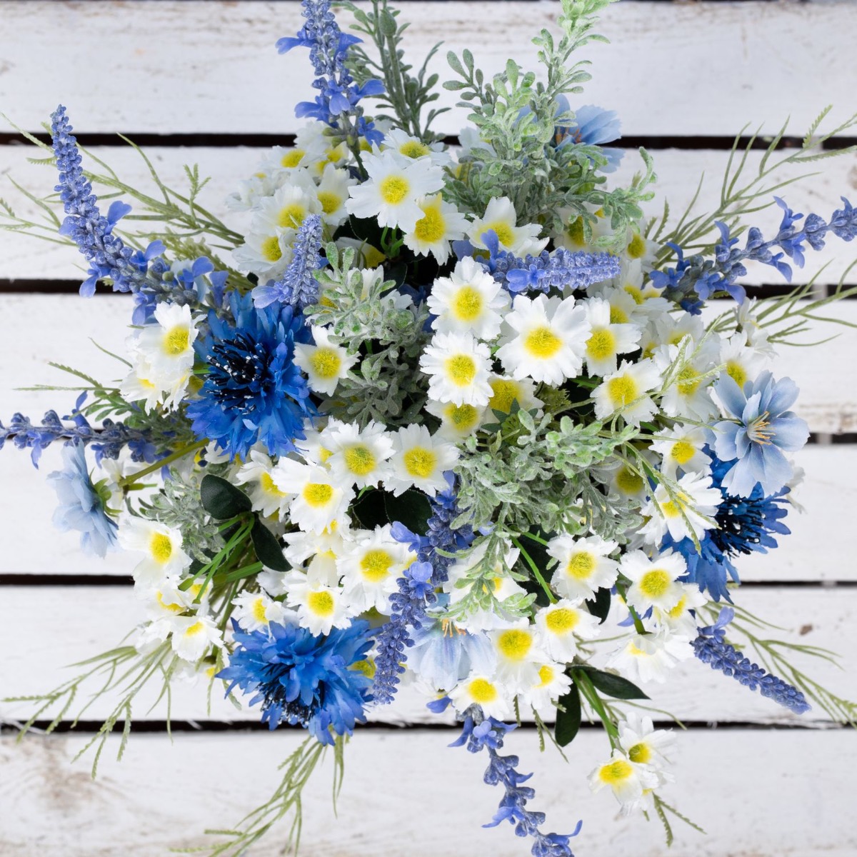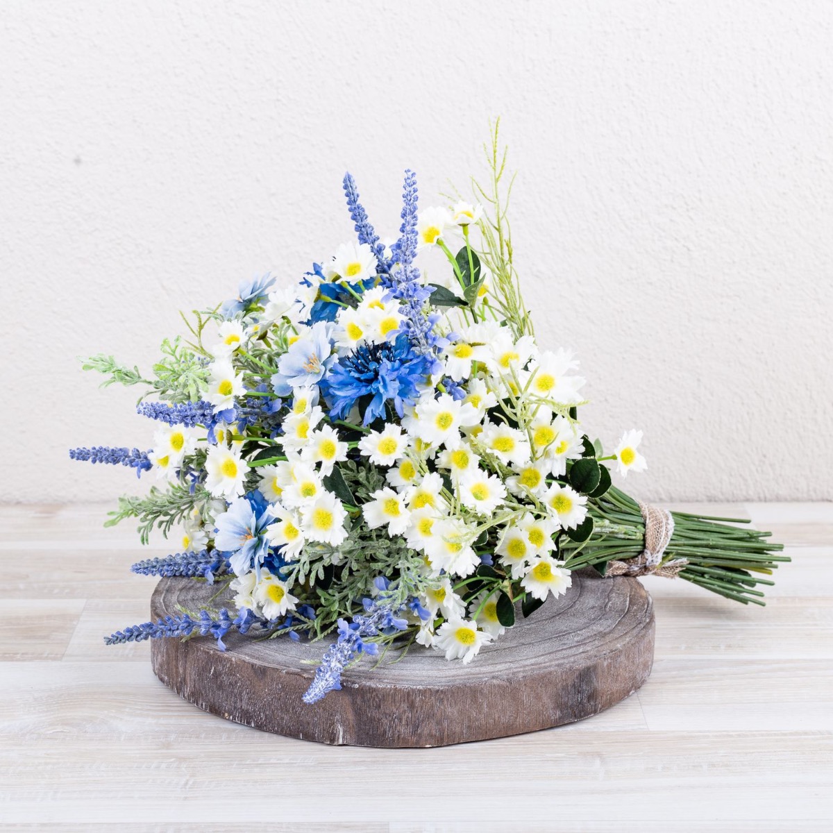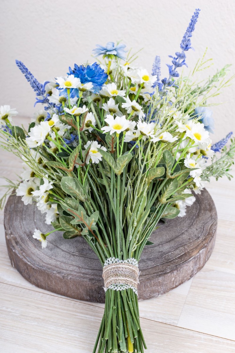 Blu e bianco! Questo è un mazzo di fiori bavarese. Questo è stato ispirato dal bouquet da sposa di uno dei nostri dipendenti. Fiordalisi blu brillante, delicate margherite e lavanda adornano questo straordinario bouquet da sposa ed evocano un tocco romantico alla celebrazione. La lavanda rappresenta la purezza del cuore. Le margherite rappresentano il vero amore e i fiordalisi indicano il futuro positivo. Un nastro di iuta marrone con pizzo bianco sottolinea l'aspetto rurale della speranza. Una giornata meravigliosa!Acquista il look!