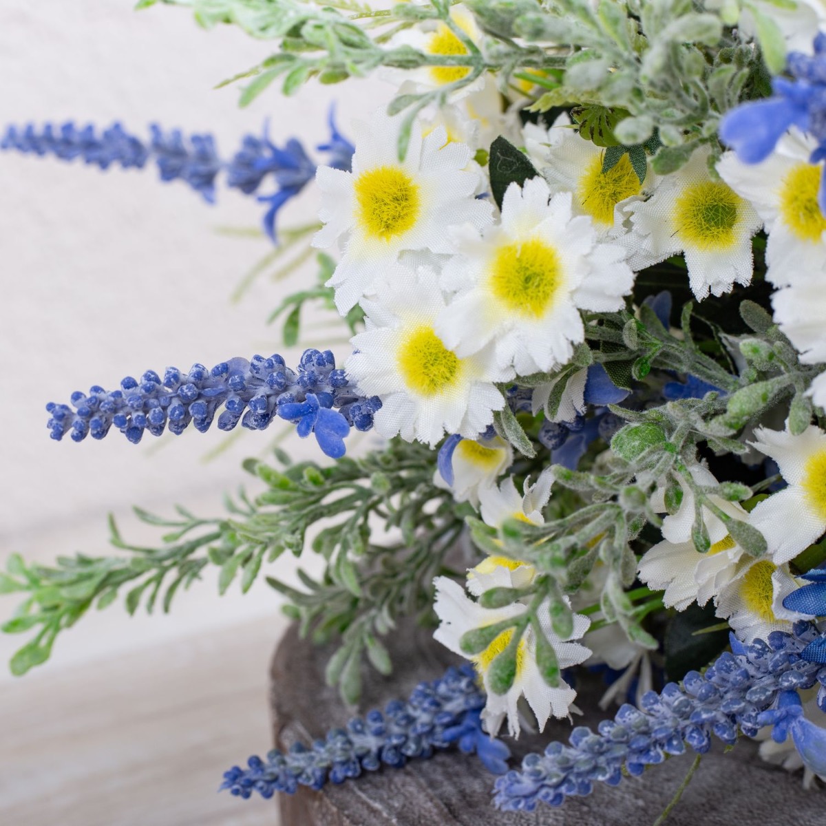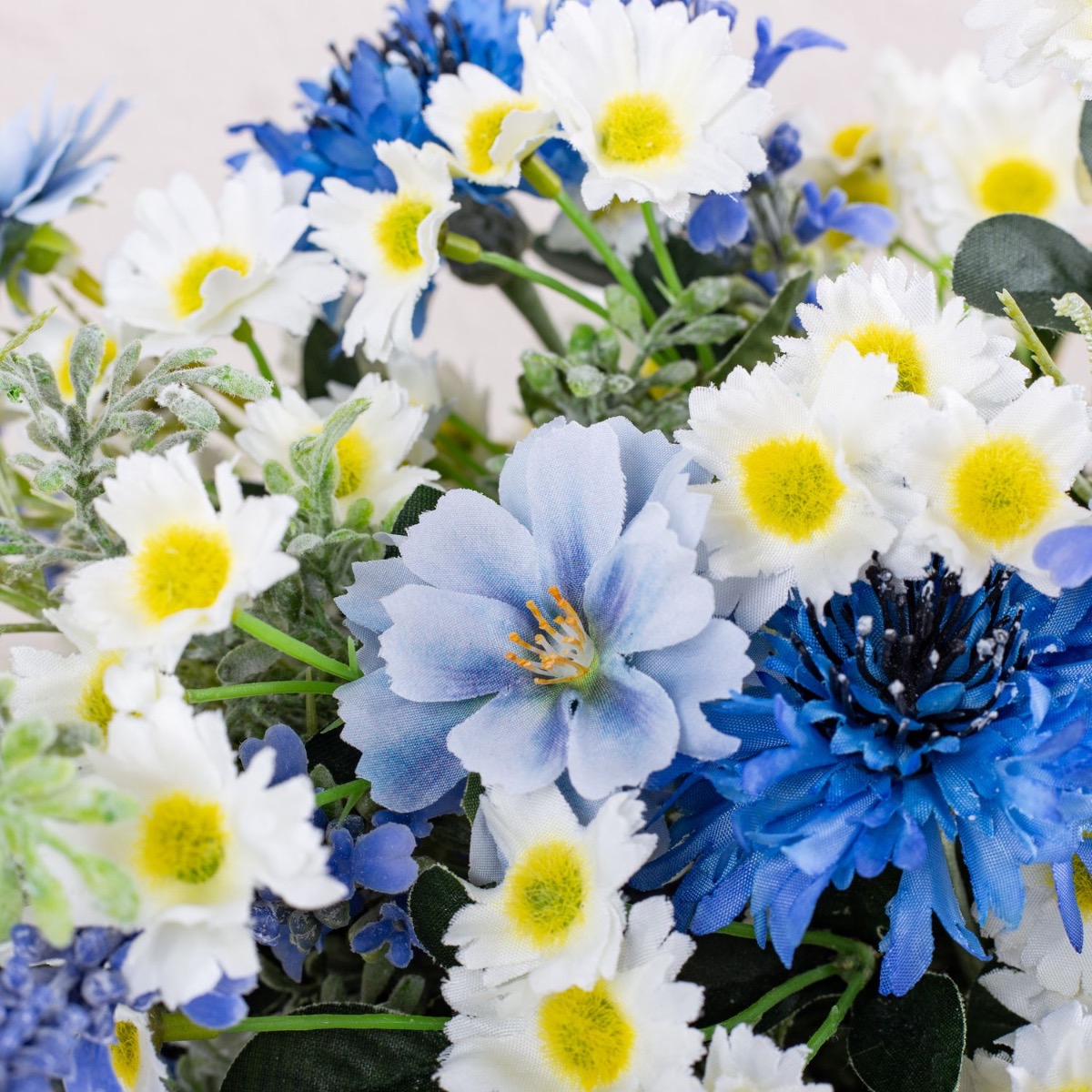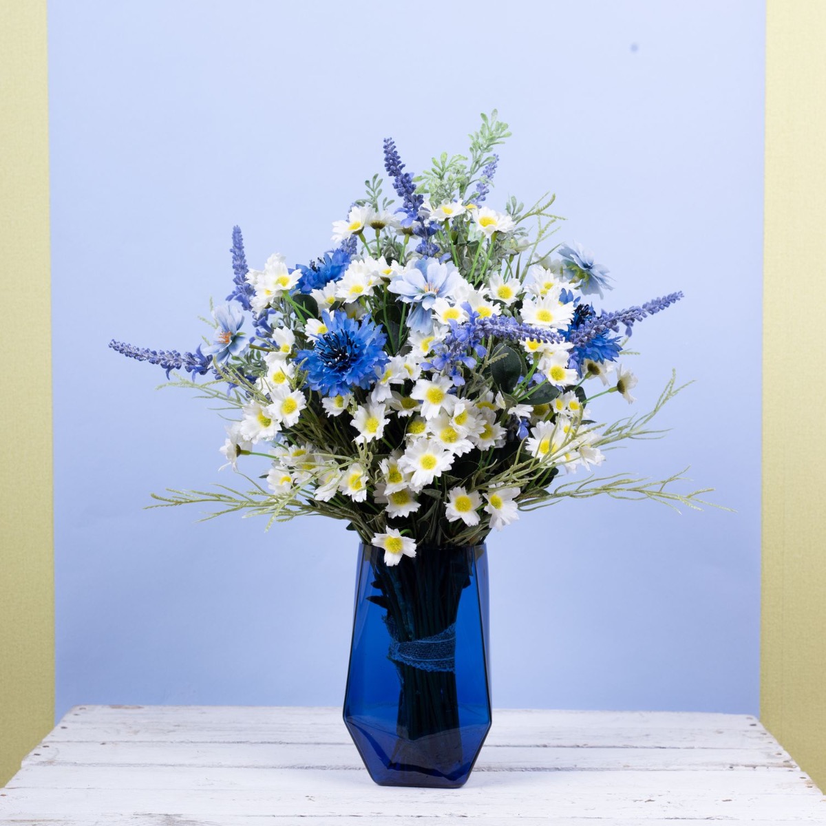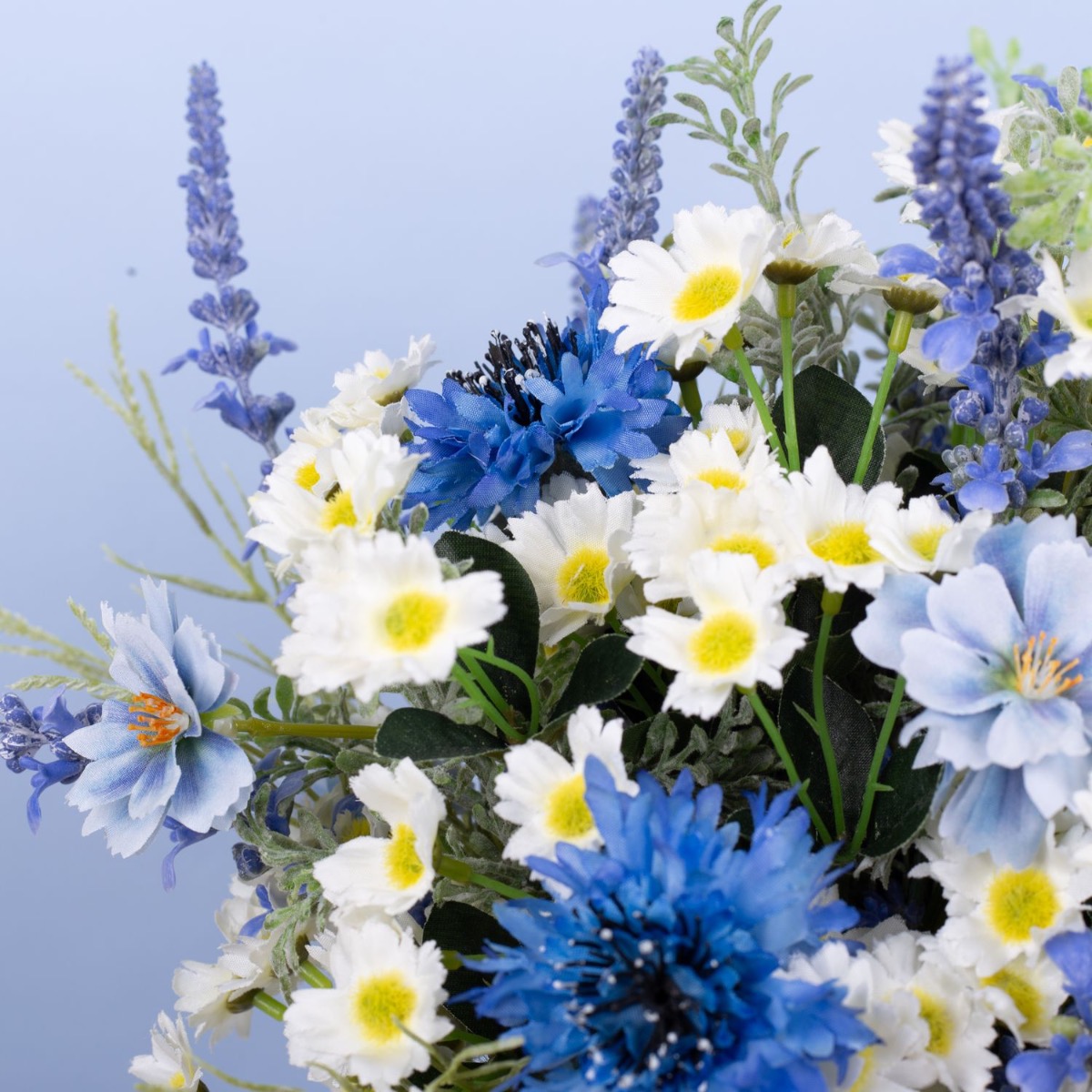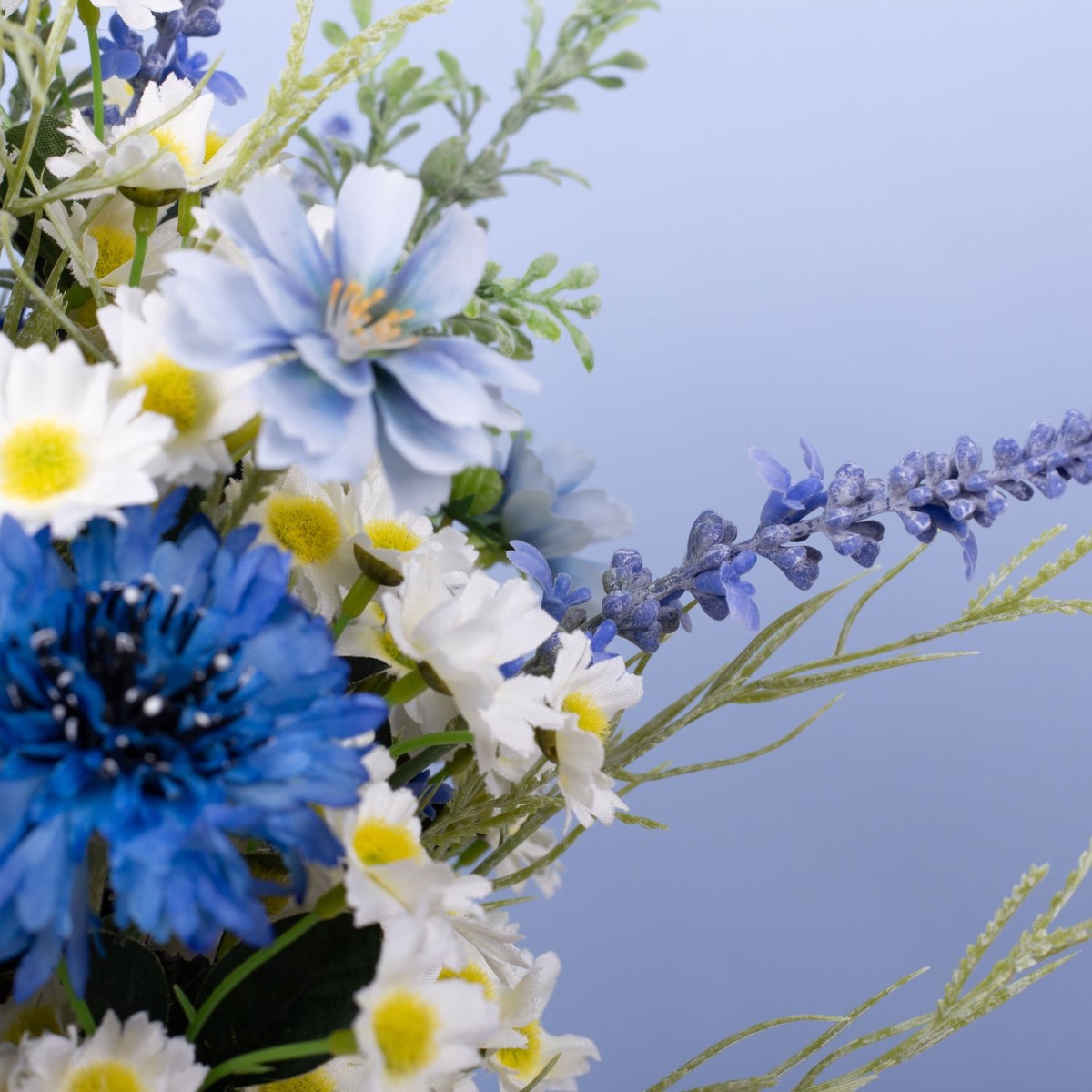 Blu e bianco! Questo è un mazzo di fiori bavarese. Questo è stato ispirato dal bouquet da sposa di uno dei nostri dipendenti. Fiordalisi blu brillante, delicate margherite e lavanda adornano questo straordinario bouquet da sposa ed evocano un tocco romantico alla celebrazione. La lavanda rappresenta la purezza del cuore. Le margherite rappresentano il vero amore e i fiordalisi indicano il futuro positivo. Un nastro di iuta marrone con pizzo bianco sottolinea l'aspetto rurale della speranza. Una giornata meravigliosa!Acquista il look!