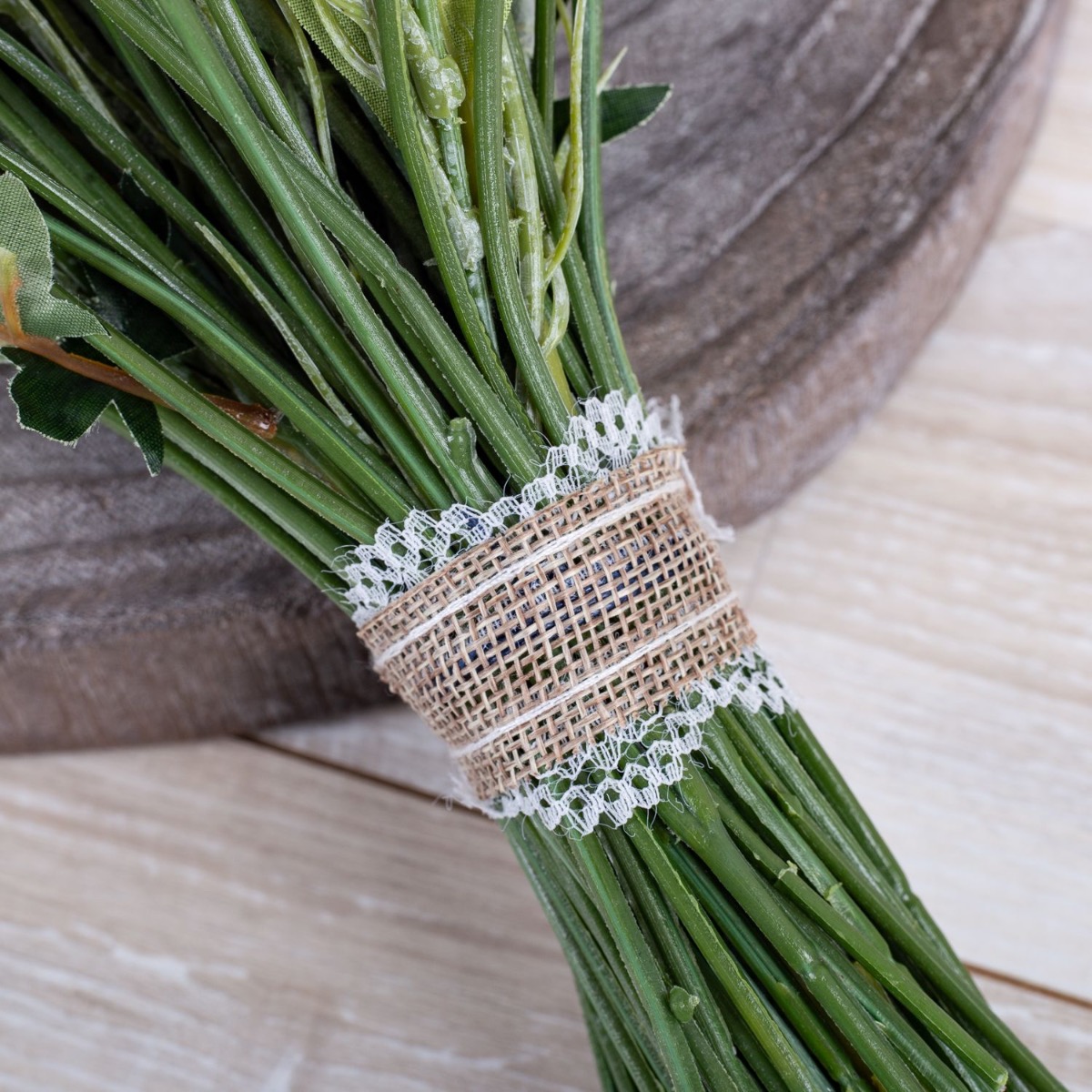 Suggerimento per il design: questo bouquet è facile da annodare perché gli piace sembrare selvaggio. Dapprima si piegano i singoli rami per dargli forma; Tagliamo anche alcuni rami. Quindi inizi a posizionare alternativamente i diversi fiori. Assicurati che i fiori accattivanti siano distribuiti uniformemente! Legatela poi bene con un filo di ferro e ricopritela con il nastro di iuta. Accorcia le estremità alla stessa lunghezza.