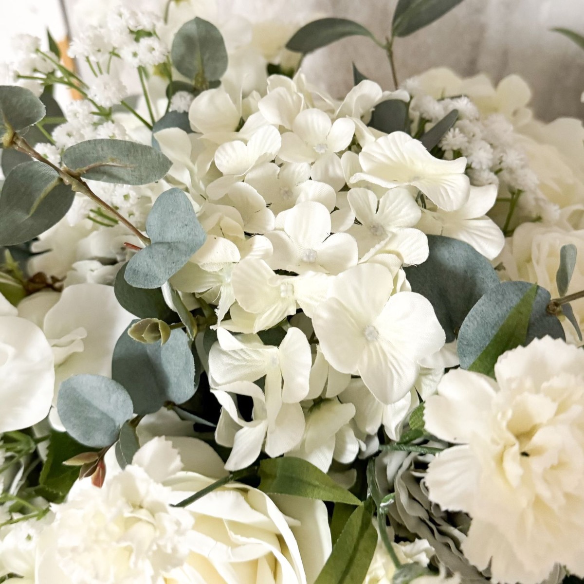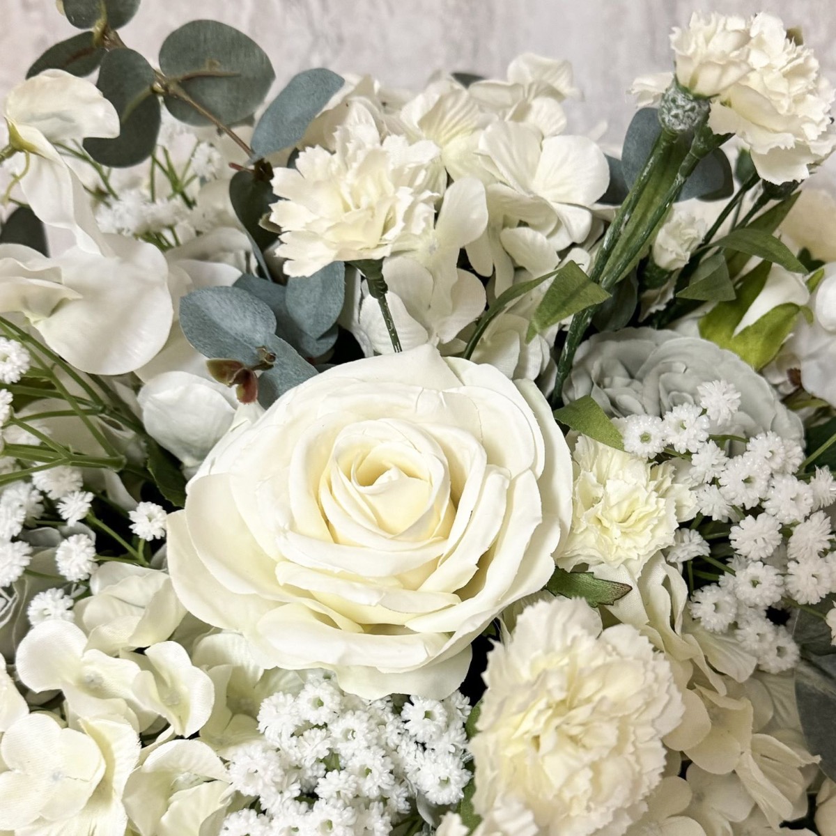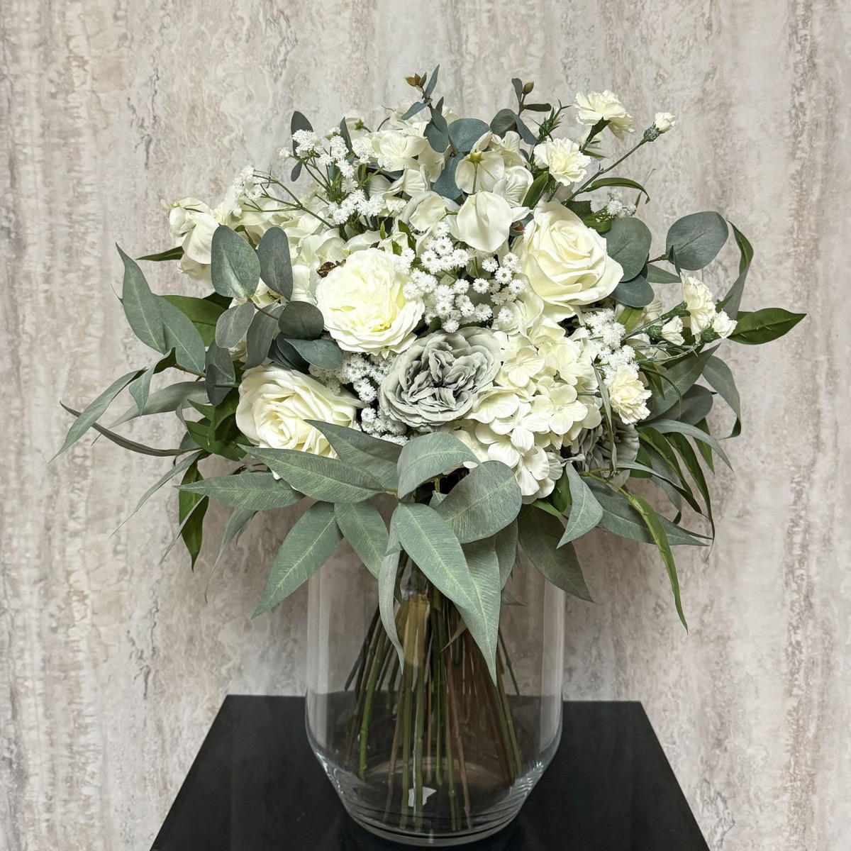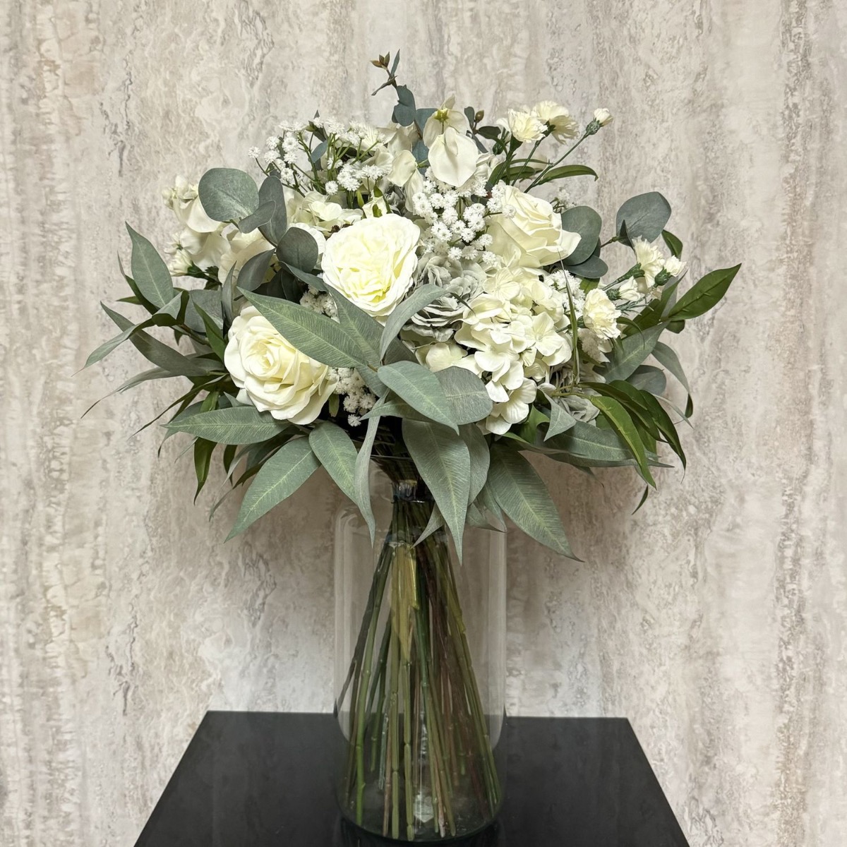 Voluminoso ed elegante! Ad un altro nostro cliente è piaciuto molto il bouquet cliente che Ghita Marine aveva già realizzato. Voleva solo che fosse molto più voluminoso. Per preservare la bellezza originale della composizione floreale, prendiamo esattamente gli stessi fiori e ne aumentiamo semplicemente il numero. Legare il bouquet è stata una vera sfida perché la quantità di fiori stava a malapena in una mano. Il bouquet crebbe e crebbe fino a diventare un'attrazione impressionante. Circa a metà del lavoro, ciò che era già stato fatto è stato legato con una corda. Questo è stato seguito dai restanti fiori e rami di foglie fino al completamento. La sobria combinazione di colori del bouquet è quasi senza tempo, ma attira comunque l'attenzione grazie alle sue dimensioni gigantesche. Vuoi anche tu un outfit floreale così carino? Acquista il look!