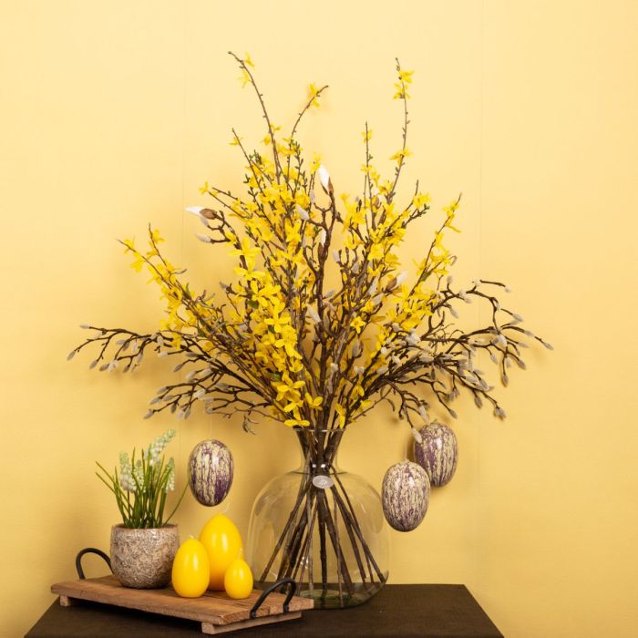 Semplice e naturale! Il lungo inverno è finalmente finito e i primi raggi di sole evocano i primi fiori in natura. Finalmente sta tornando il caldo! Le magnolie e i rametti di betulla sembrano raccolti a mano e sono perfetti per appendere qualche uovo di Pasqua. I giacinti bianchi sono davvero rari da vedere in natura. Qui si abbinano particolarmente bene ai boccioli bianchi e soffici della magnolia. Abbiamo arricchito questo look con 5 rami di forsizia gialla. Si vede che la Pasqua è sempre più vicina. Acquistate il look!
