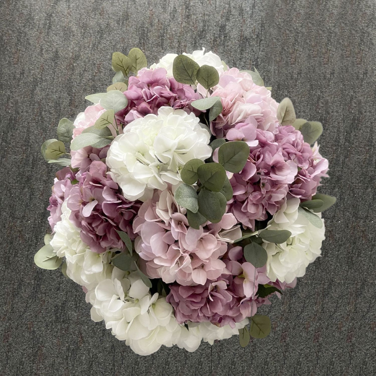 Un mare sferico di fiori! Per il design di due magnifici vasi in malachite, abbiamo ricevuto una richiesta dal nostro cliente Hans Peter. Aveva già un'idea precisa della disposizione. Sarebbe stata una palla di fiori composta da splendidi fiori di ortensia allineati uno accanto all'altro. I colori scelti sono stati rosa, viola e bianco. Dopo una preselezione dei fiori, il cliente ci ha inviato gli inserti dei vasi progettati. Questo ci ha permesso di tagliare il composto esattamente alla misura delle ciotole e accorciare di conseguenza le ortensie per ancorarle in esse. Certo, non poteva mancare un po' di vegetazione. La scelta è ricaduta sui rami di eucalipto grigioverde, che abbiamo lasciato sbirciare tra i fiori. Abbiamo inviato al nostro cliente alcune foto della nostra prima copia. Hans Peter è stato felicissimo e ci ha incaricato di creare la seconda ciotola identica. Vuoi anche una composizione floreale artificiale? Acquista il look!