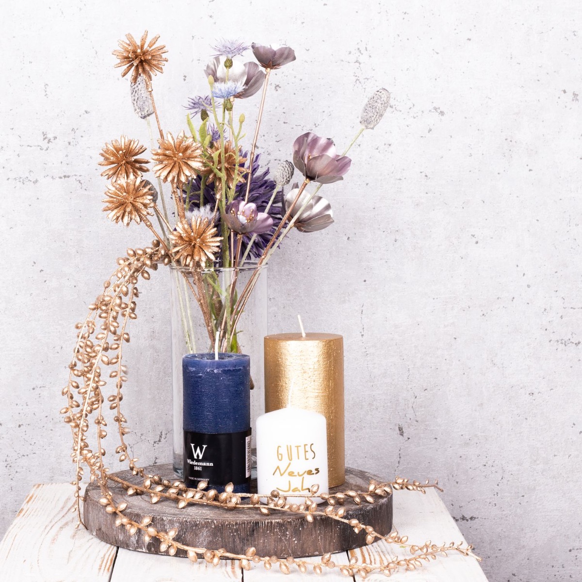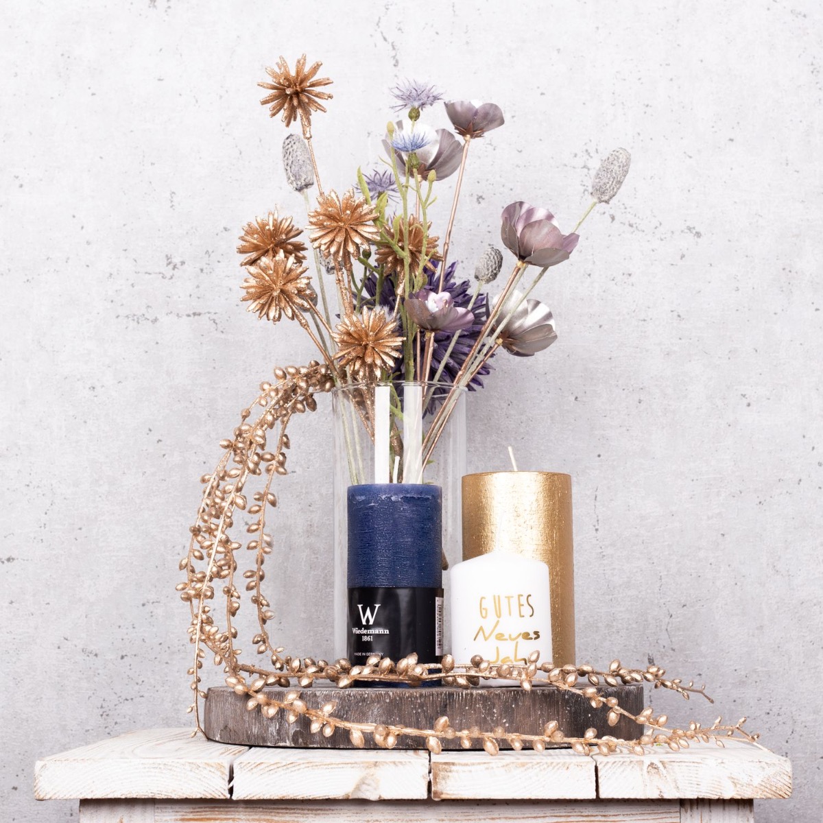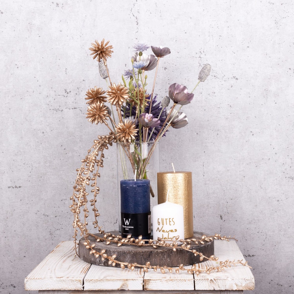 Consiglio di design: Tagliare i fiori a misura di vaso e posizionarli nel vaso. Il ciondolo di senecio dorato deve serpeggiare verso il basso e giocare intorno alle candele. Posizionare le candele in modo che la fiamma non sia troppo vicina ai fiori artificiali.