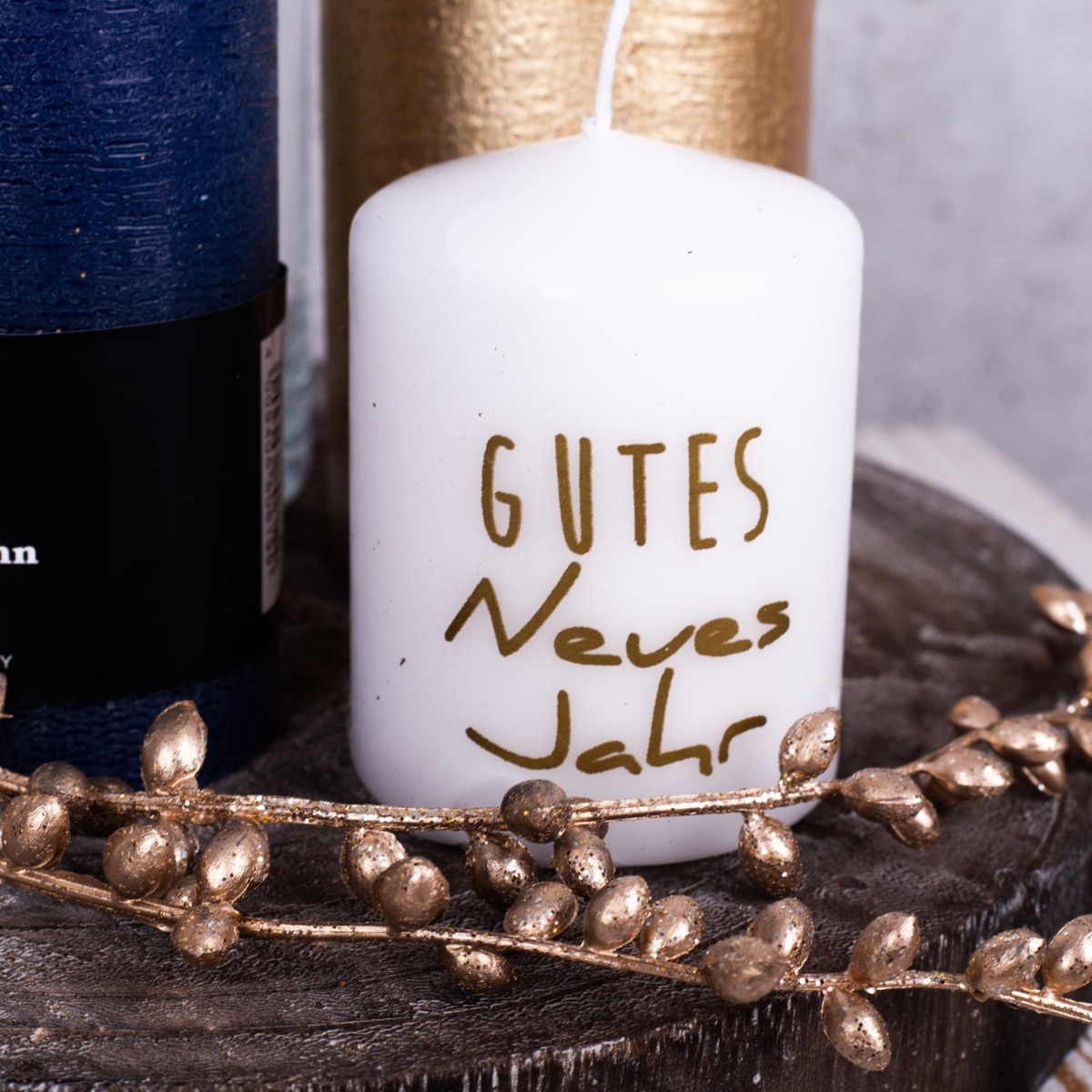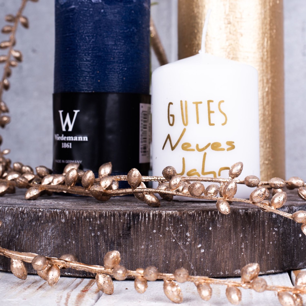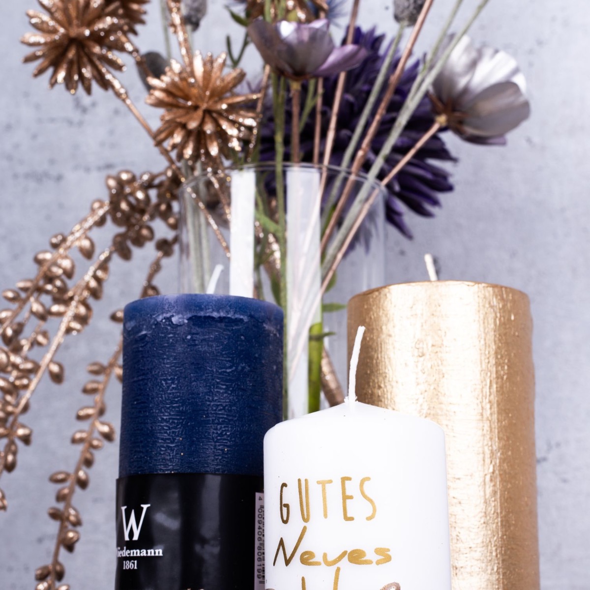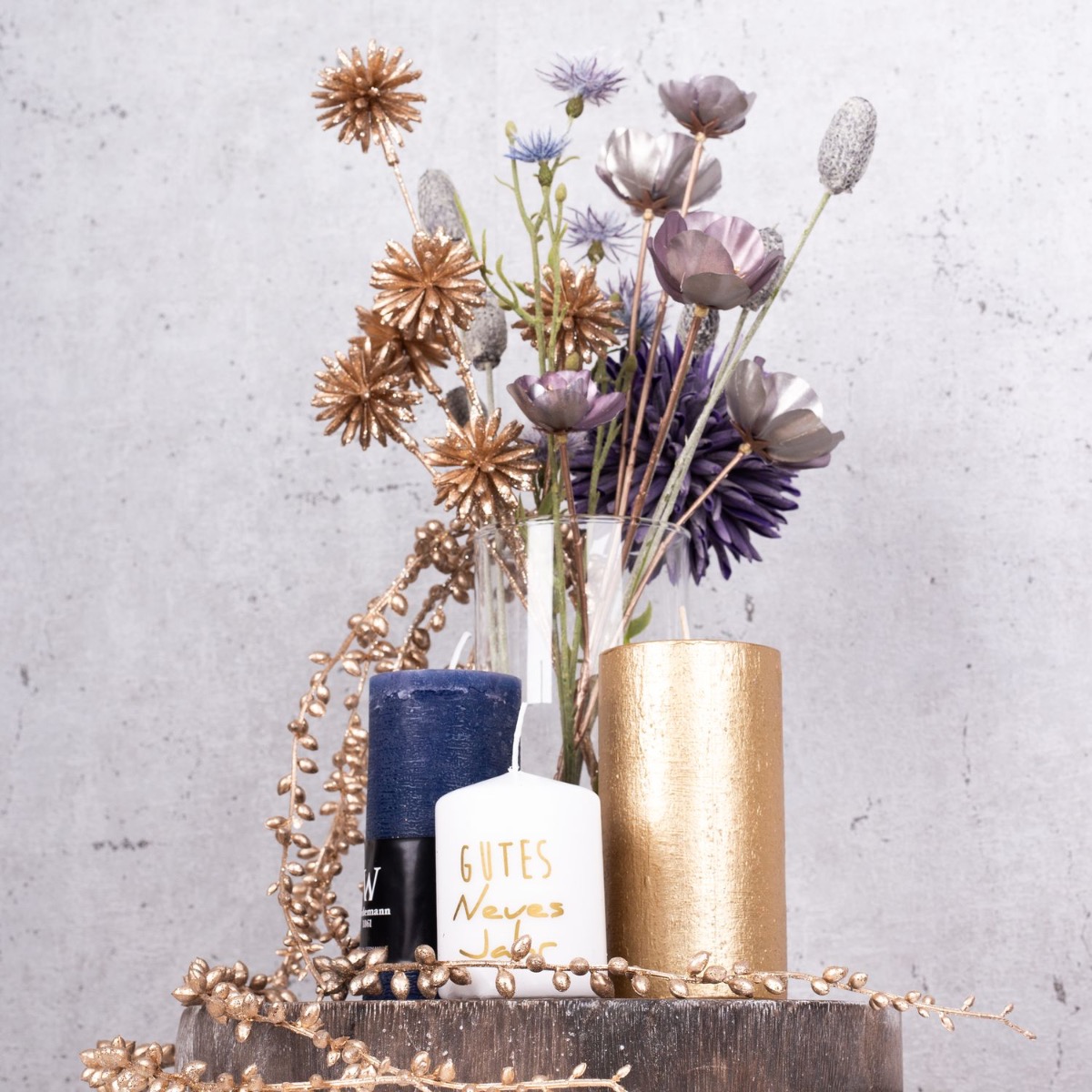 Consiglio di design: Tagliare i fiori a misura di vaso e posizionarli nel vaso. Il ciondolo di senecio dorato deve serpeggiare verso il basso e giocare intorno alle candele. Posizionare le candele in modo che la fiamma non sia troppo vicina ai fiori artificiali.