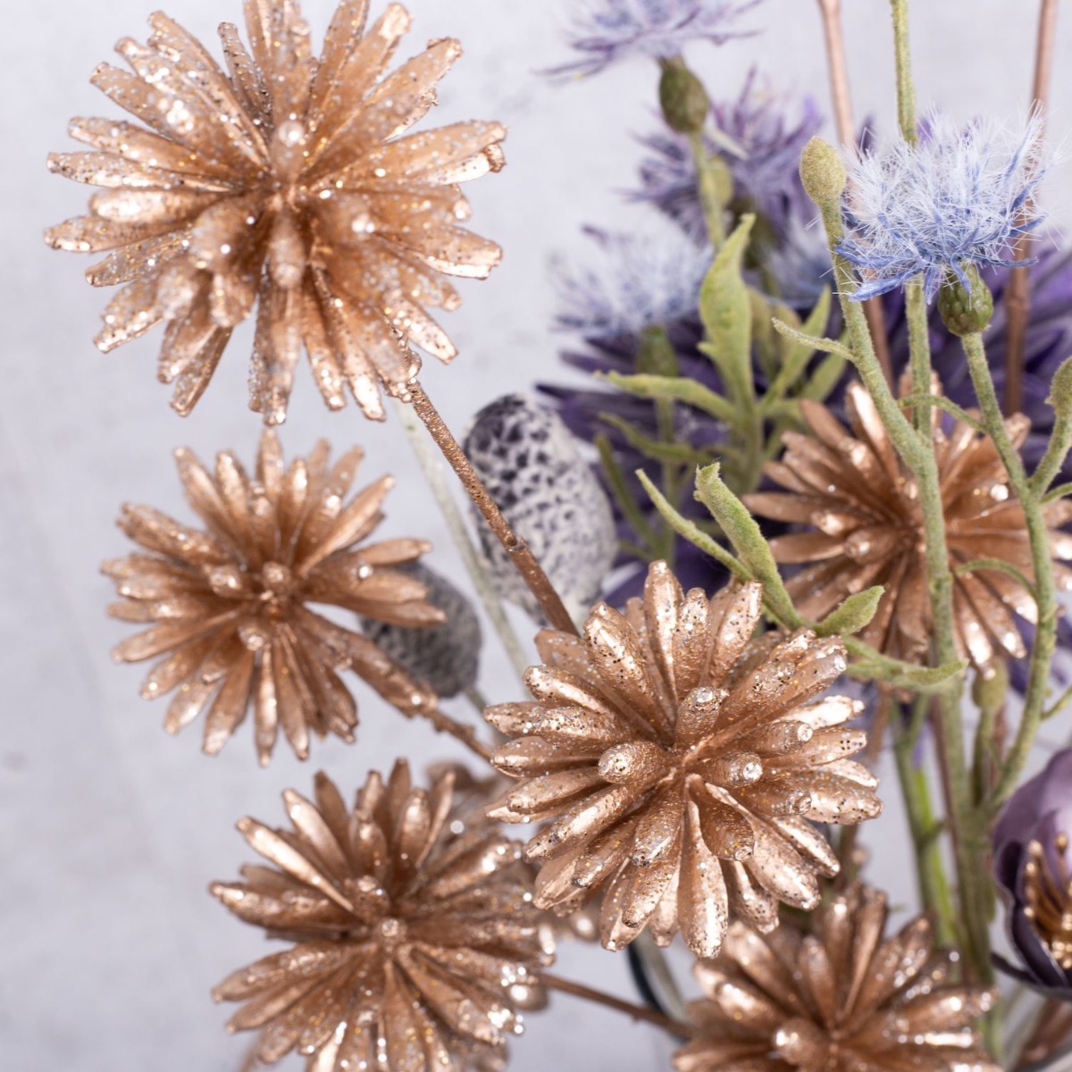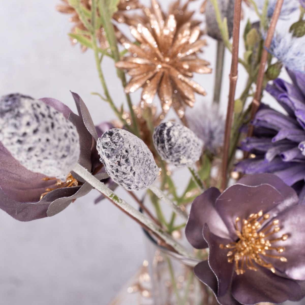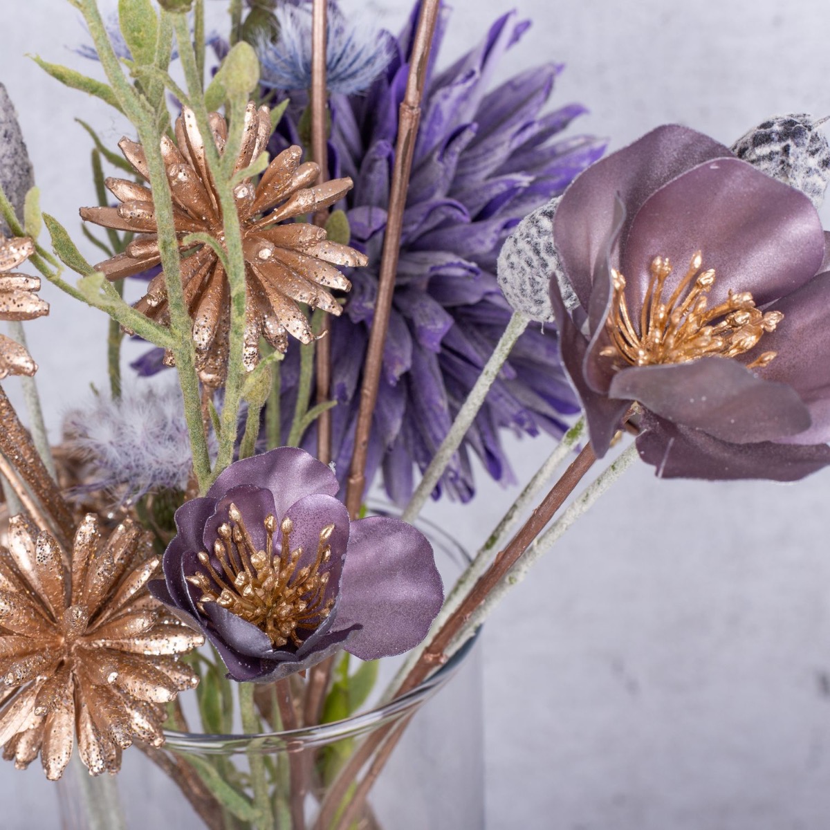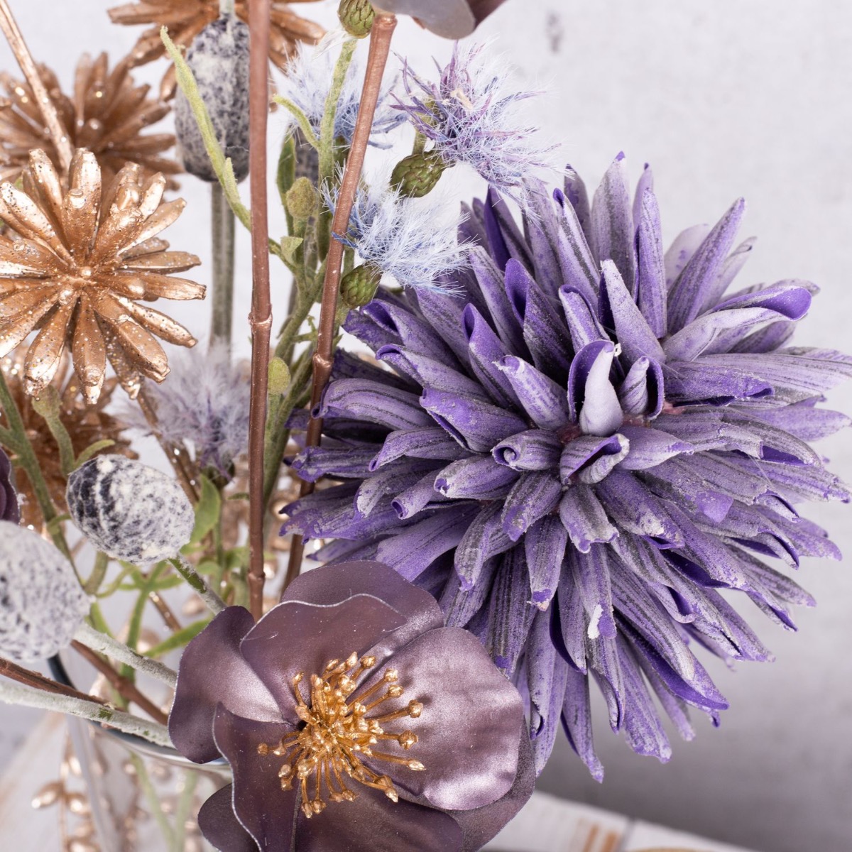 Un fuoco d'artificio d'oro e viola! Un piccolo bouquet di fiori d'argento e d'oro, alto quanto basta per poter parlare con la persona di fronte a voi, è la decorazione da tavolo perfetta per una festa di Capodanno. Diverse candele che si abbinano al colore del bouquet fanno parte di ogni buona festa di Capodanno. I fiordalisi dorati e le rose di Natale viola-argento brillano meravigliosamente alla luce delle candele. Vi faranno entrare nell'atmosfera giusta. Acquista il look!