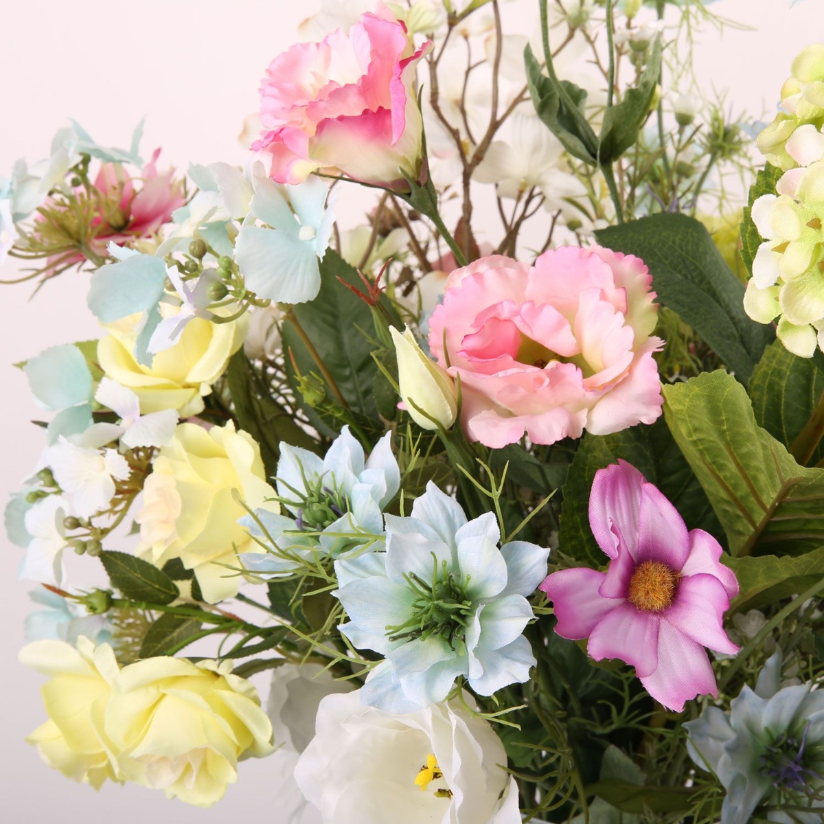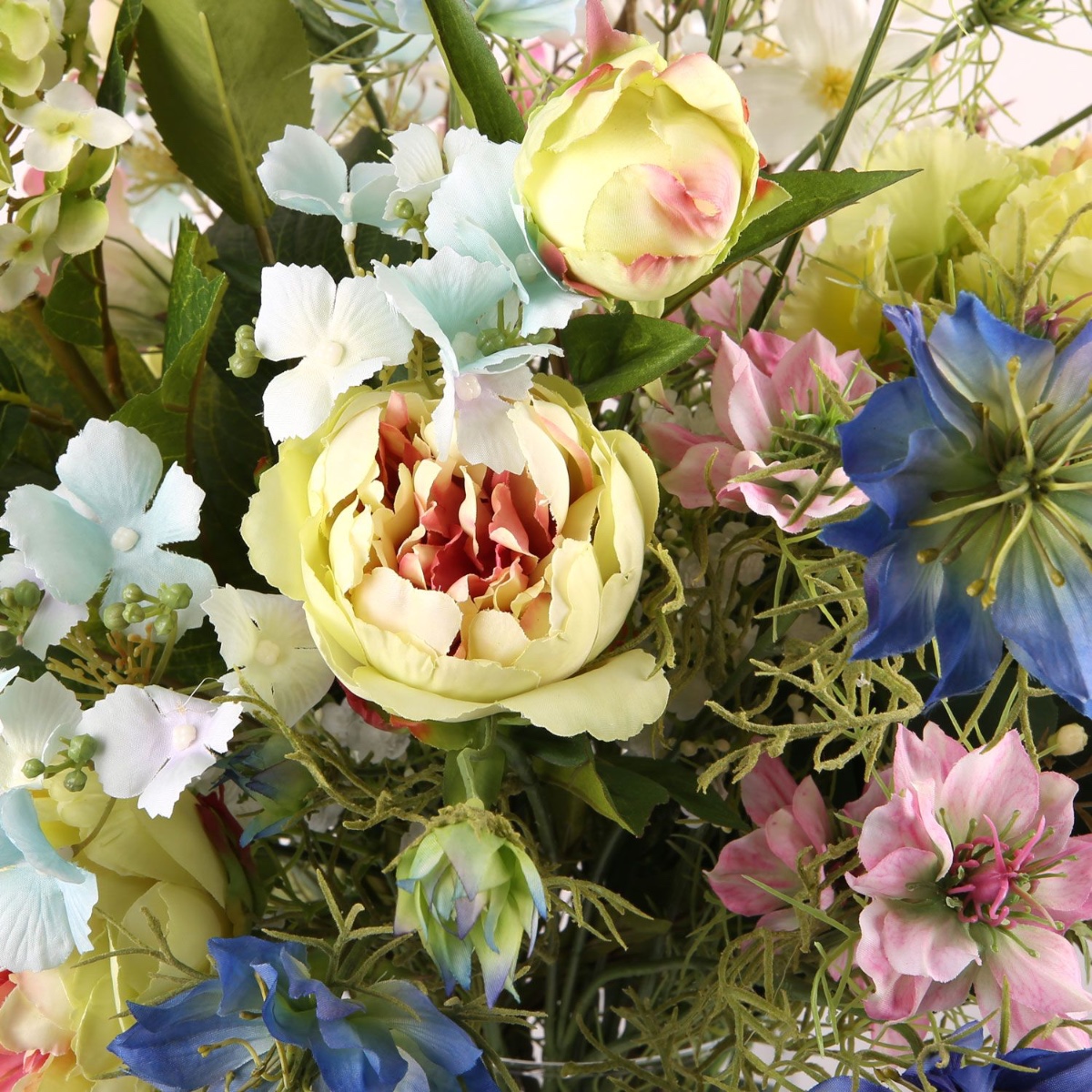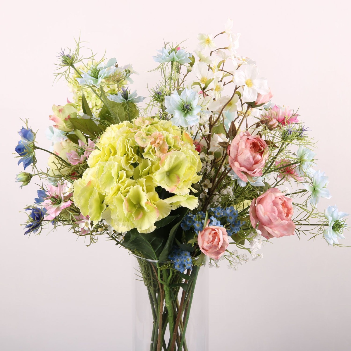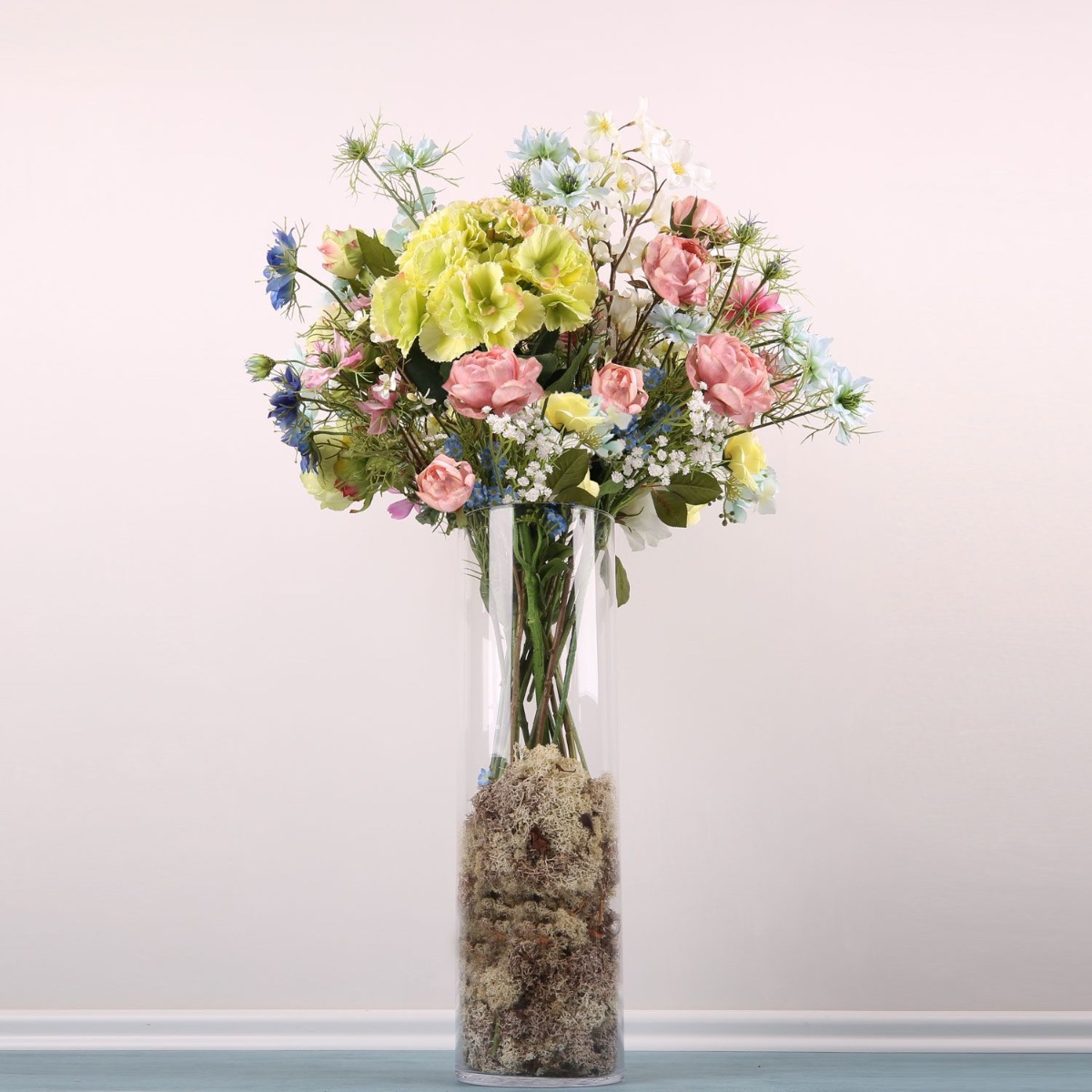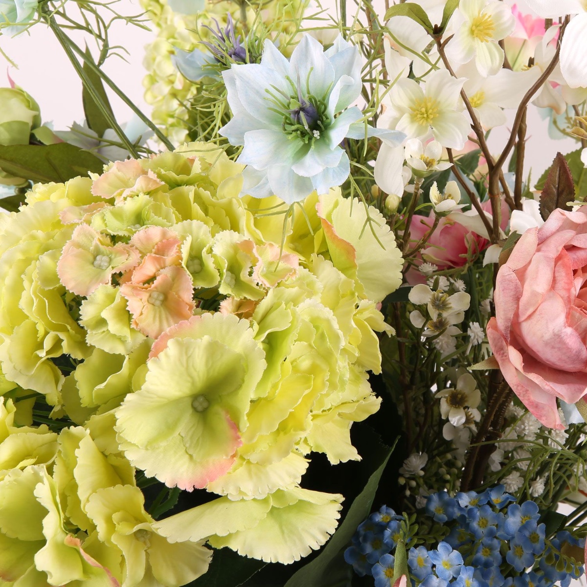 Rosa, giallo e blu! Anne ci ha scritto: Ho un vaso di vetro trasparente sul pavimento che vorrei decorare. Tuttavia, è piuttosto grande: il diametro interno in alto è di circa 16 cm e l'altezza è di circa 50 cm. Vorrei metterci dentro un mix di fiori del mio bouquet da sposa civile e di quello della chiesa. Non potrebbe essere più facile. La nostra Silke ha avuto subito una grande idea su come decorare questo grande vaso con i fiori desiderati, utilizzando il muschio islandese come rialzo per gli steli. E, come previsto, Anne ne è stata immediatamente entusiasta. Ci auguriamo che questo bouquet possa illuminare la sua casa per molto tempo. I colori e le forme delicate dei fiori di questo bouquet offrono all'osservatore una visione fiabesca che invita a sognare. Il cumino nero, le rose, il lisianthus e gli altri fiori sembrano usciti direttamente dalla Bella Addormentata. La delicata ortensia verde è la regina di questo bouquet.Acquista il look!