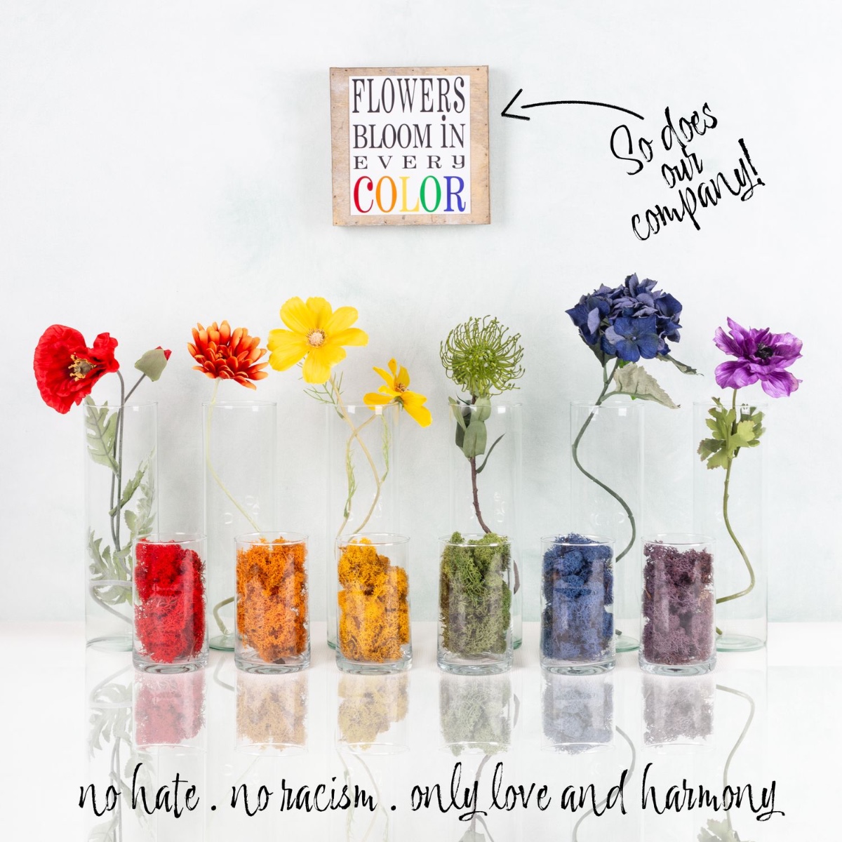 Nei colori dell'arcobaleno: variegati come il nostro team! Il nostro mondo è colorato e questo si riflette non solo nella nostra gamma variopinta, ma anche nelle persone che lavorano dietro artplants. Per noi la diversità è qualcosa di naturale, indipendentemente dall'origine, dall'amore o dalla fede. I colori vivaci dei fiori si armonizzano perfettamente con il vetro riempito di muschio in primo piano e dimostrano che la bellezza nasce dall'incontro tra colori e persone. Acquista il look!