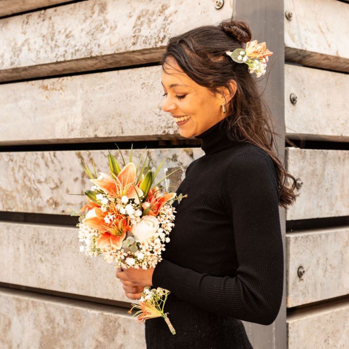 Arancione e bianco! I gigli arancioni della serie EMIKO non potevano mancare nel bouquet da sposa di Tamara. Questi fiori tessili luminosi non sono solo belli, ma hanno anche un significato appropriato per un matrimonio. Il fiore del giglio arancione simboleggia la passione, la felicità e la gioia. Inoltre, hanno una fioritura affascinante che rende elegante ogni bouquet. Il nostro team creativo ha realizzato anche i gioielli per capelli abbinati, sotto forma di cerchietti per Tamara e la sua damigella d'onore, nonché una spilla abbinata per l'uomo. Una combinazione perfetta per questa occasione speciale. Acquista il look!