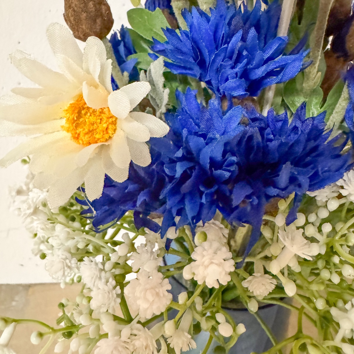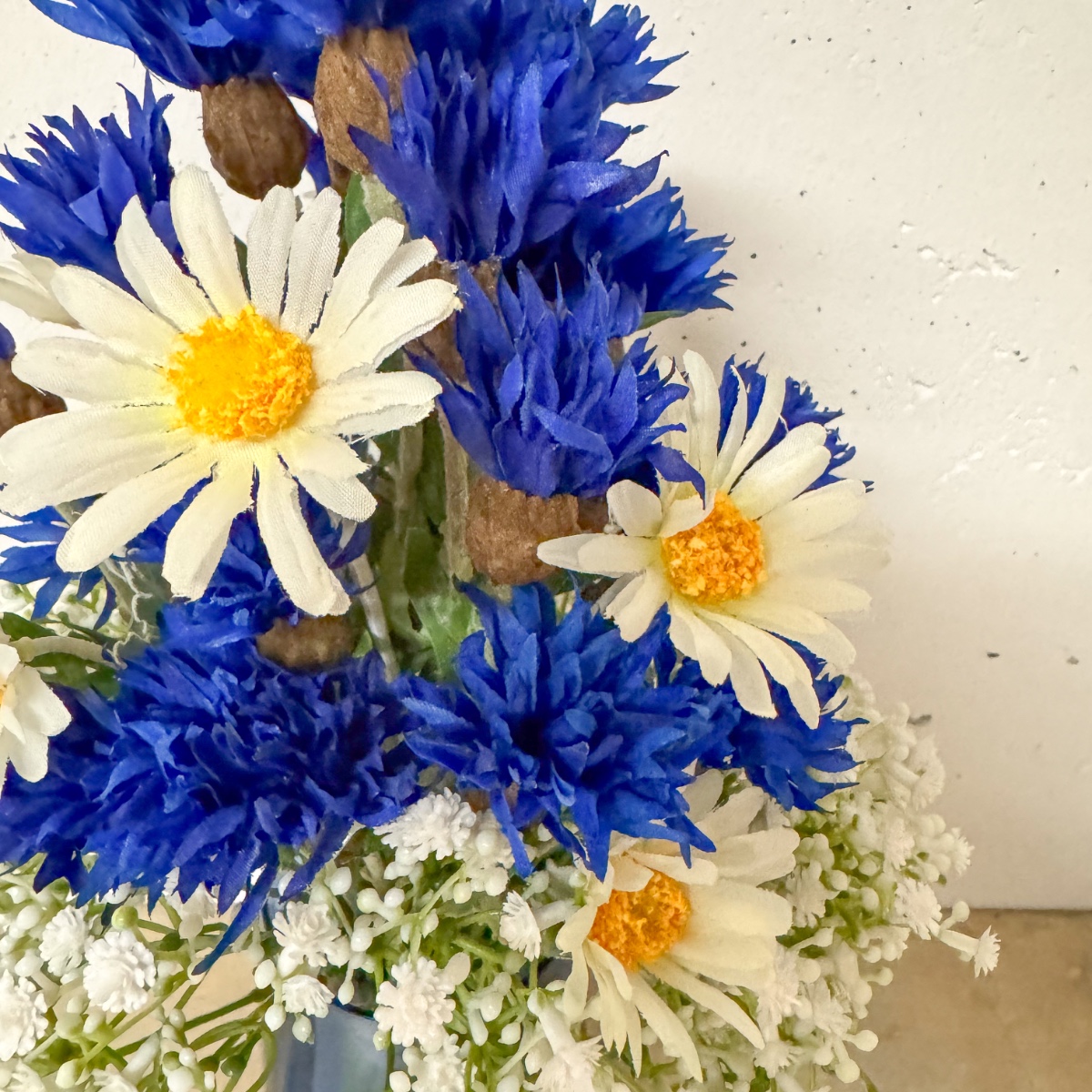 Bridal Love! Ecco come si presenta un bouquet bavarese. Come sorpresa, ci è stato chiesto di ricreare con fiori artificiali il bouquet della sposa, che purtroppo nel frattempo era appassito. Fiordalisi blu brillante, delicate margherite e gypsophila decorano questo bouquet piramidale e aggiungono un tocco di romanticismo alla festa. Il velo da sposa simboleggia l'amore sincero. Le margherite rappresentano la fedeltà e i fiordalisi indicano un futuro positivo. Un cordoncino di iuta marrone sottolinea l'aspetto rustico. Shop the Look!