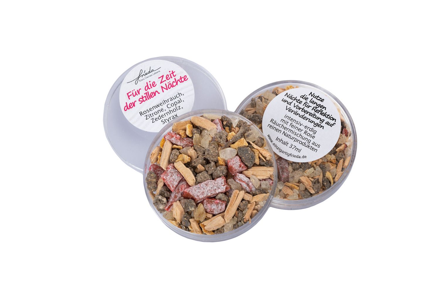 La miscela d'incenso può essere utilizzata su un bruciatore d'incenso con una piccola candela o su carboncini d'incenso in un bruciatore d'incenso. Se si utilizza un bruciatore di incenso, la miscela di incenso viene posta sul setaccio; è consigliabile mettere un pezzo di foglio di alluminio sul setaccio, in modo che i componenti oleosi non colino nella fiamma e le erbe non brucino troppo rapidamente. Un altro vantaggio è che il foglio di alluminio impedisce al setaccio di attaccarsi e quindi non deve essere pulito. Il calore dell'accendino riscalda l'incenso che inizia a profumare. Quando si utilizza un bruciatore d'incenso, si mette prima la sabbia nella ciotola come isolante termico e poi si mette il carbone d'incenso / le tavolette di carbone sopra. Si accende la carbonella e si attende fino a quando la carbonella non si è incendiata. Solo a questo punto la miscela di incenso viene posta sul carbone, che immediatamente si illumina ed evapora, rilasciando il profumo della miscela. Con questo metodo, tuttavia, non è possibile influenzare la velocità di combustione degli ingredienti. A seconda della miscela di incenso, si deve decidere in anticipo quale sia il metodo migliore. È importante utilizzare una base ignifuga per entrambi i metodi di applicazione e non lasciarla mai incustodita.