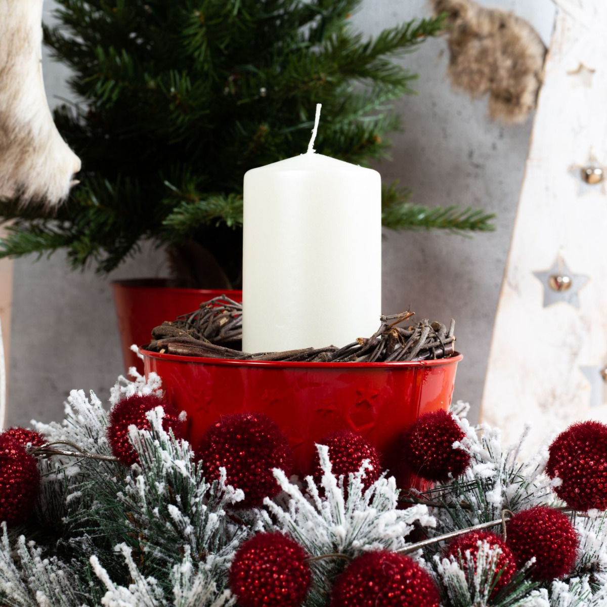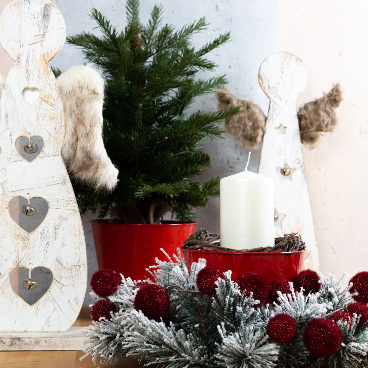 Un periodo contemplativo con gli angeli! Tutti vestiti di bianco con ali in pelliccia sintetica e campanellini, gli angeli annunciano l'inizio dell'Avvento. La ghirlanda di pino innevata è decorata con rami di Gomphocarpus rossi. I vasi di zinco rossi con stelle incise contribuiscono a creare un insieme armonioso e danno al pioppo l'appoggio necessario. Viene proprio voglia di Natale! Acquista il look!