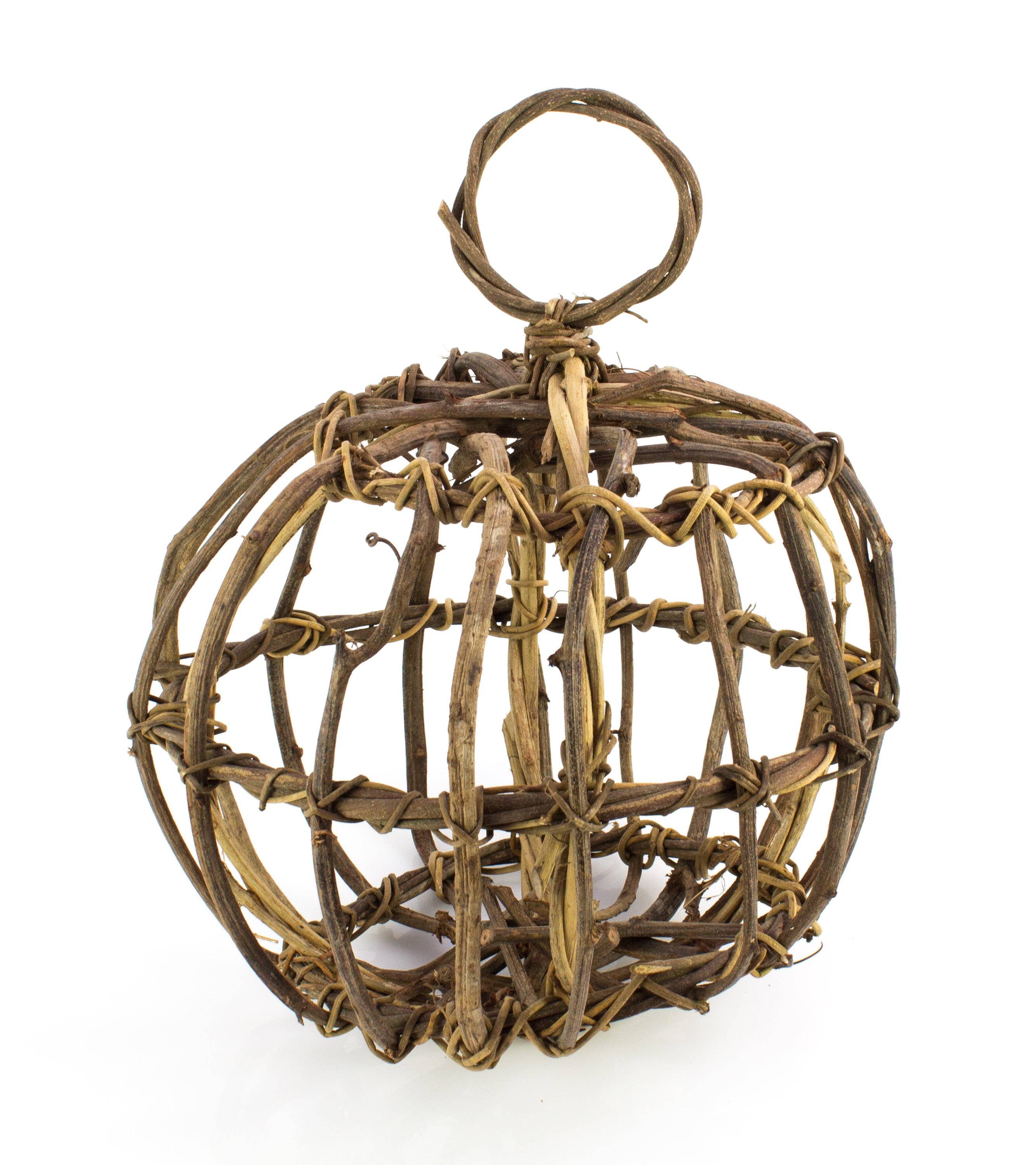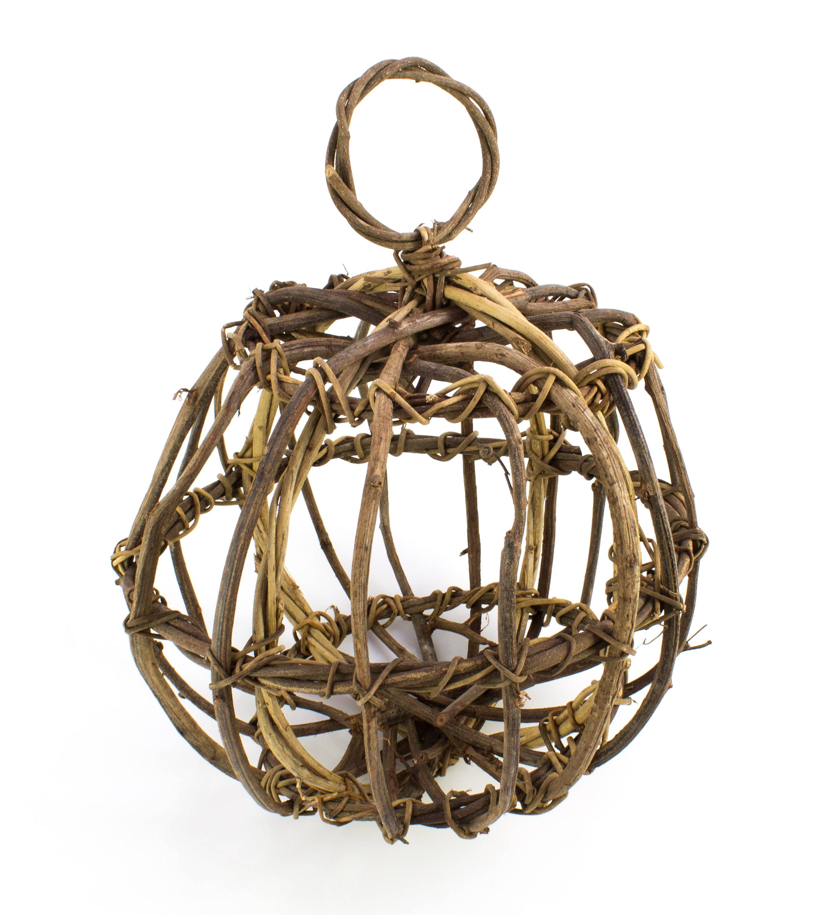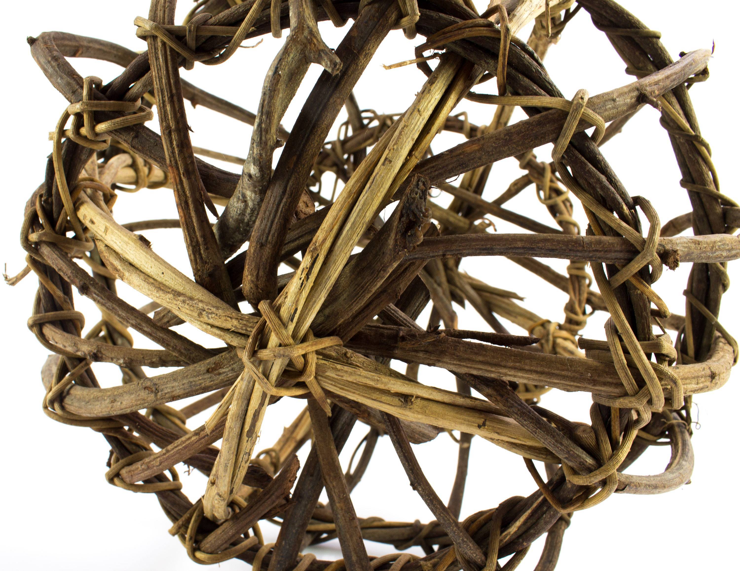 Tralci di vite selvatica essiccati legati strettamente ad una palla decorativa. La palla ha un diametro esterno di ca. 35 cm. I rami naturali fungono da decorazione pendente trasparente e filigrana allo stesso tempo.